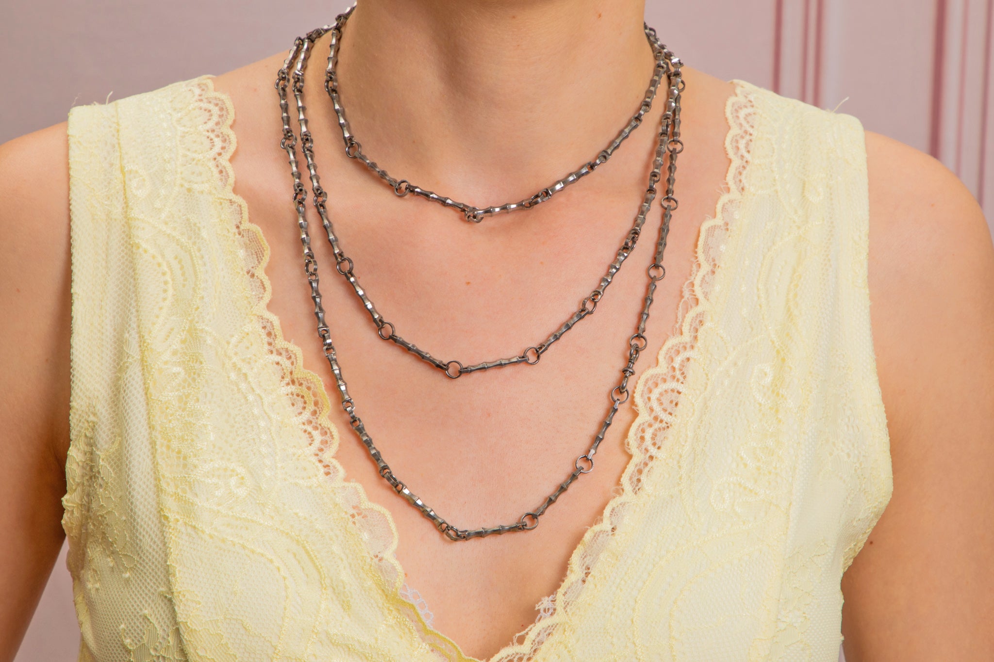 Every inch of her design is unique and incredibly hard to come by nowadays. Composed of a link style we have never seen before, akin to bamboo, each Steel link is joined by super rare sliced steel split ring connectors, and with 54.5 inches of her, you can soak up her antique beauty wrapped around multiple times.