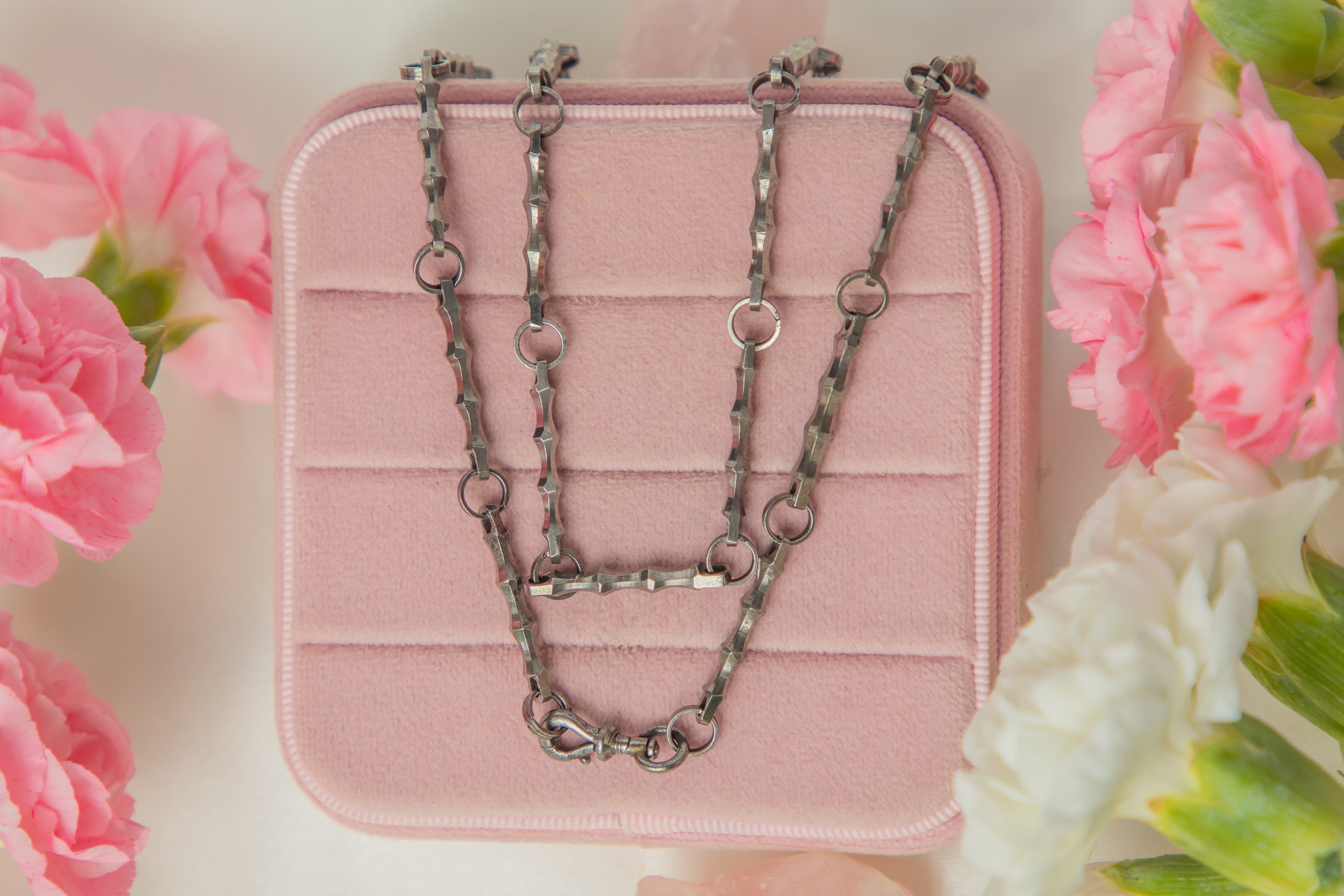 With a stunning gunmetal tone, this exquisite piece of antique jewellery will add a touch of punk and Gothic glamour to your jewellery wardrobe. The faceted links catch the light perfectly, making her radiance and beauty shine without interruption.