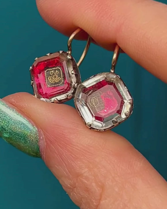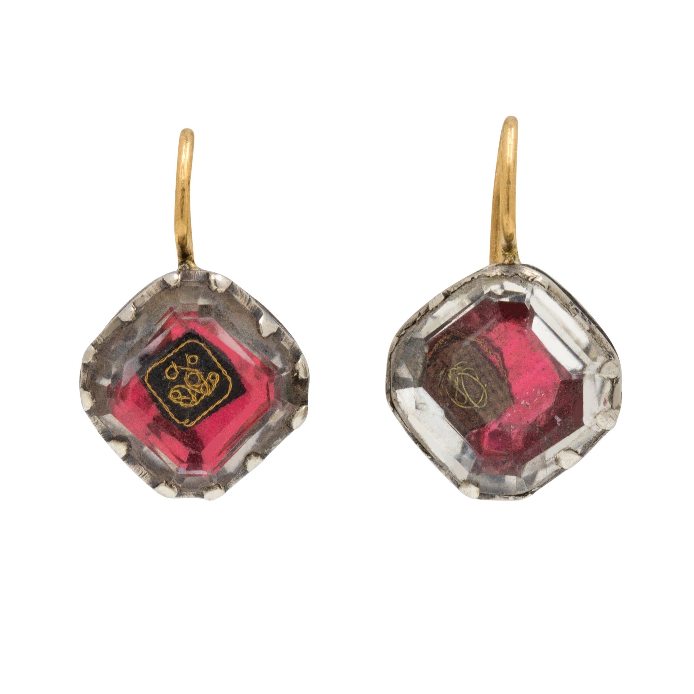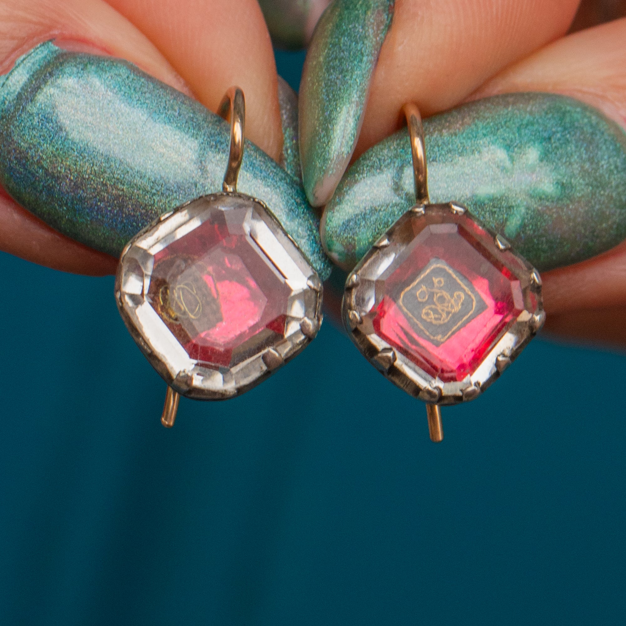 This highly collectible pair of earrings were likely made c.1700, to silently support the legacy of King Charles I after his beheading. The Stuart Crystal has a cherry red foiling with Gold wire Cipher that makes such pieces so distinct. These antique Stuart Crystal earrings are a wonderful way to connect to a bygone era!