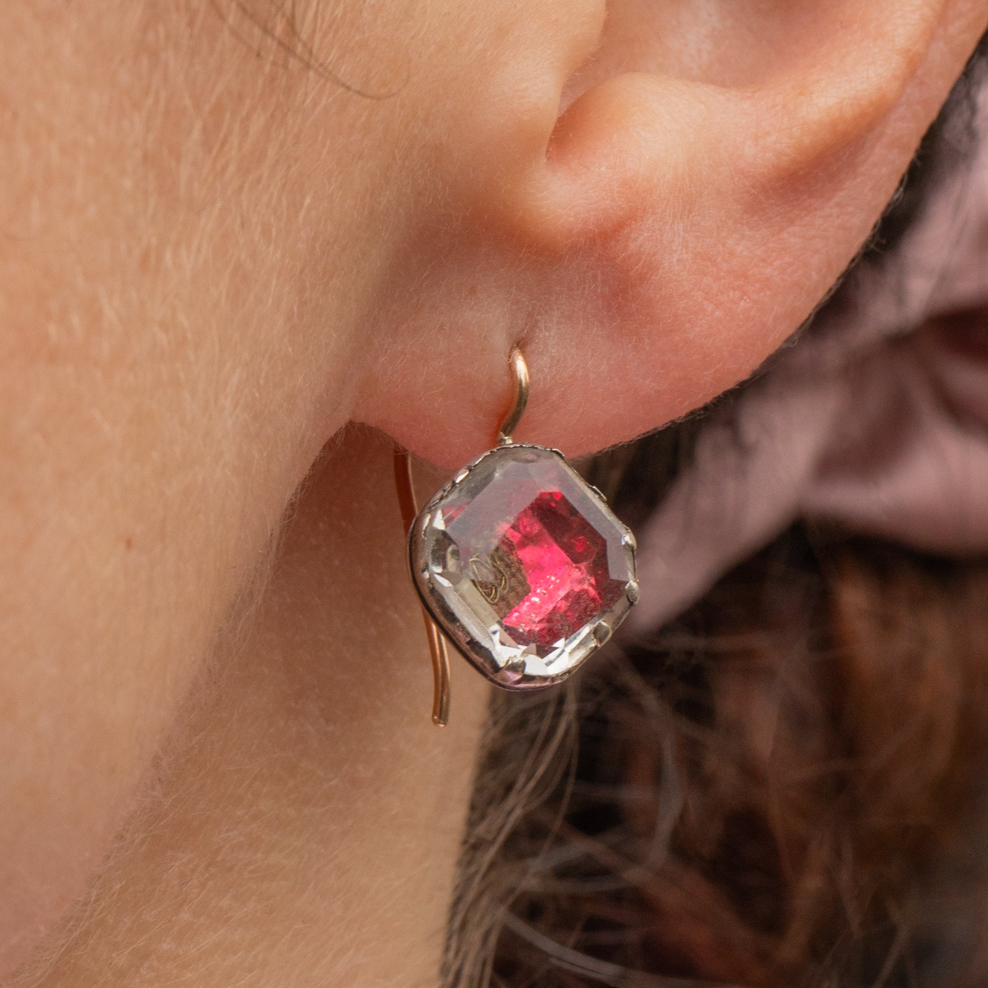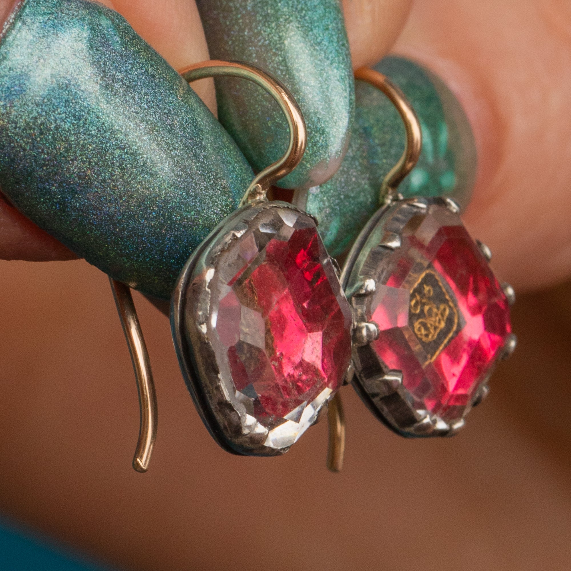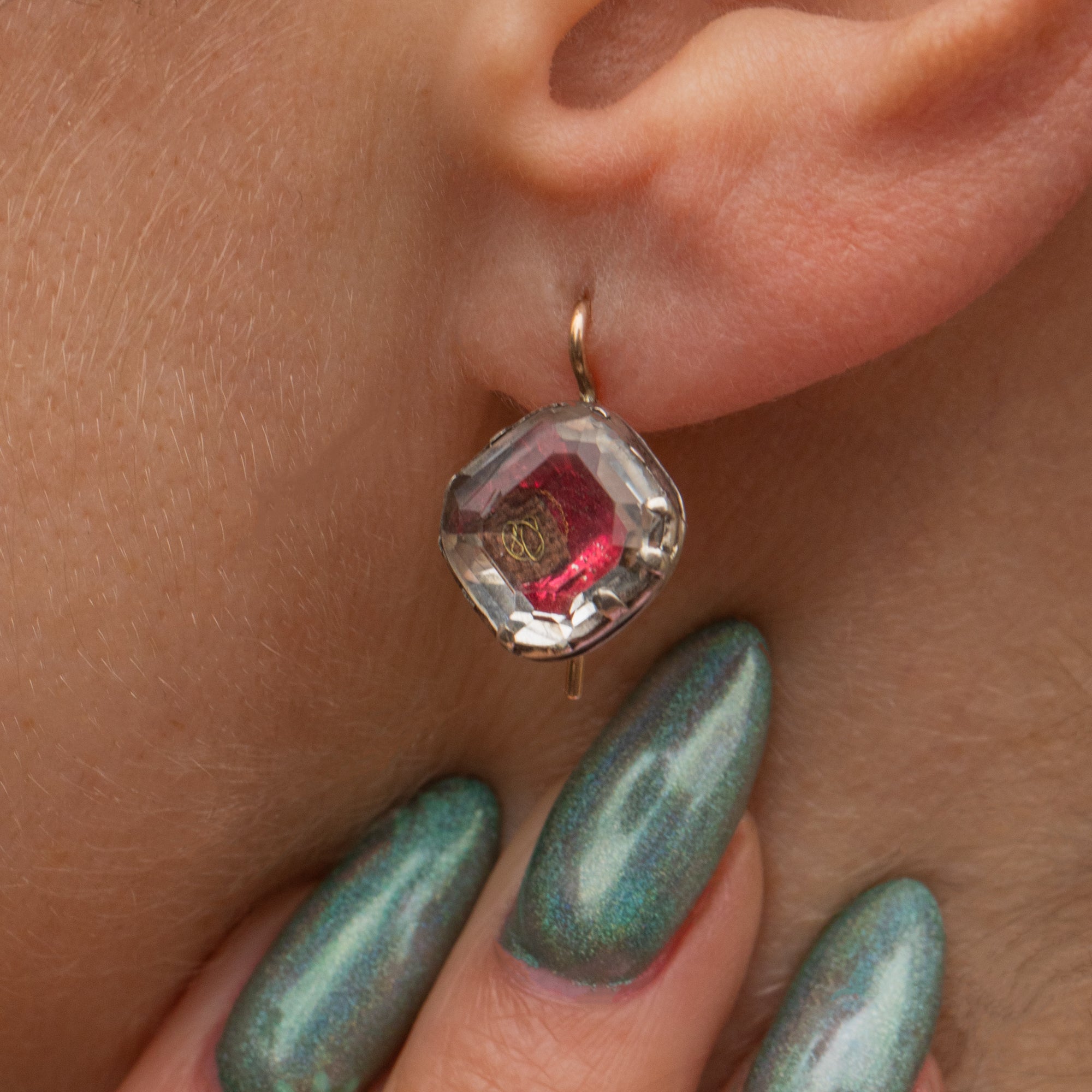 This highly collectible pair of earrings were likely made c.1700, to silently support the legacy of King Charles I after his beheading. The Stuart Crystal has a cherry red foiling with Gold wire Cipher that makes such pieces so distinct. These antique Stuart Crystal earrings are a wonderful way to connect to a bygone era!