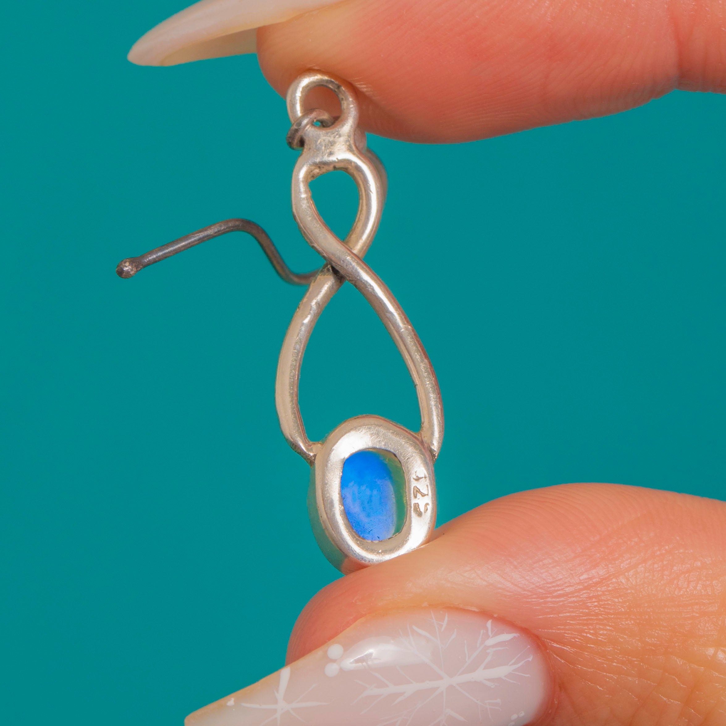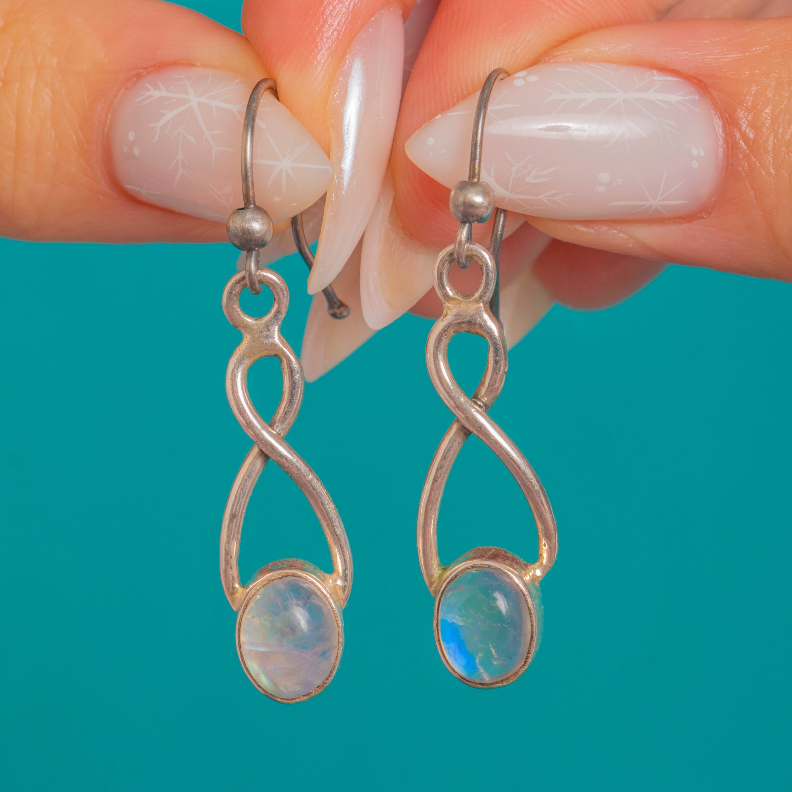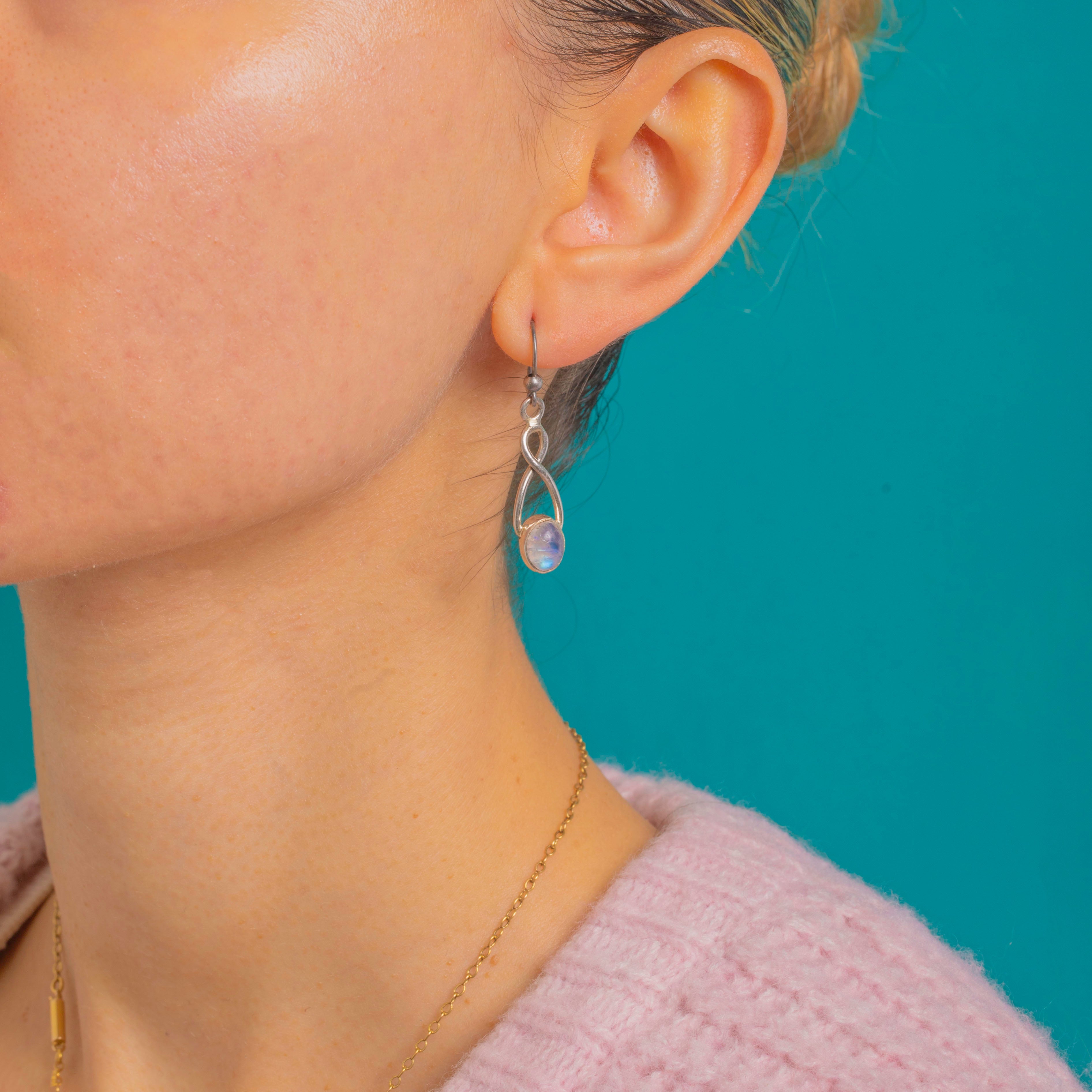 Sleek and luminous, these Vintage Sterling Silver drop earrings marry a flowing infinity/teardrop silhouette with glowing oval Labradorite cabochons. Each stone shows a captivating blue sheen, framed in smooth bezel settings for a refined, minimalist finish.
