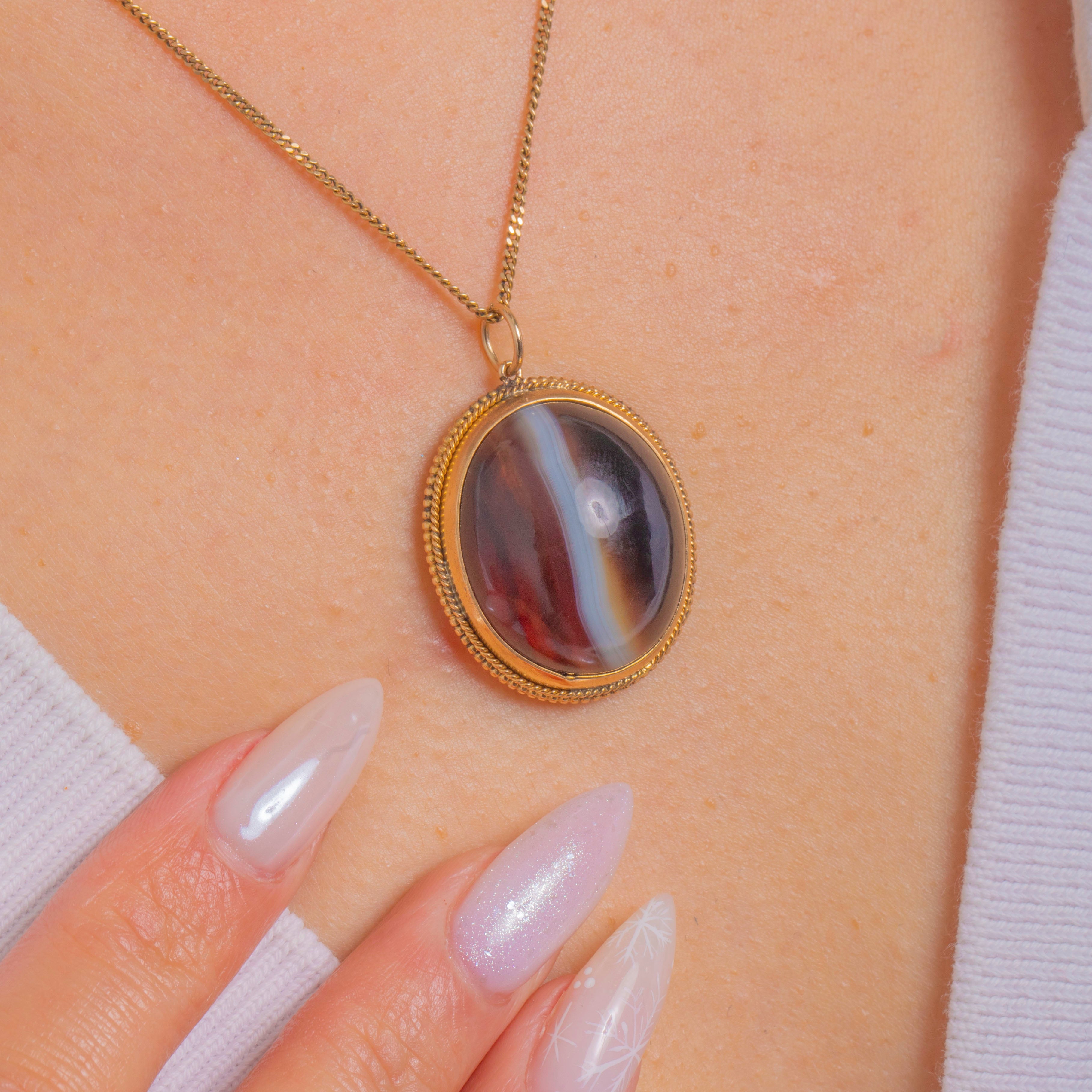 Glowing with earthy elegance, this Victorian banded Agate pendant showcases a superb, high-domed cabochon with striking natural stripes of deep reddish-brown, charcoal black, smoky blue-grey and creamy white. The gem is framed in a smooth closed-back bezel and encircled by a refined rope border that lends a subtle Etruscan-revival flourish.