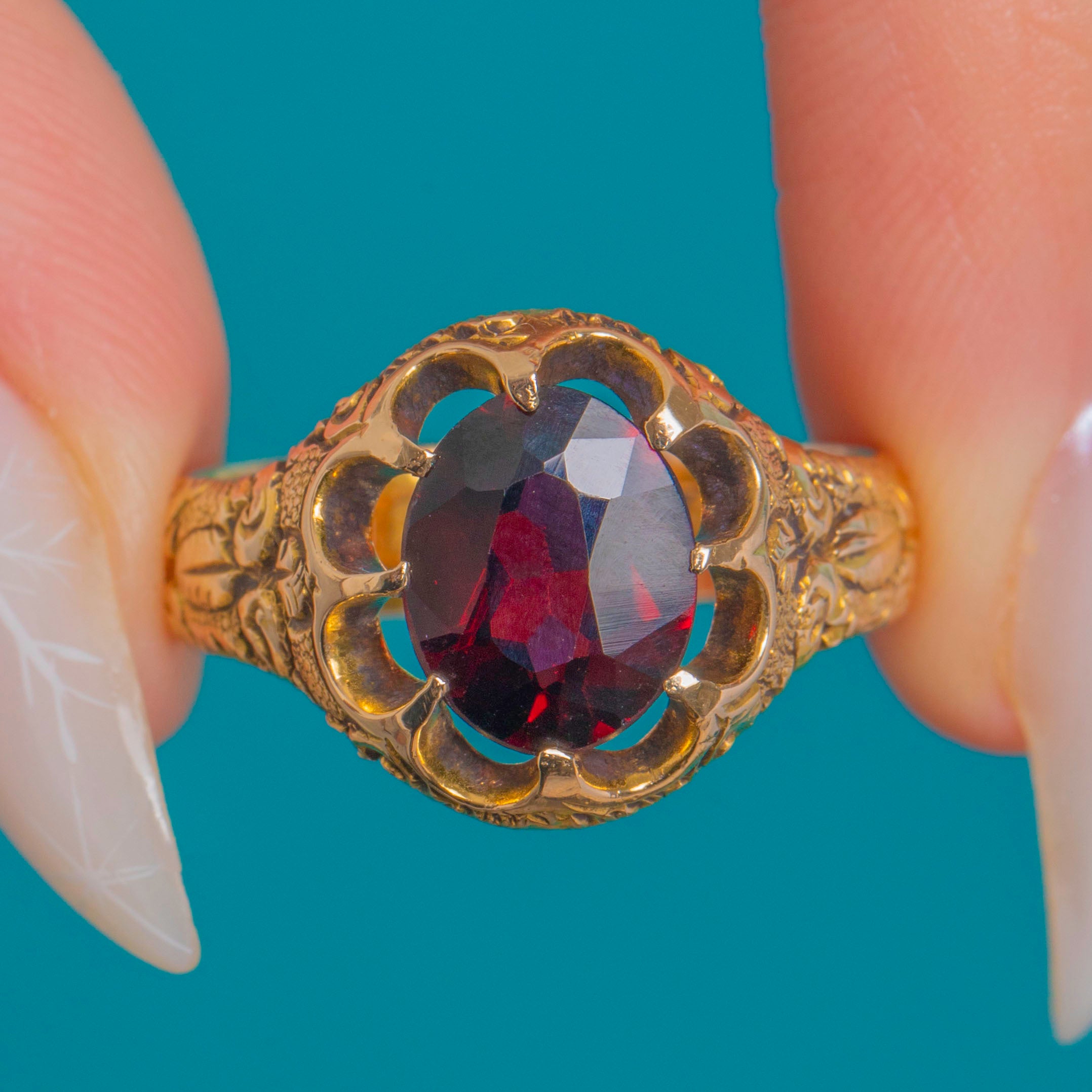 EXCELLENT: The Garnet is bright and crisp, and no obvious chips or cracks. The high coronet setting and chased shoulders are crisp with a bright polish. Claws appear secure with no obvious repairs, and there are no visible resizing marks to the shank.
