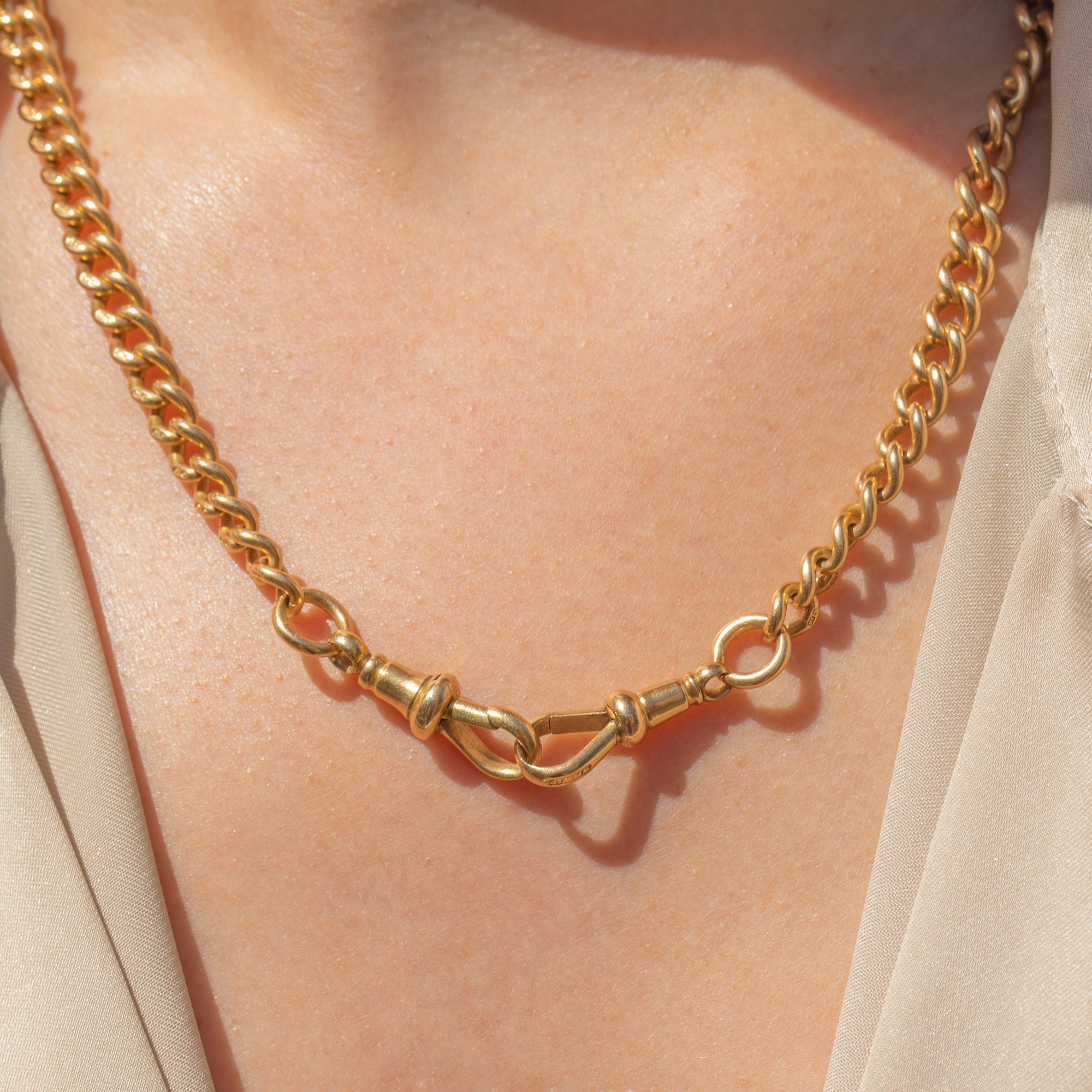 Crafted entirely from solid buttery 18ct Gold, this chunky antique chain weighs in at almost 50 grams and has a lovely glossy sheen throughout. With her interlocking belcher links cascading across your décolletage like liquid Gold, she is sure to impress from every angle!