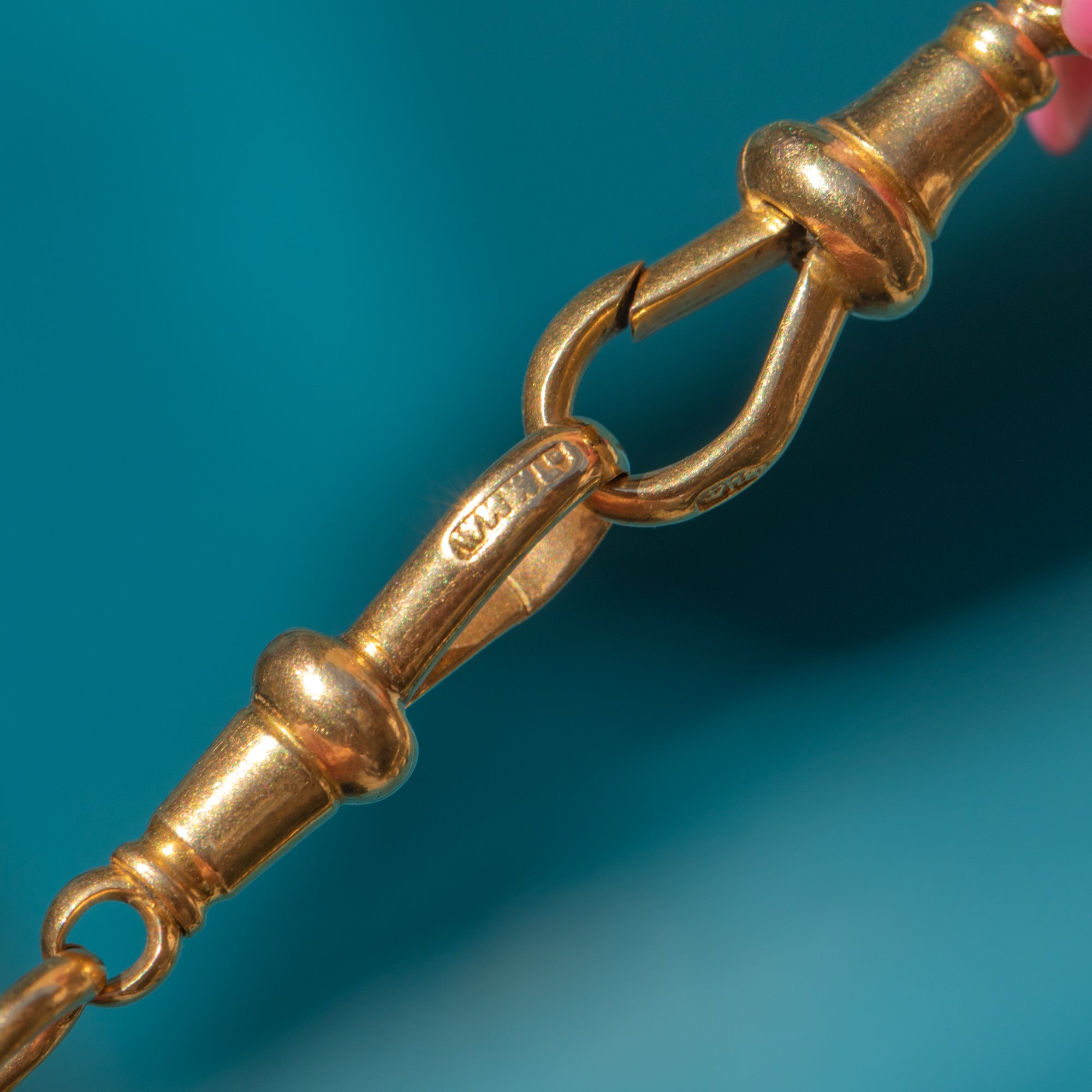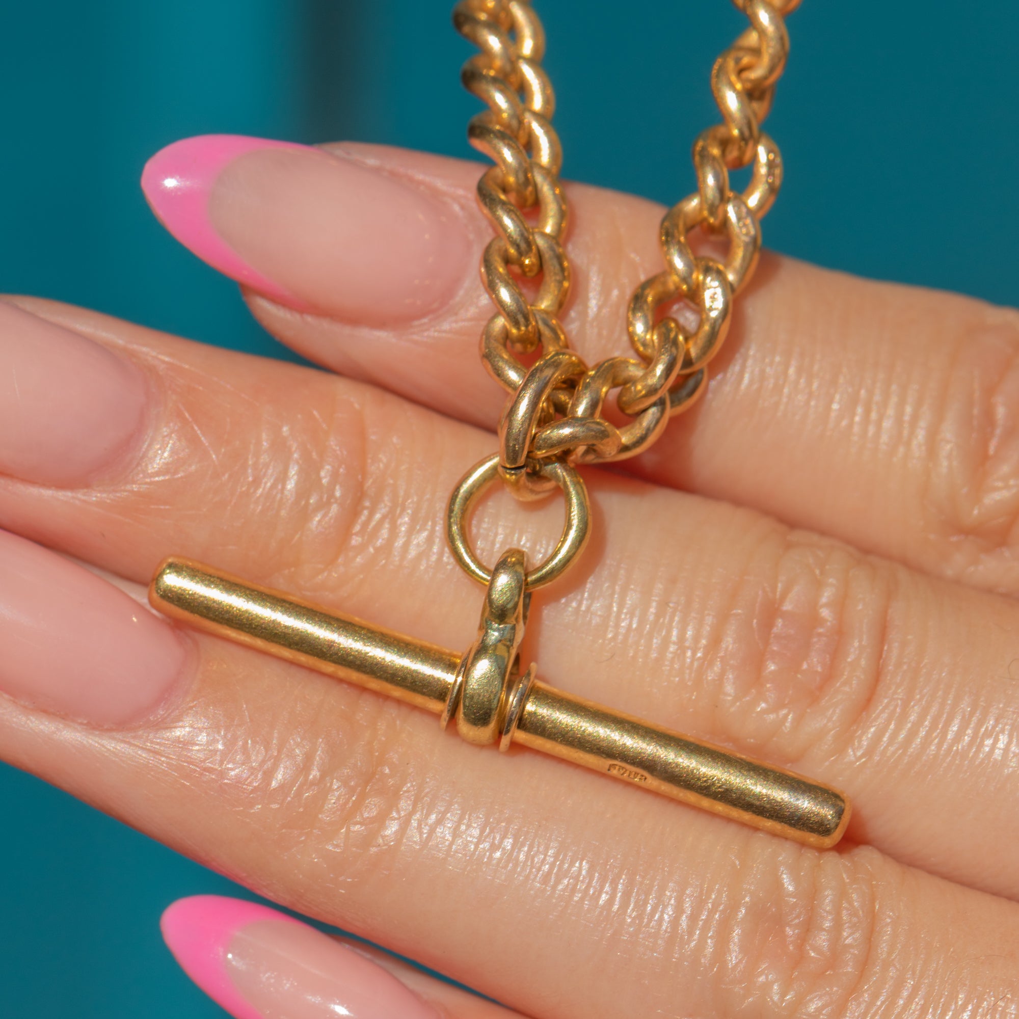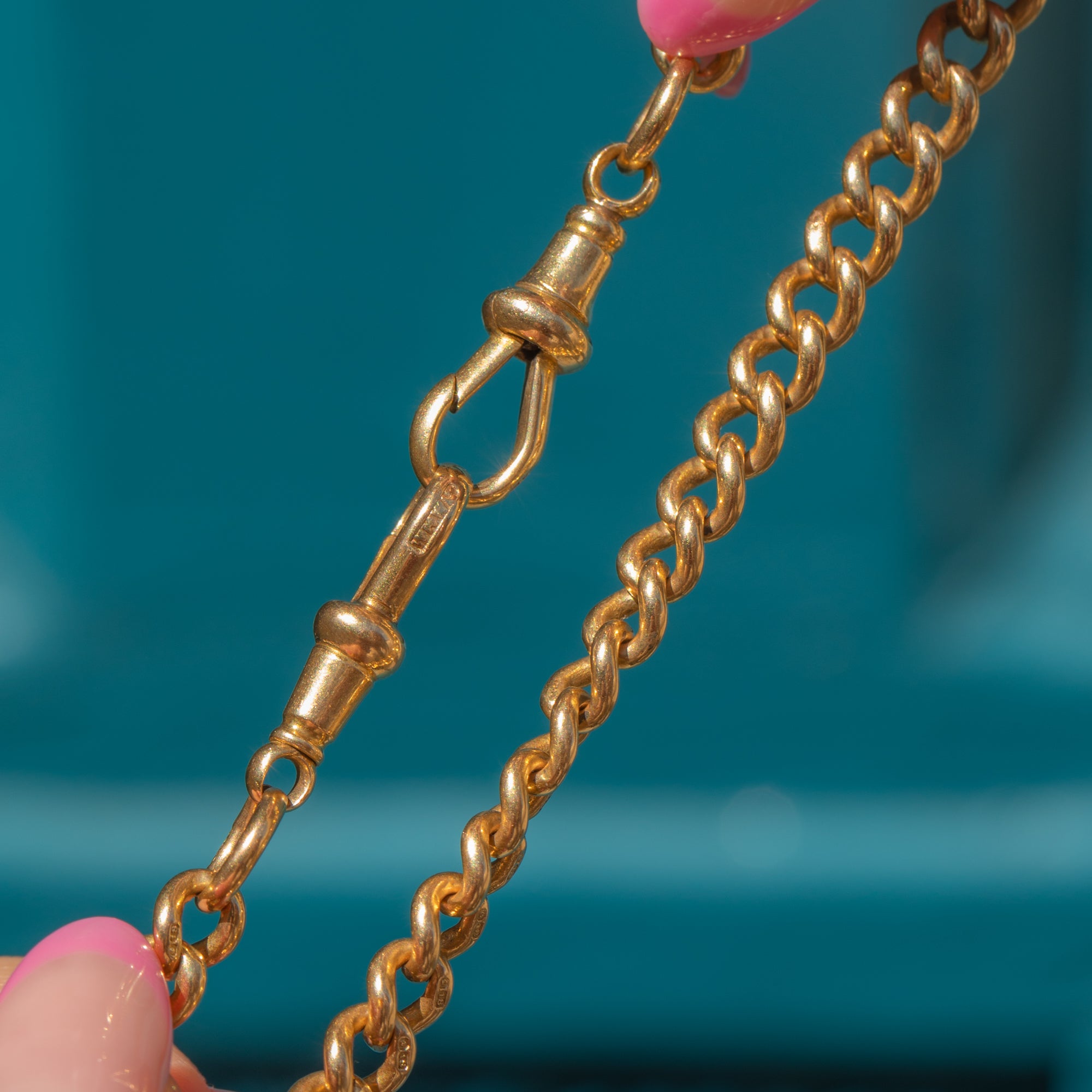 EXCELLENT: This antique 18ct Gold Albert chain is in great condition. The Gold is bright and buttery, and her t-bar is well soldered. Slight wear commensurate with being over 100 years old, but overall, all the links and connections are robust, and will bring another 100 years of enjoyment! A gorgeous piece, this antique chain is a must-have!