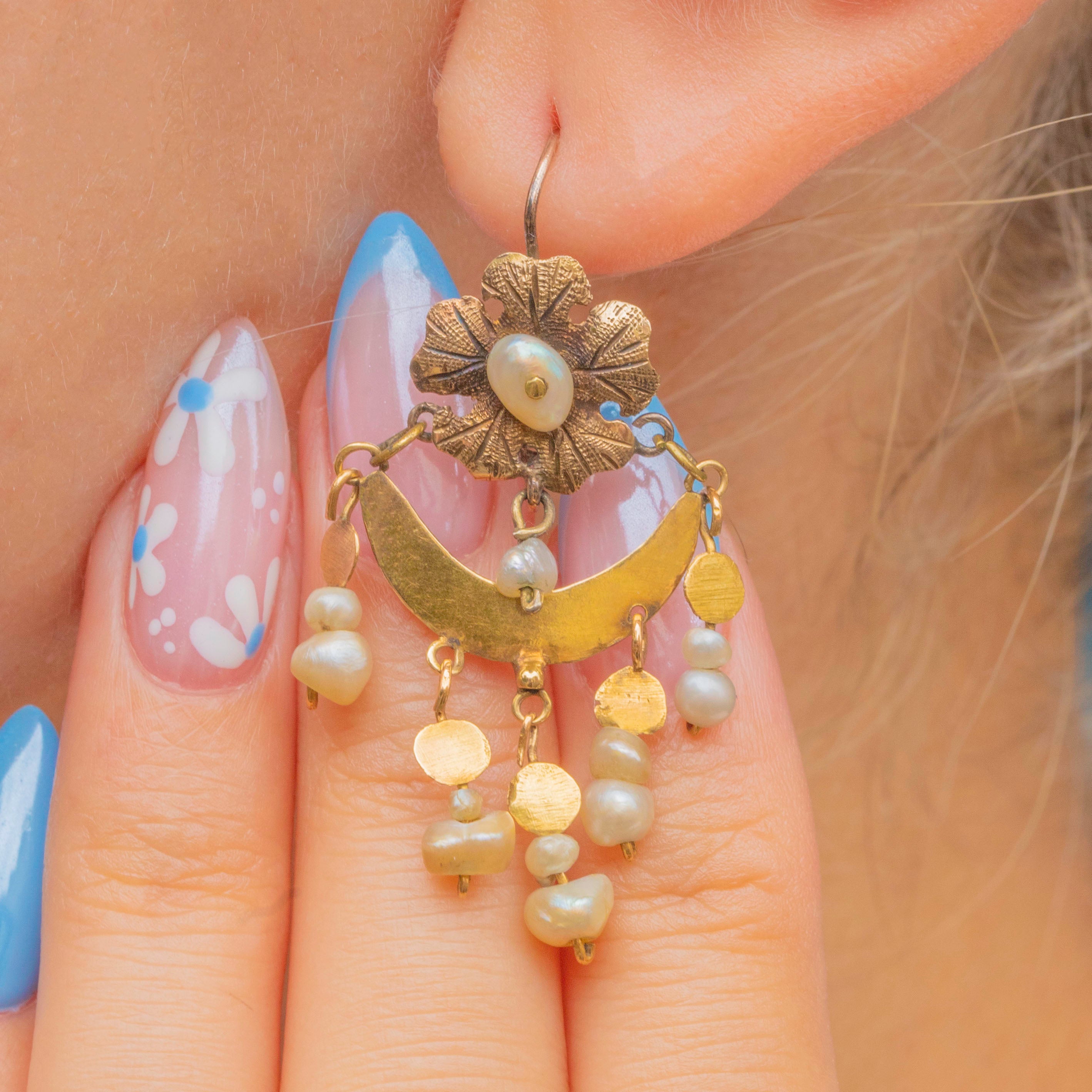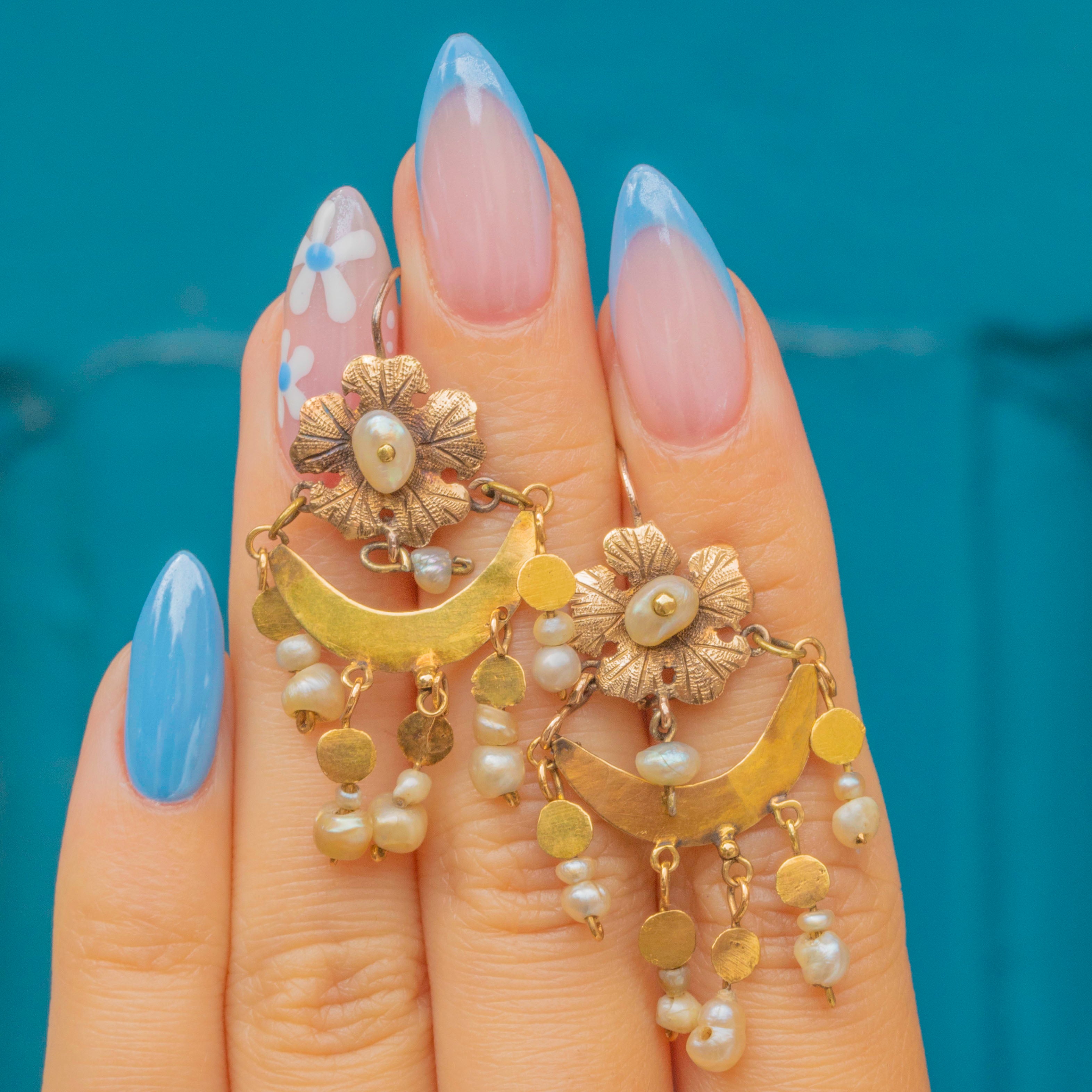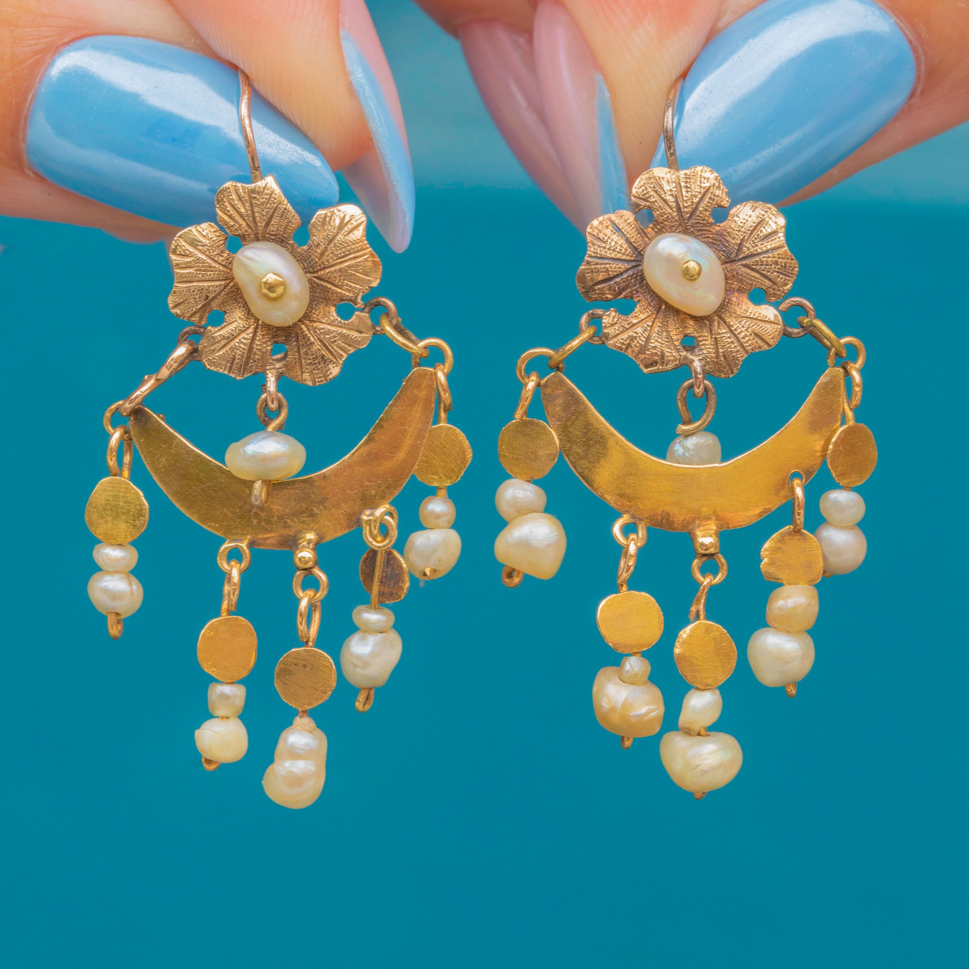 Iberian 9ct Gold Baroque Pearl Floral Chandelier Drop Earrings