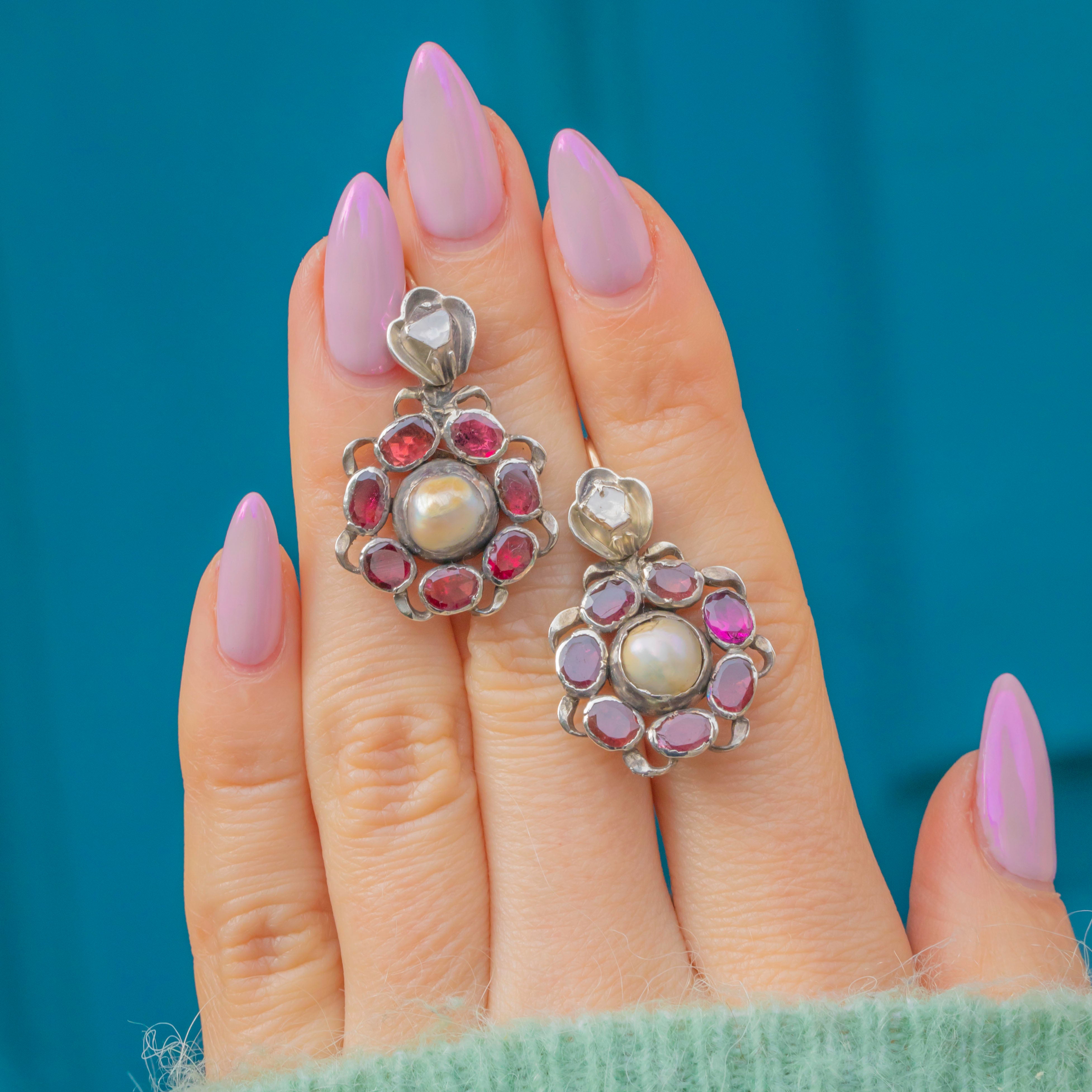 These extraordinary Iberian earrings date to around 1780 and showcase the opulent beauty of late Georgian design. Each earring features a glowing natural 6mm Pearl centre, framed by a halo of richly coloured flat-cut Garnets in closed-back Silver settings. Above, a sparkling Rose-cut Diamond adds a hint of brilliance, completing this rare and historical combination.