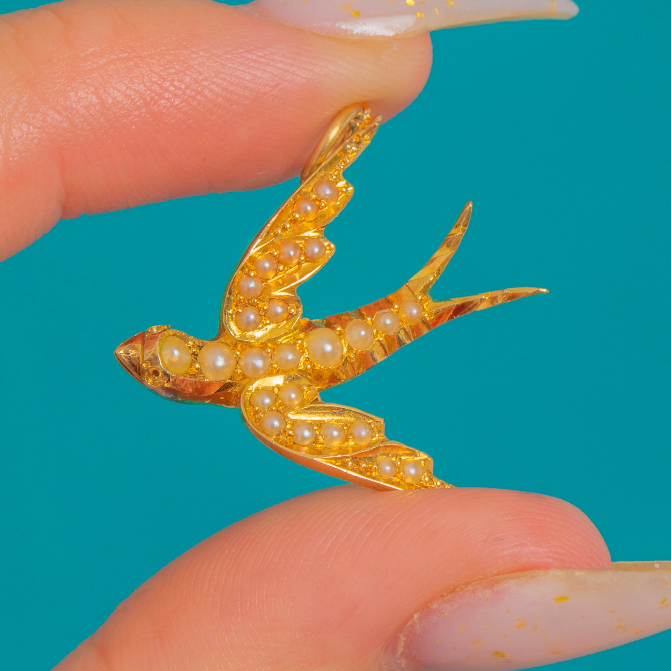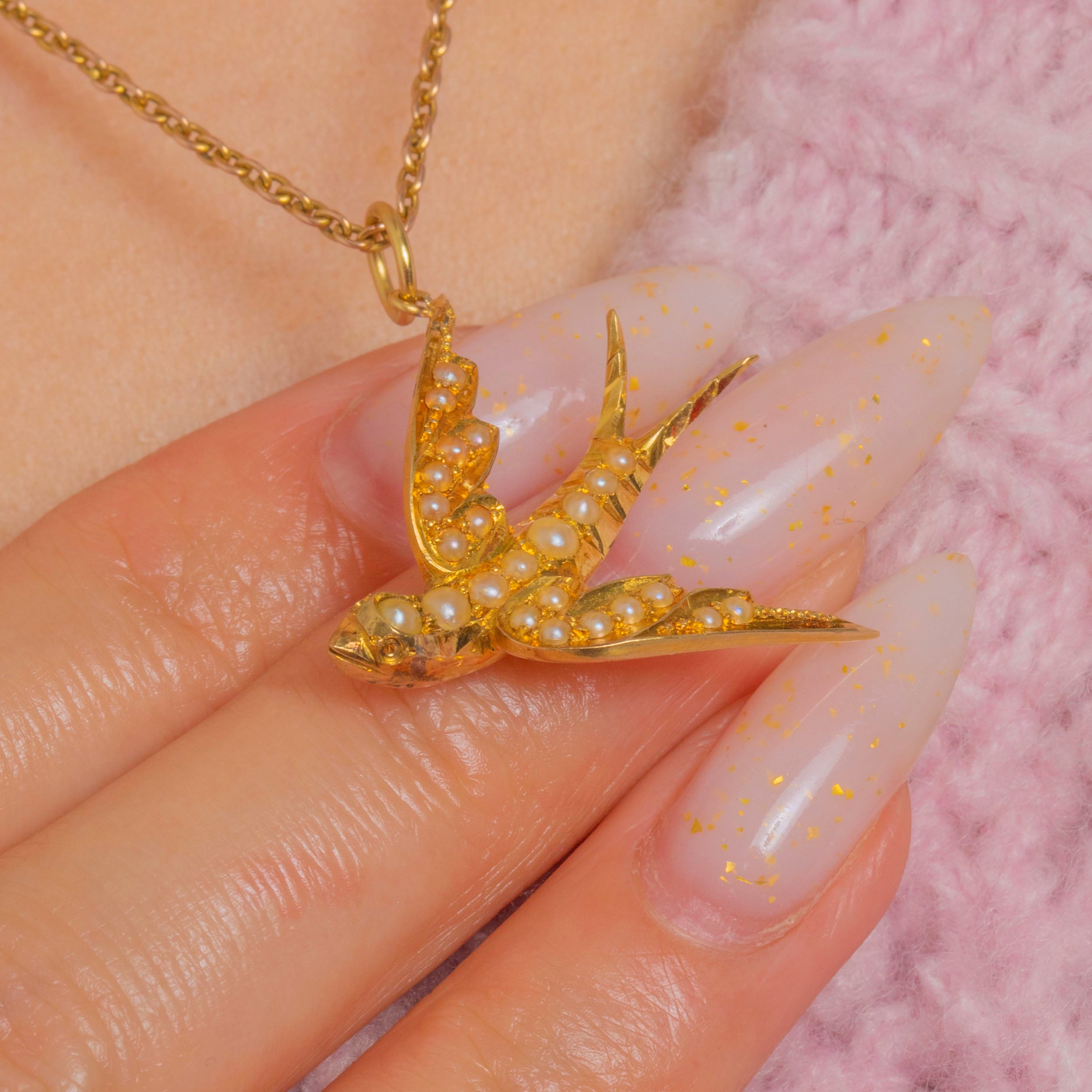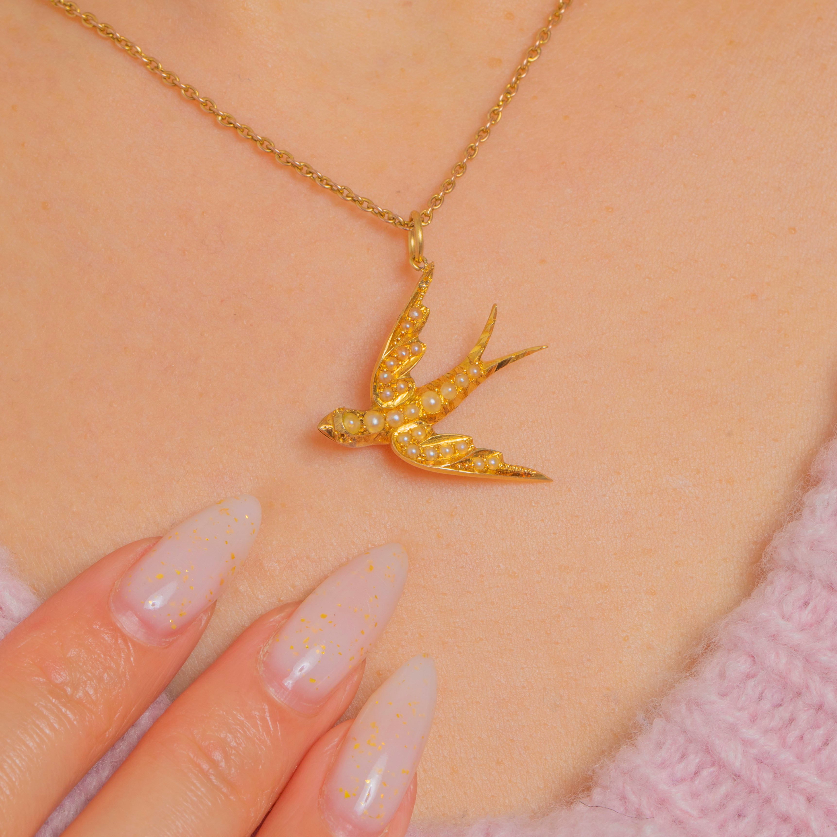 A graceful Victorian swallow charm crafted in glowing 18ct Gold, its outstretched wings and sleek body dotted with tiny creamy Pearls that lend a soft, romantic lustre. The silhouette is beautifully rendered with scalloped wing edges and fine engraved feather and tail detailing for a delicate, light-catching finish.