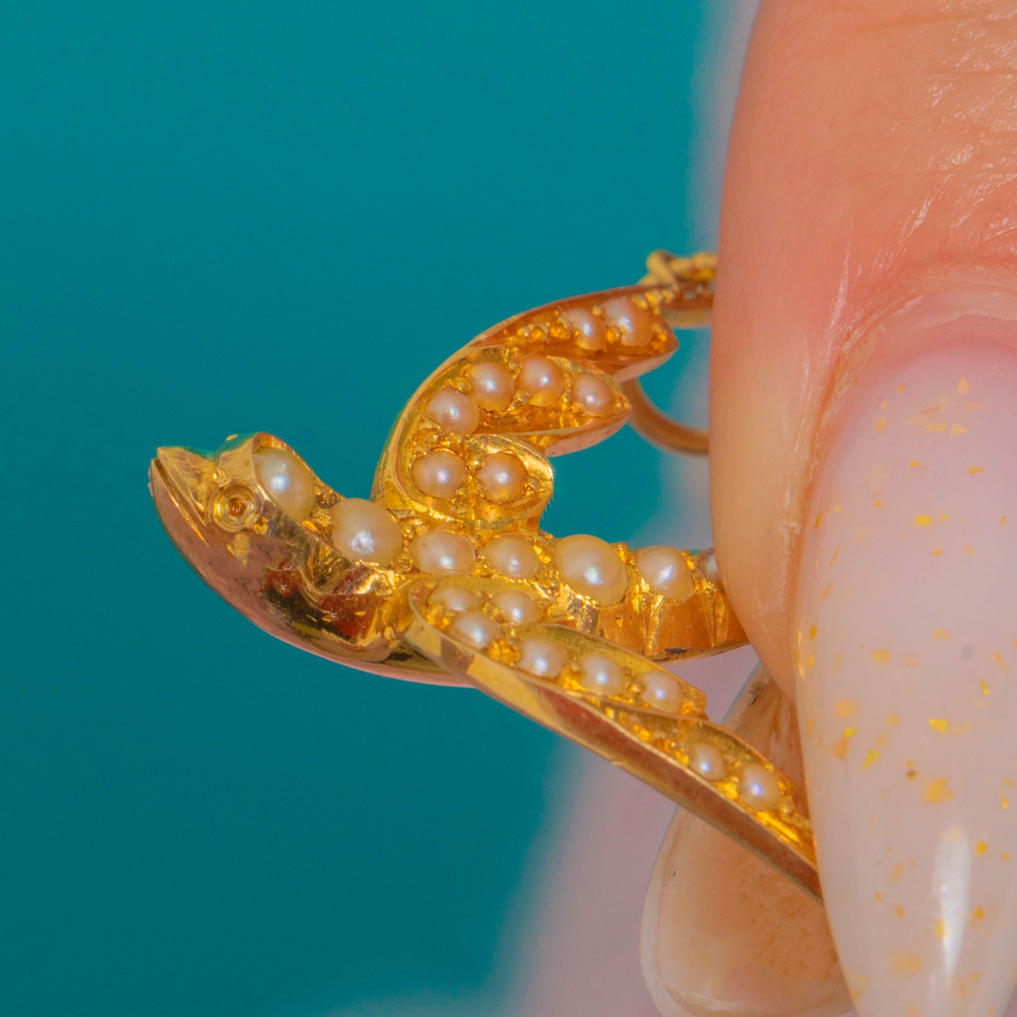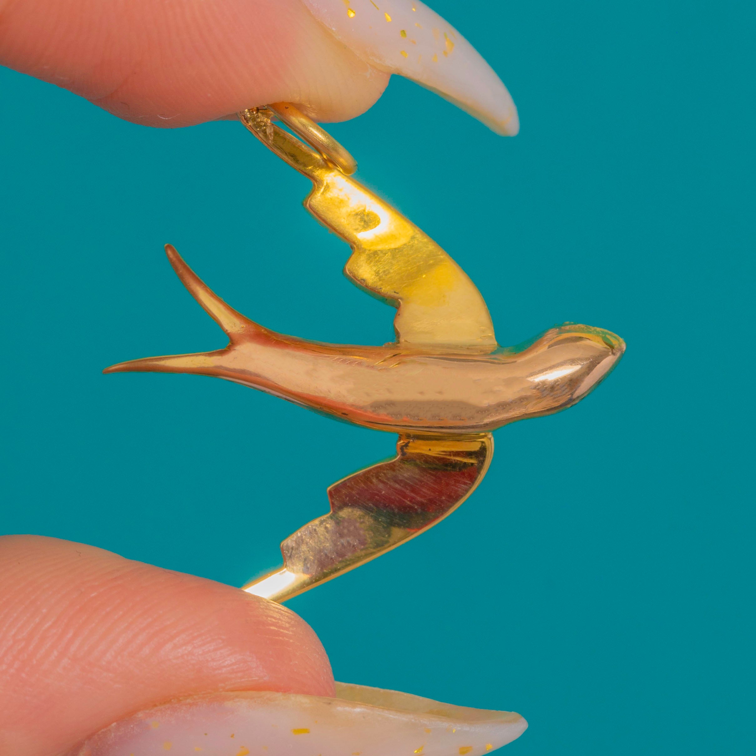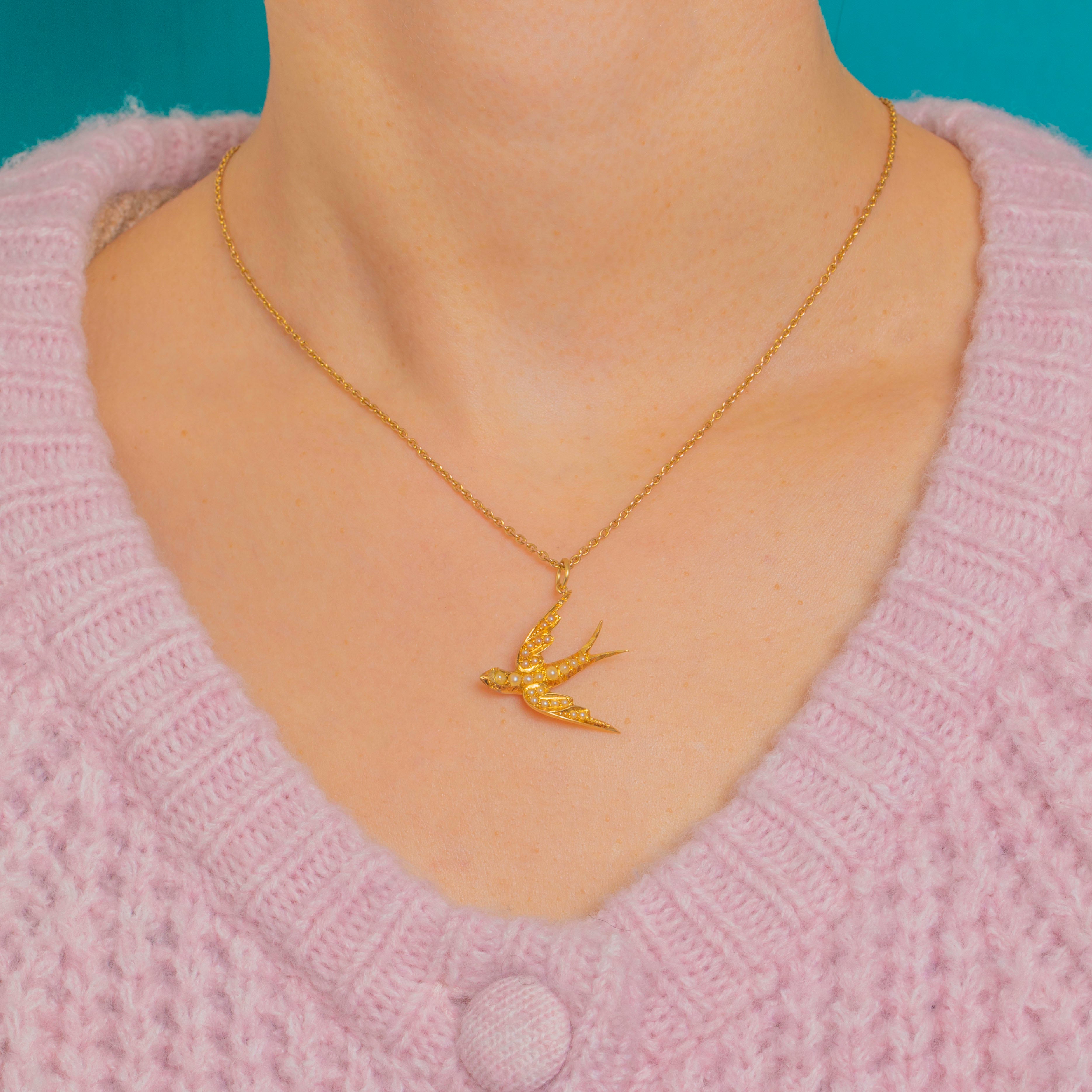 A graceful Victorian swallow charm crafted in glowing 18ct Gold, its outstretched wings and sleek body dotted with tiny creamy Pearls that lend a soft, romantic lustre. The silhouette is beautifully rendered with scalloped wing edges and fine engraved feather and tail detailing for a delicate, light-catching finish.