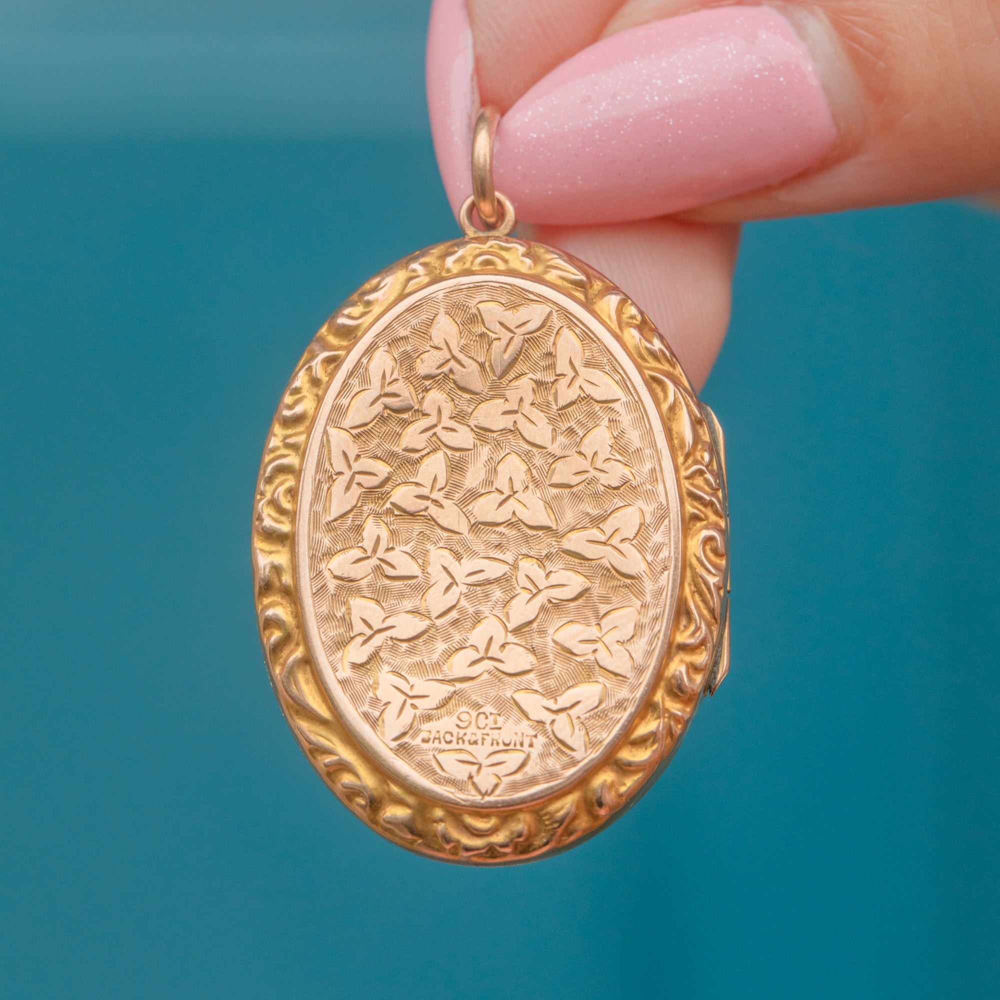 This large antique 9ct Gold engraved oval locket will make a charming addition to your collection! Symbolising everlasting love and friendship, this Victorian locket has been finely engraved with ivy leaves covering its entirety, and is framed by an exquisite repoussé border.