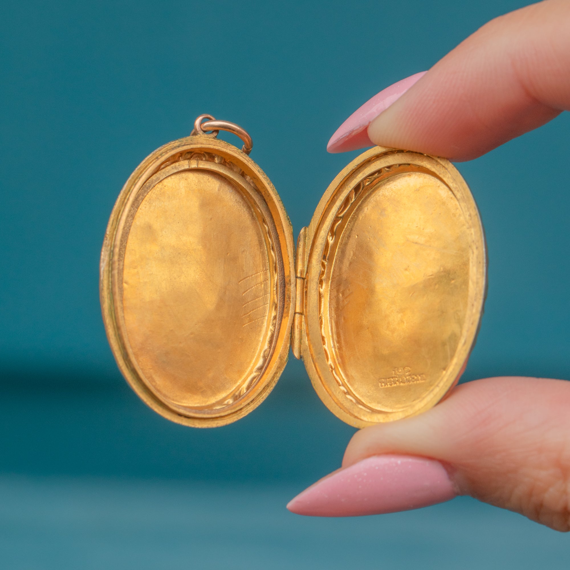VERY GOOD-EXCELLENT: This large antique 9ct Gold engraved oval locket is in wonderful condition. The Gold is bright and buttery, and the engraved and repussé details have all remained crisp. There is minor wear inside the locket, including some scratches and discolouration, however, once your chosen photographs have been inserted, this won't be visible. The locket closes securely, allowing you to use and wear this antique Gold locket with absolute confidence!