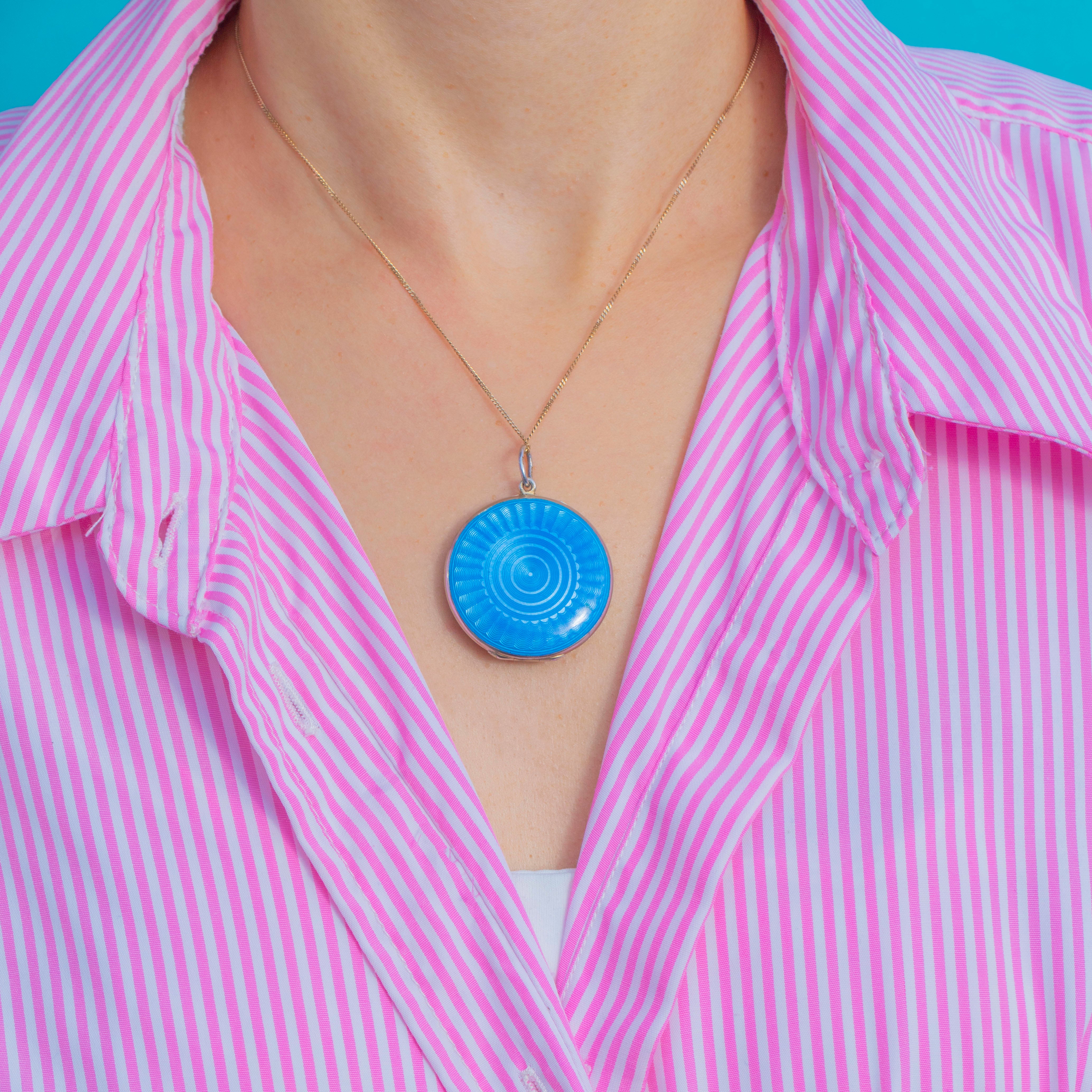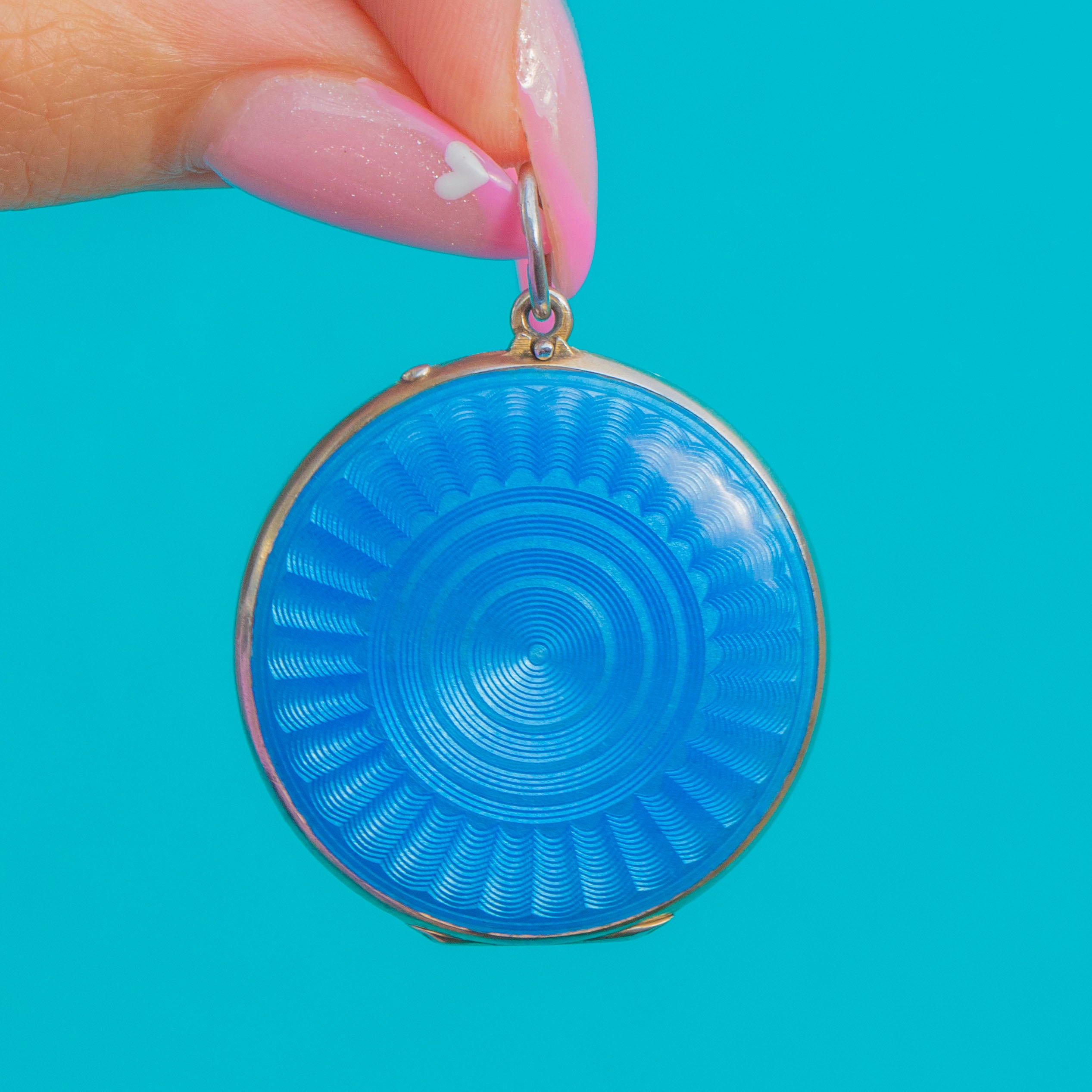 A glorious turn-of-the-century locket with vivid powder-blue Guilloché Enamel radiating a silky, sunburst shimmer. Crafted in fine 930 Silver and richly gilded inside, it opens to reveal two original frames ready for cherished photographs.