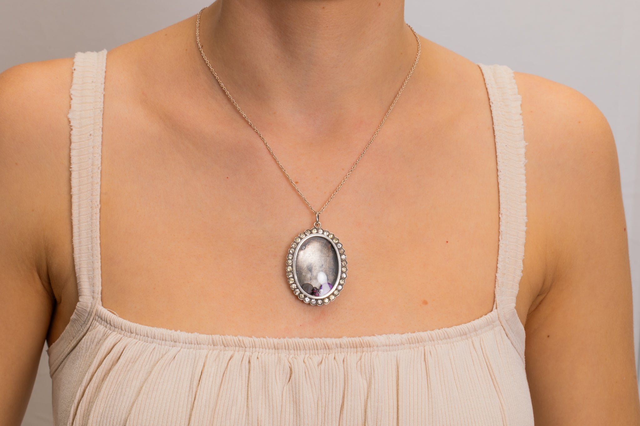 This large Edwardian Silver oval Paste locket will be a playful addition to any antique jewellery collection! A sea of scintillating Diamond Paste elegantly haloes her large oval glass frame, with a soft scalloped edge to finish.