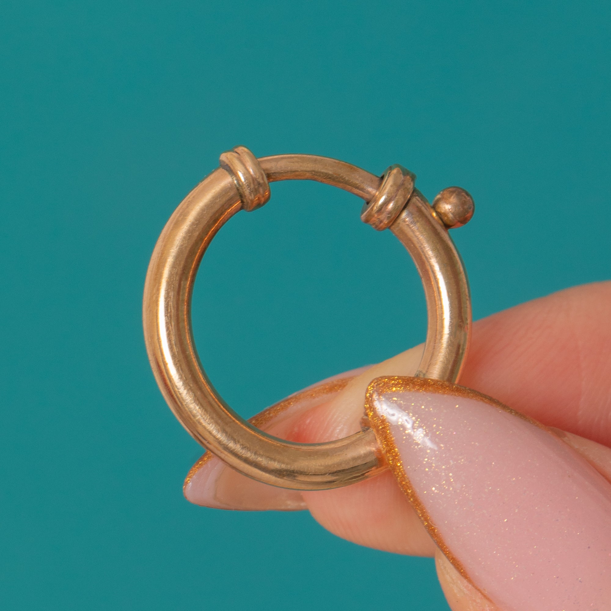 VERY GOOD: The bolt-ring opens and closes securely, with only light wear consistent with age. Surface wear and patina present as expected for Victorian low-carat Gold alloys. Strong and fully functional.