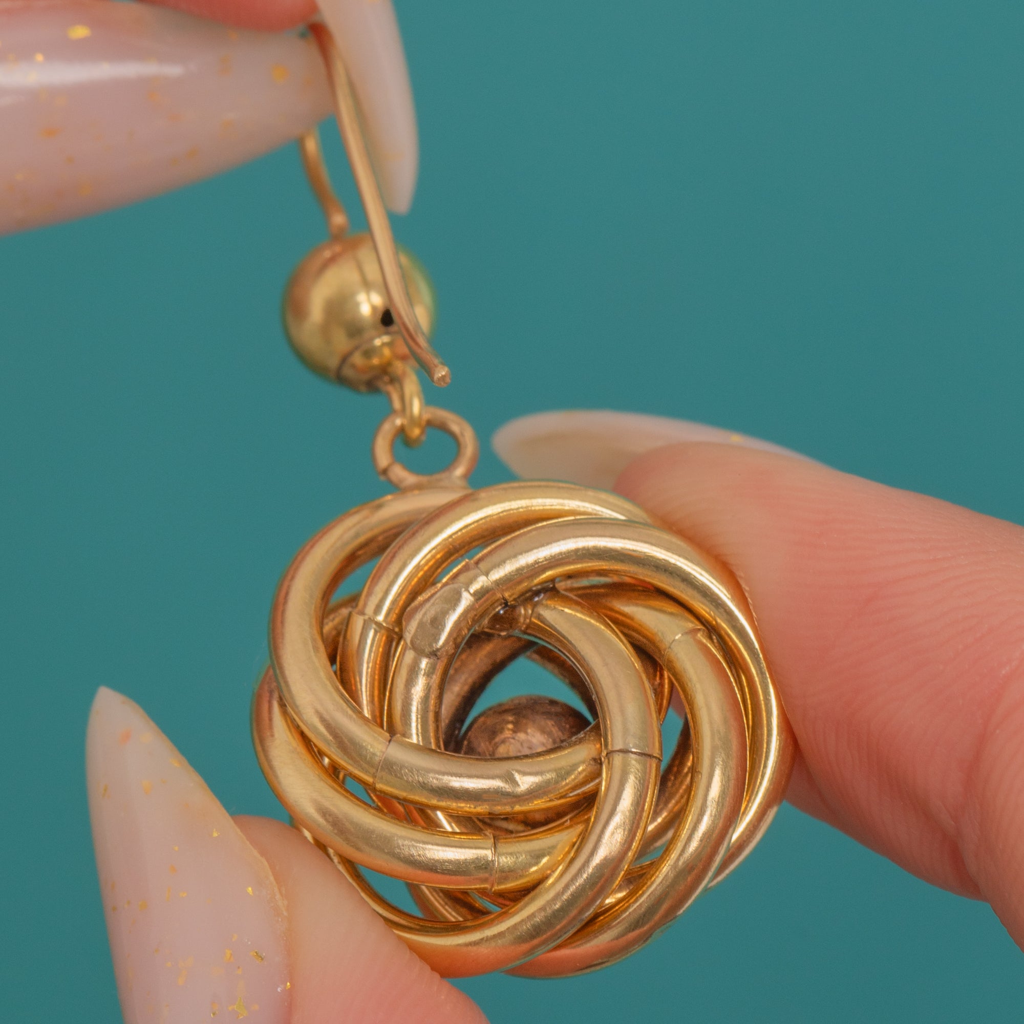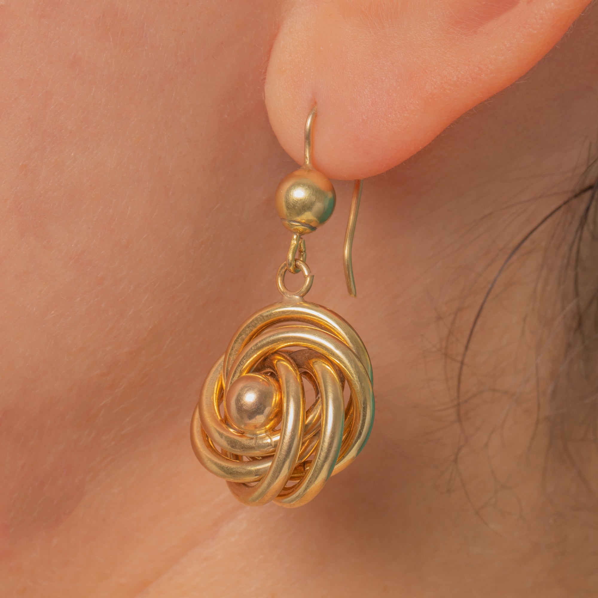 VERY GOOD-EXCELLENT: Bright, mirror-like Gold with minimal surface wear commensurate with age. The tubular knots remain crisp with only a few tiny dimples visible under close inspection; solder seams are visible as expected for period construction. Ear wires are secure and the articulated drops move smoothly.