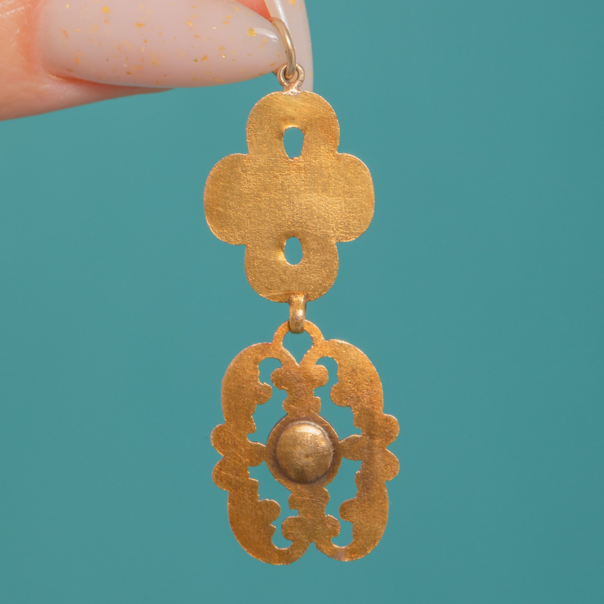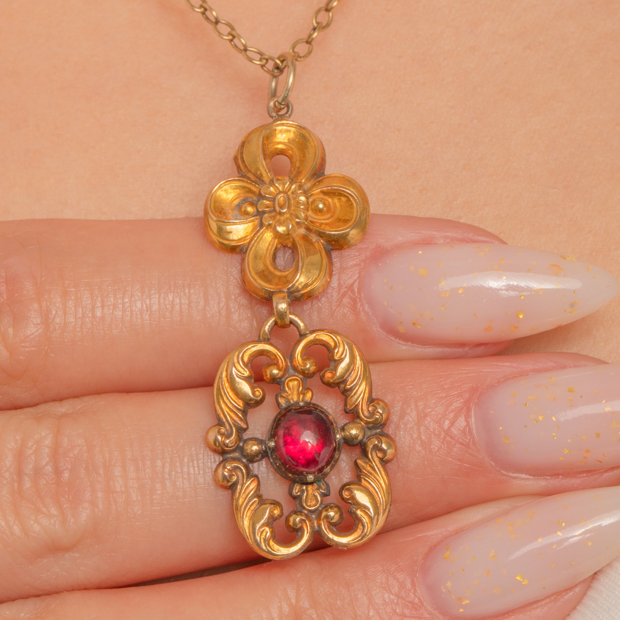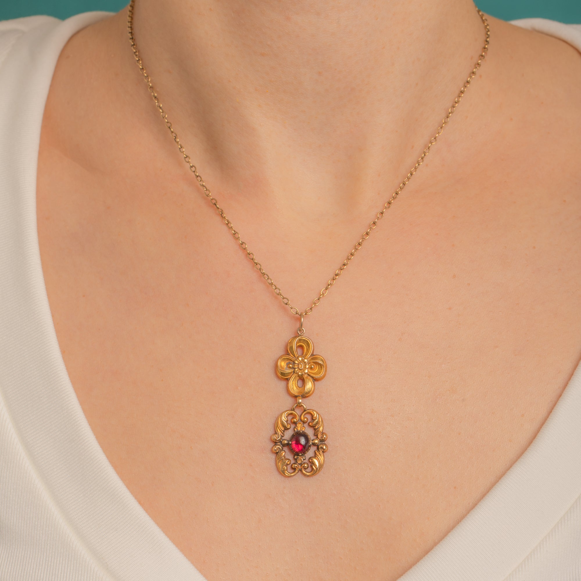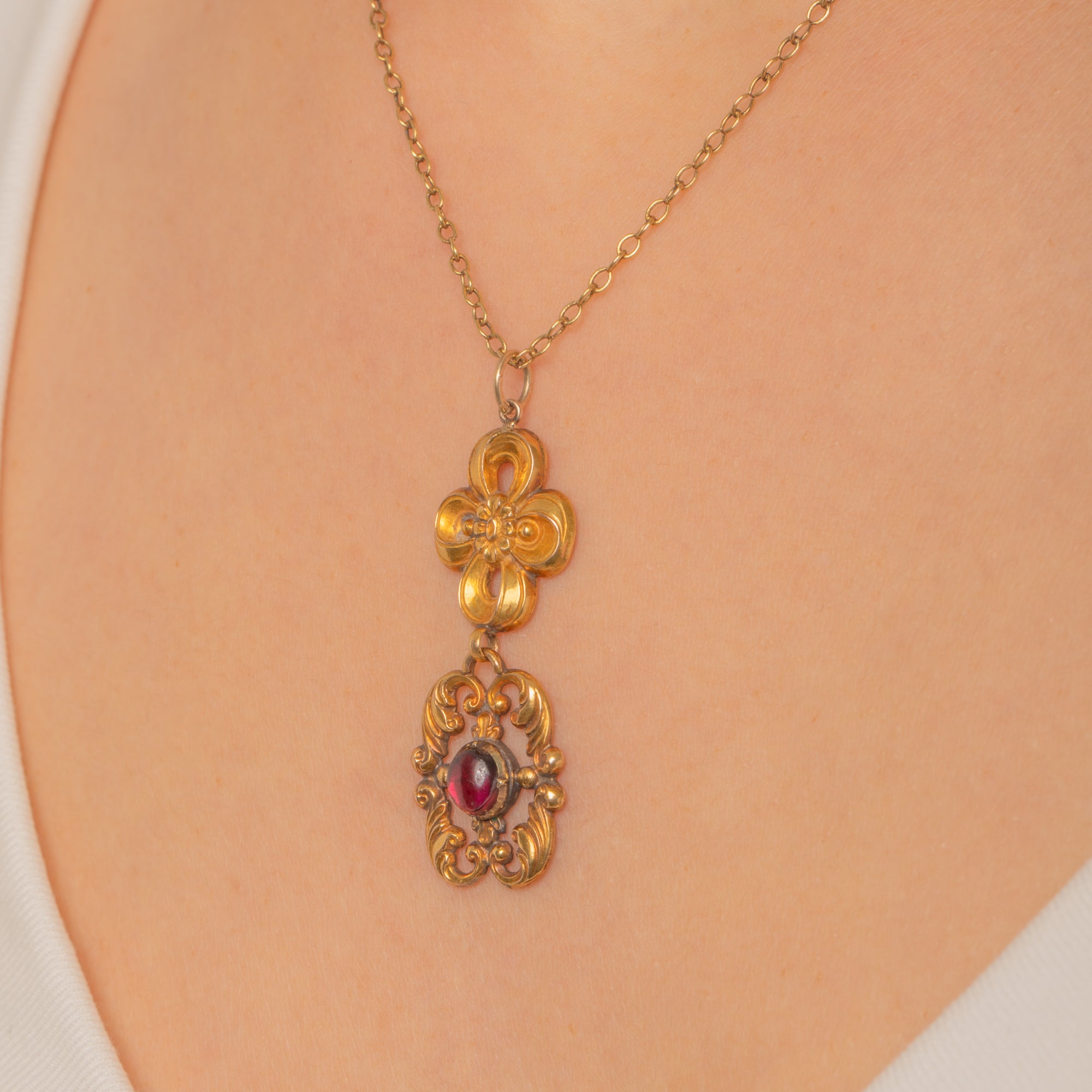 A lyrical Late Georgian drop pendant crafted in warm 15ct Gold and set with a rich, deep-red Garnet cabochon. The two-part articulated design marries a pierced domed rosette with an openwork scrolling cartouche, its curves accentuated by delicate granule accents and a graceful piecrust setting that cradles the glossy cabochon.