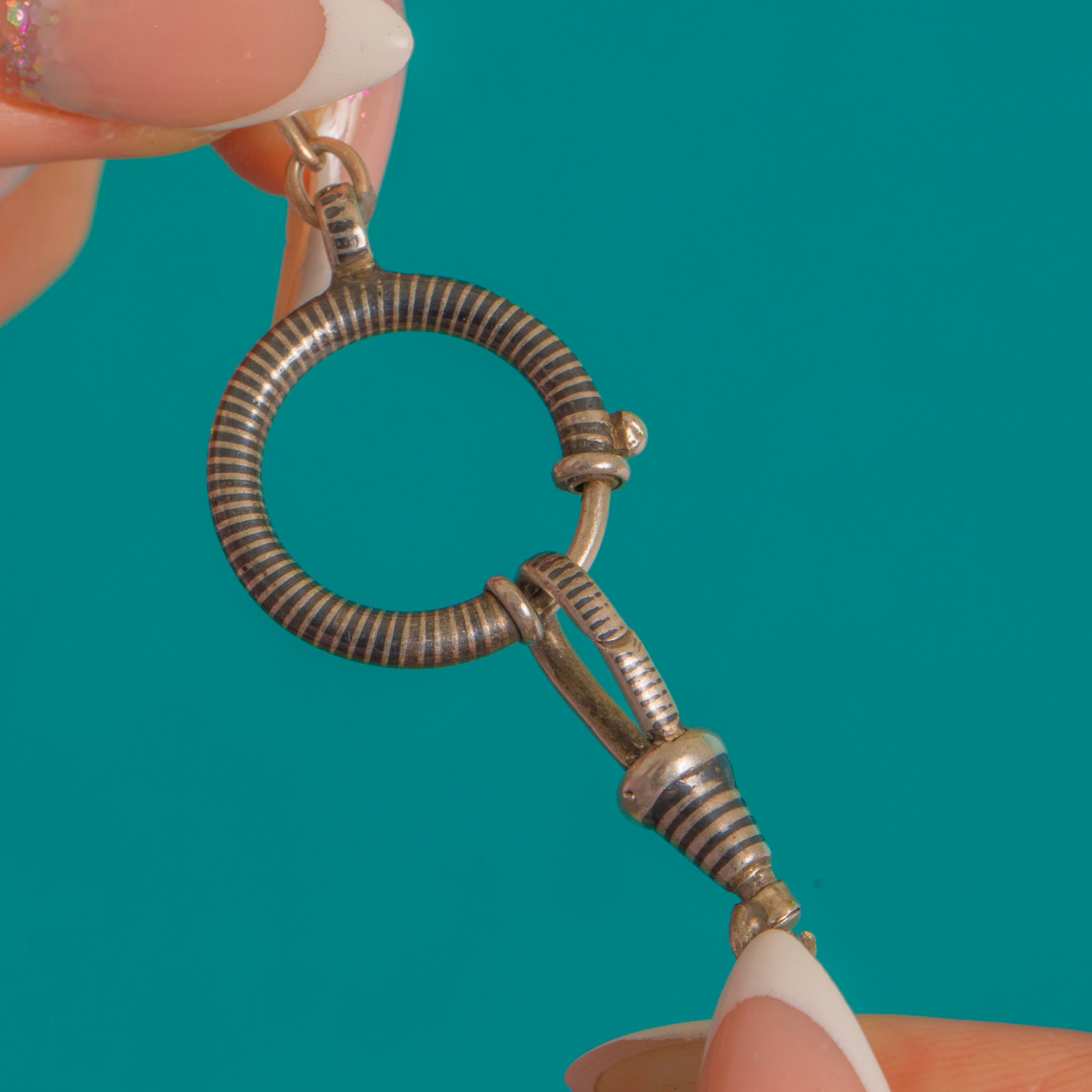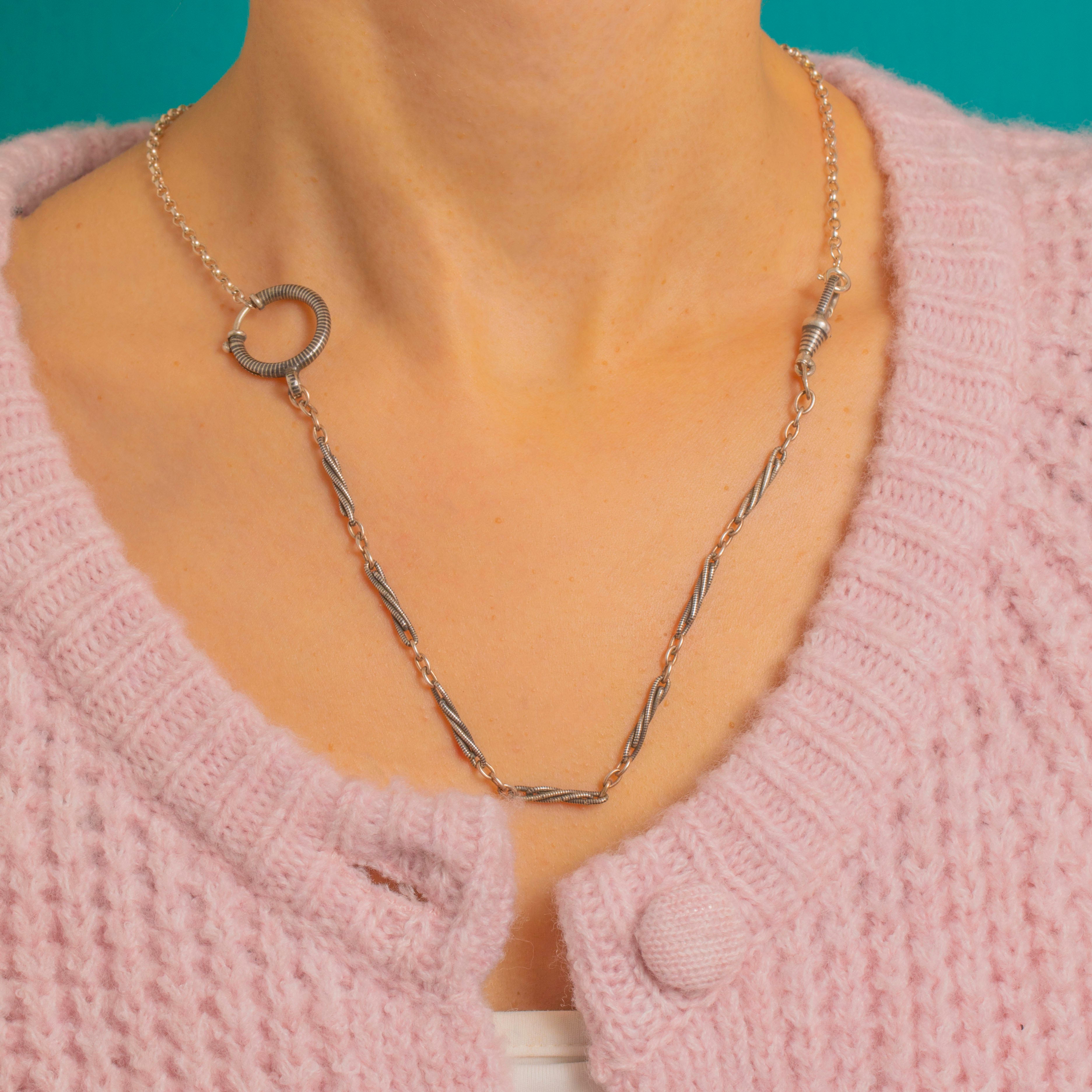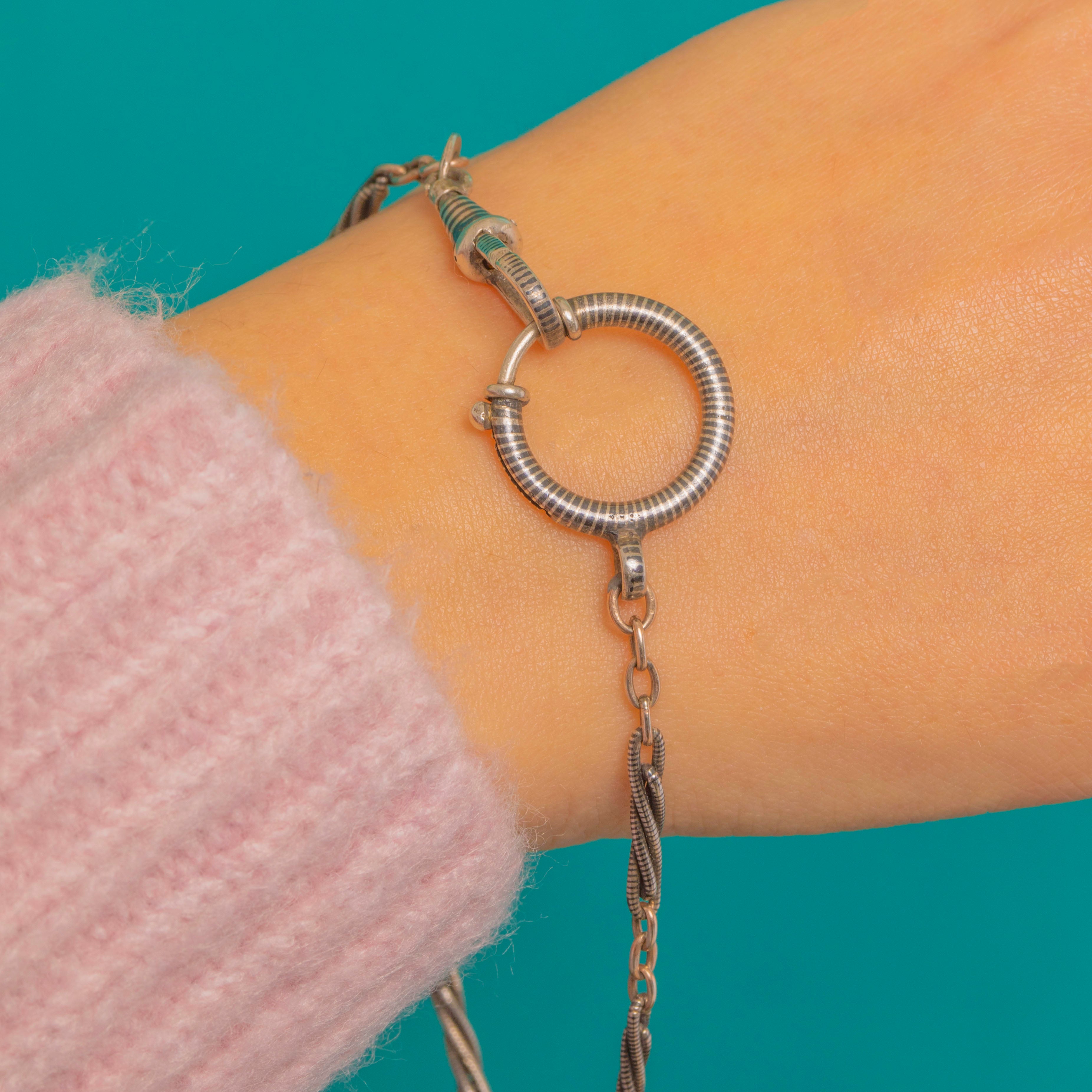 Industrial elegance with a Victorian twist, this Late Victorian chain extender pairs inky Niello with Silver to striking effect, its fancy wrapped links culminating in an oversized 18.5mm bolt-ring and a robust ribbed dog-clip. The striking silhouette evokes classic watch-chain fittings, reimagined with minimalist, utilitarian poise.