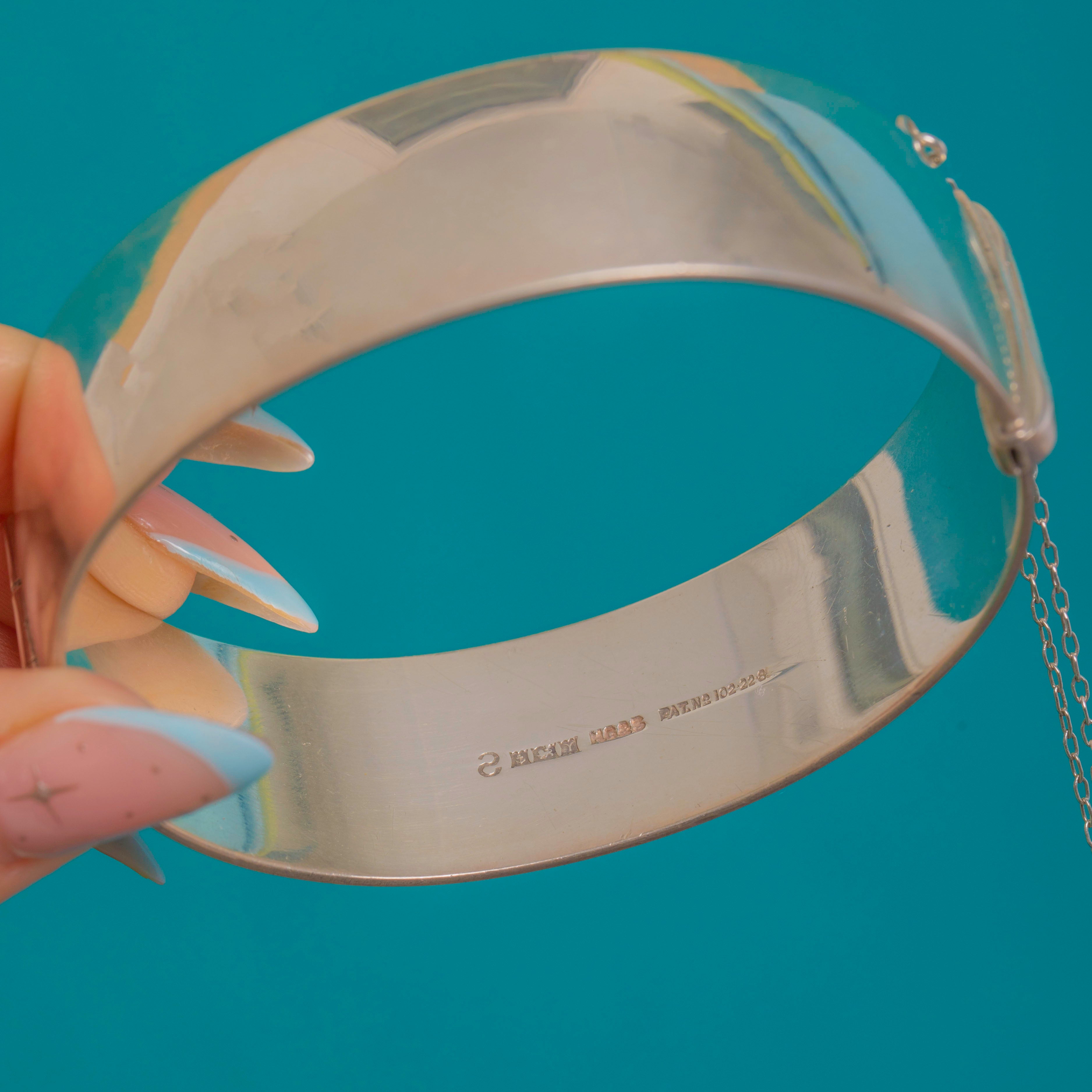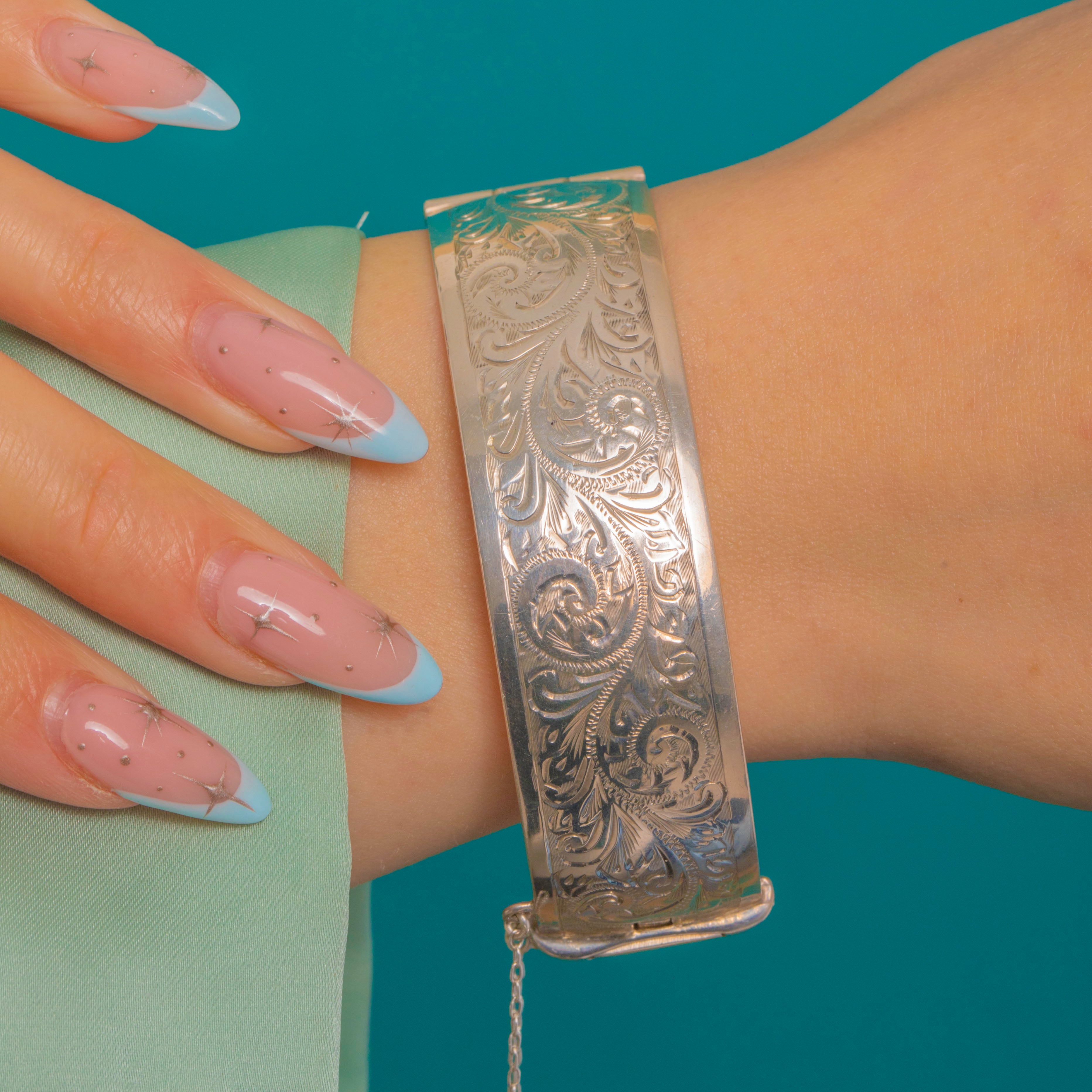 This Vintage 1973 Sterling Silver hinged bangle blends ornate engravings with sleek, modern lines. The front is beautifully bright-cut with foliate and scroll motifs framed by smooth borders, while gleaming plain sections catch the light for a bold, cuff presence.