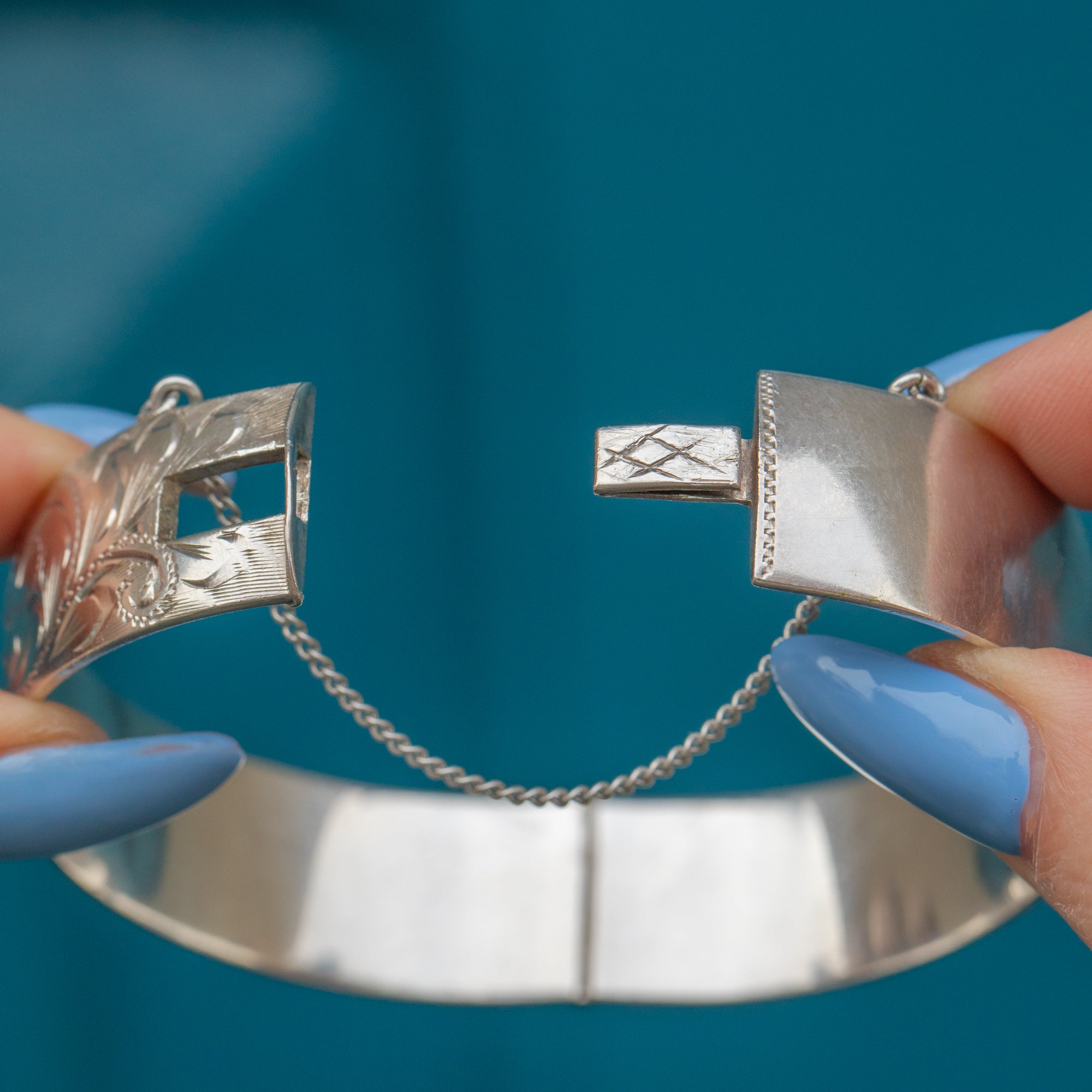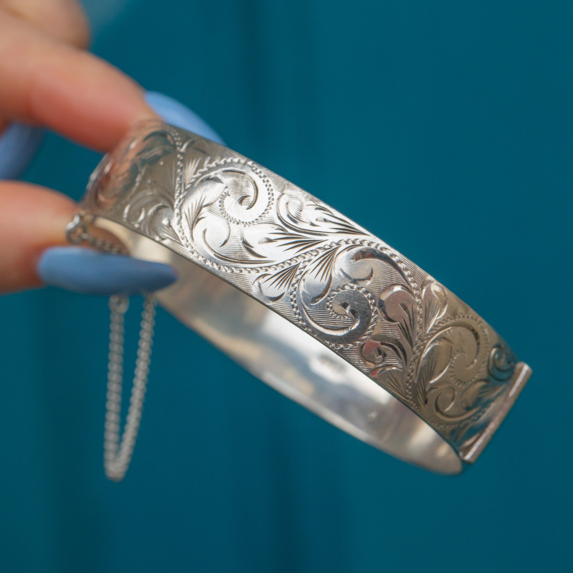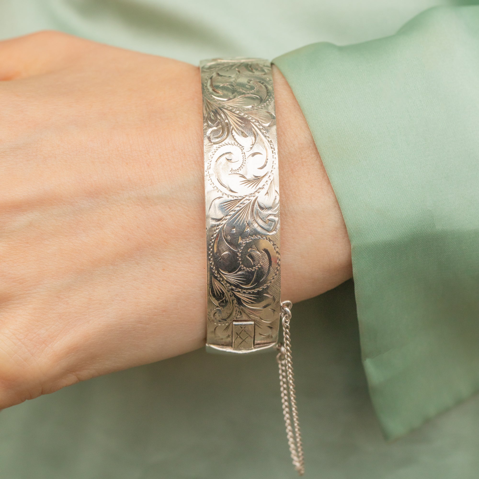 VERY GOOD. This Silver engraved cuff bangle is in very good condition. The Silver is bright and the engraved retails have remained crisp. There are some light scratches on the inside of the bangle and minor signs of wear on the back, consistent with its vintage nature. The safety chain is in perfect condition, and the clasp is secure, ensuring reliable wear. This piece retains its timeless charm and remains a beautiful example of Mid-Century craftsmanship.