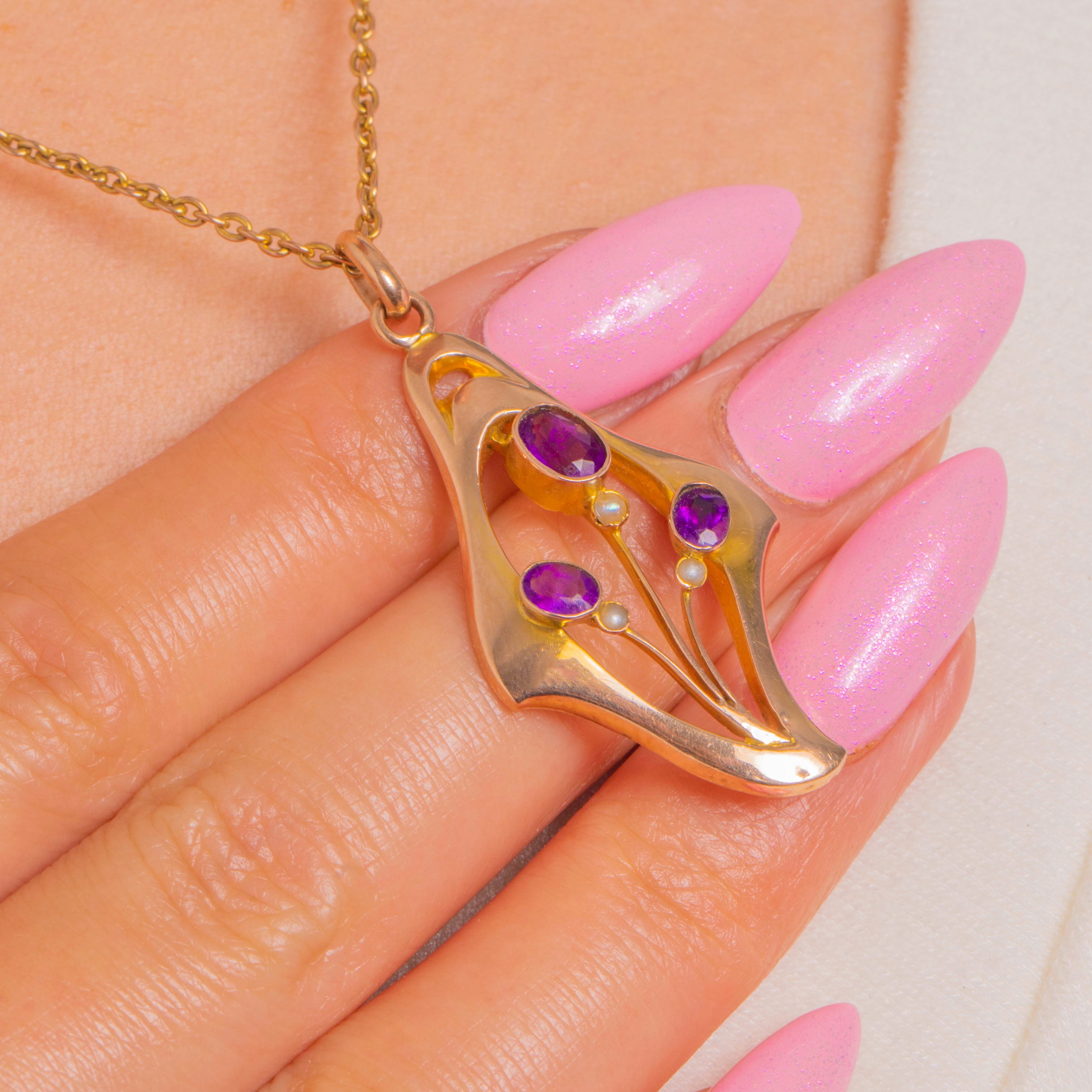 A lyrical Art Nouveau pendant by Murrle Bennet in glowing 9ct Gold, its elongated lozenge silhouette traced with graceful openwork and flowing foliate lines. Three fine wire stems unfurl into a delicate spray, each tipped with a lively faceted Amethyst in romantic violet and accented by petite creamy Seed Pearls.