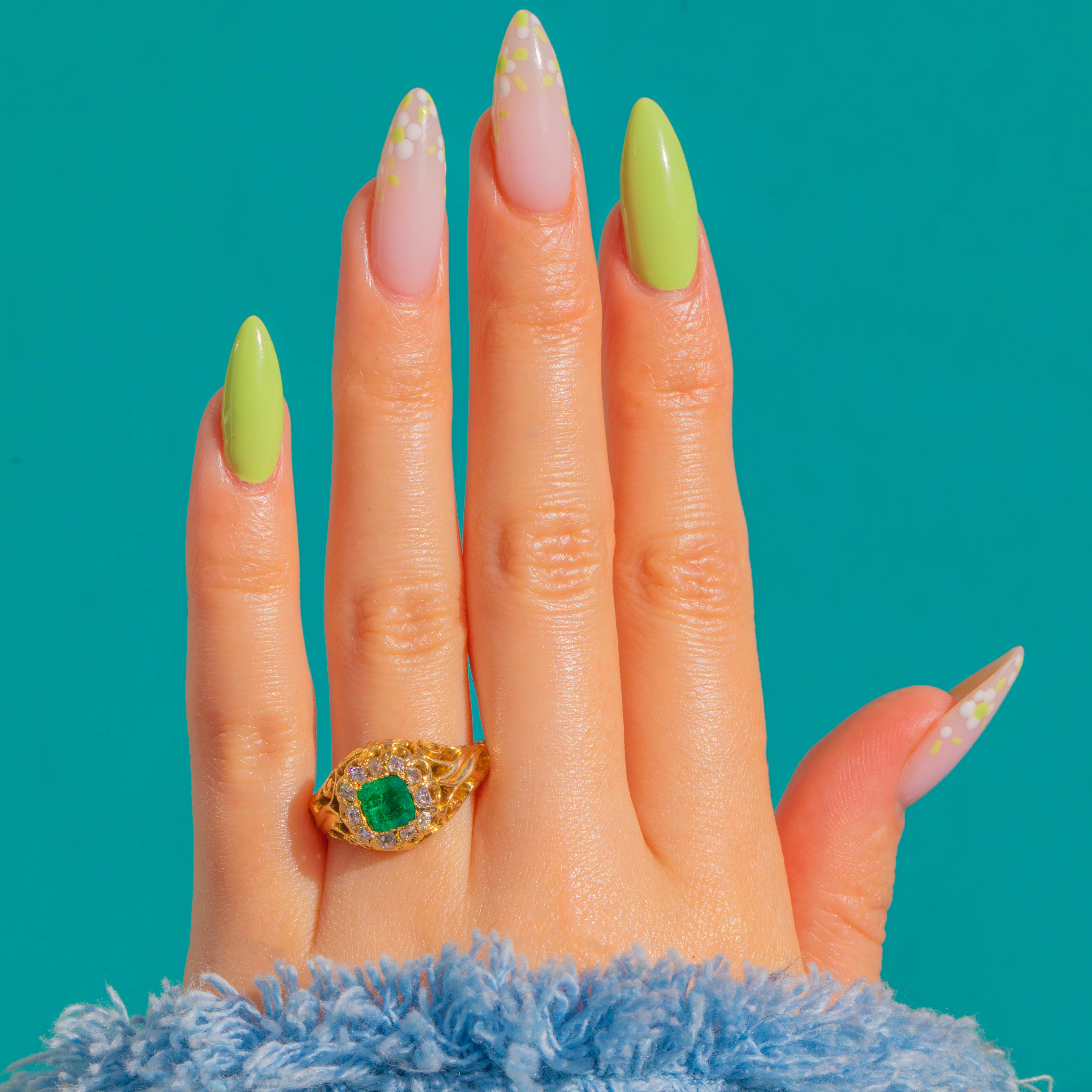 At the heart sits a square-cushion Emerald of approximately 0.60cts , encircled by eleven bright round Diamonds totalling approximately 0.22ct. The warm glow of the Gold amplifies the Emerald’s lush hue and the Diamonds’ scintillation, creating a beautifully decorative piece brimming with Victorian romance.