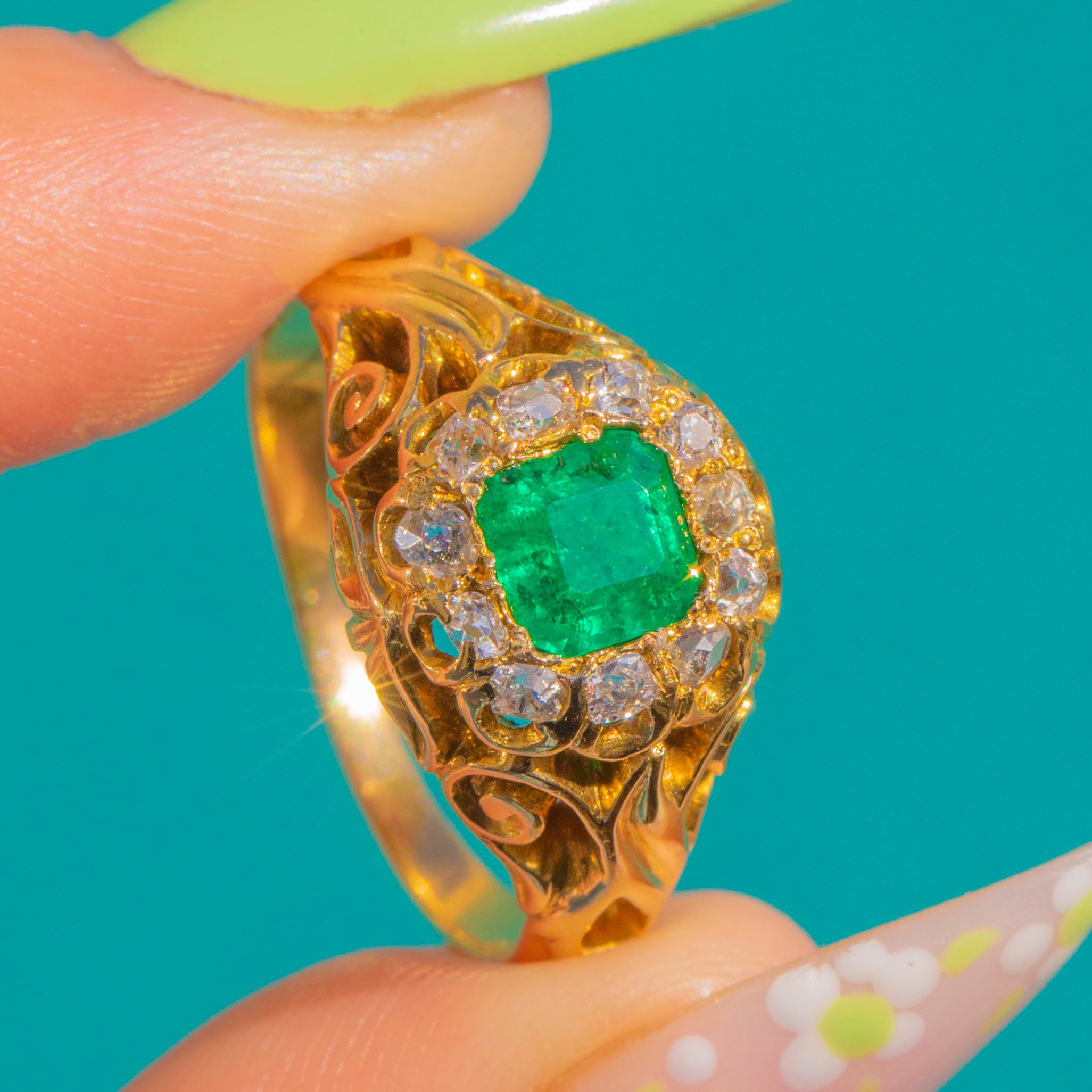 A quintessential Victorian treasure, circa 1890, this ornate and heavily carved cluster ring marries rich 18ct Gold with a vivid green Emerald and a halo of sparkling antique Diamonds!