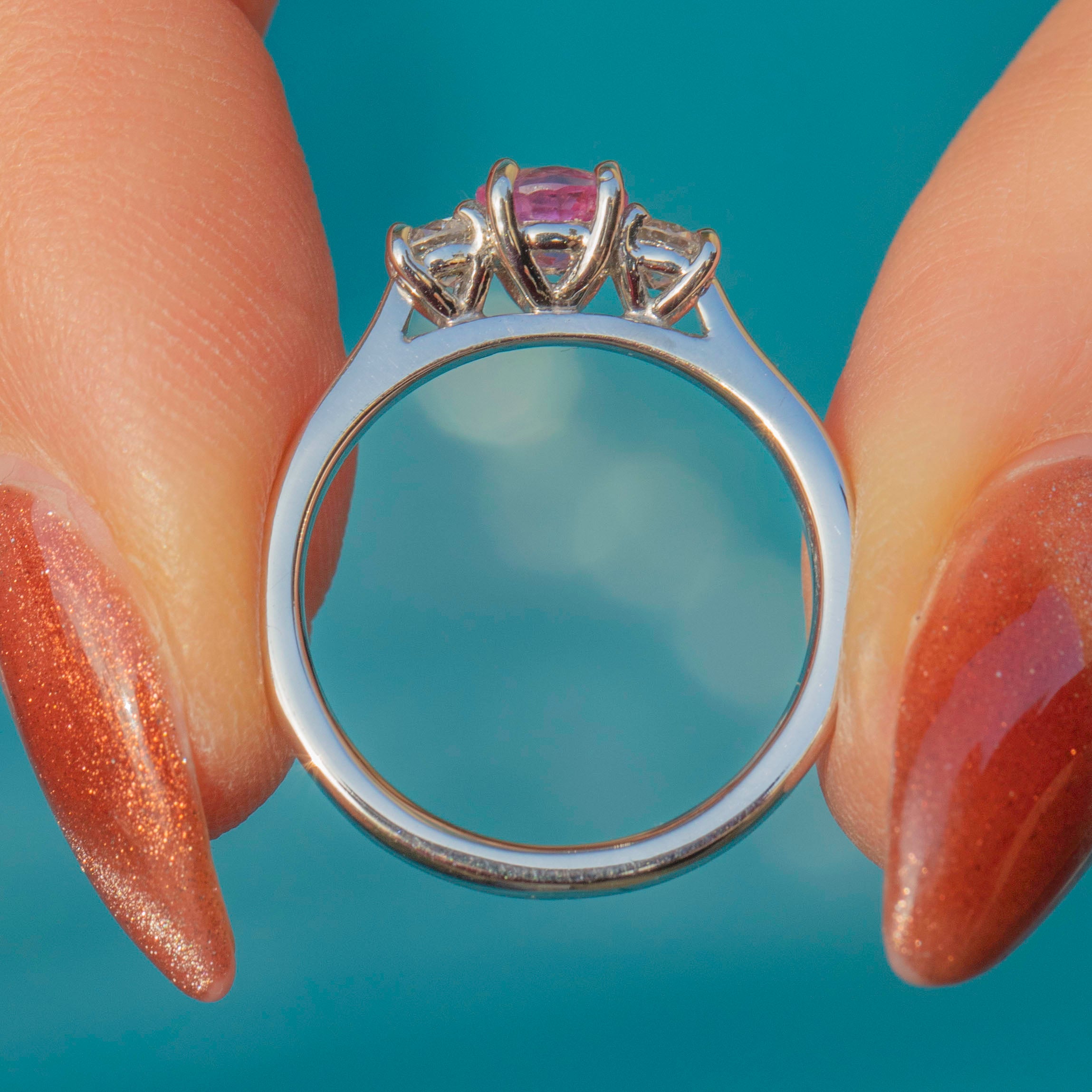 This Platinum Pink Sapphire Diamond trilogy ring is a stunning piece! As if plucked from a blossoming springtime field, this ring boasts a mesmerising 0.35ct pink Sapphire with a baby pink hue flanked by scintillating 0.10ct Diamonds.