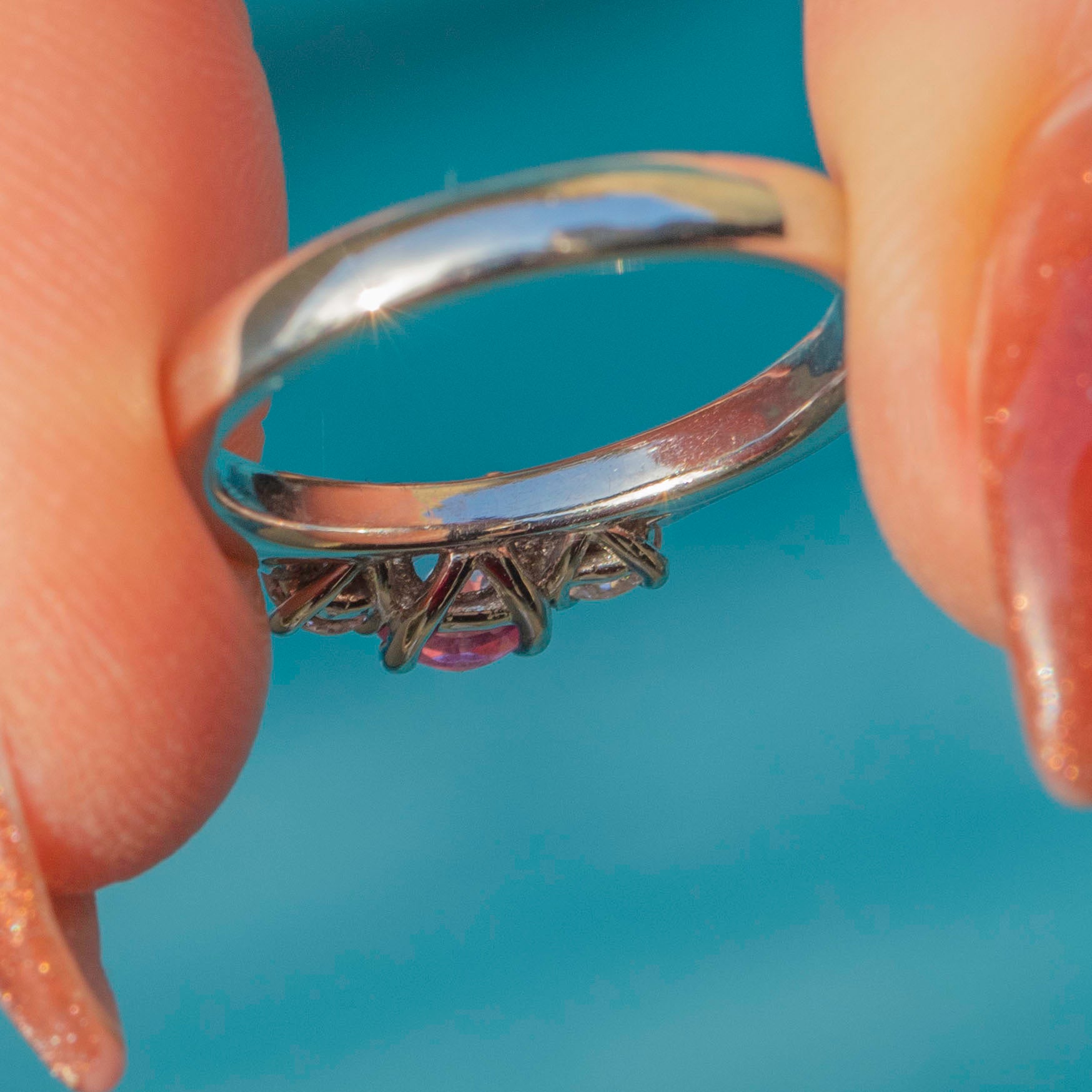 VERY GOOD: This Platinum Pink Sapphire Diamond trilogy ring is in very good condition! The gemstones are completely free from any chips or fleabites, each one securely set within its Platinum settings. The Platinum is smooth and bright. The band has retained its rounded form, with only a small resize mark visible on the back. This is a robust and feminine ring, perfect for everyday wear!