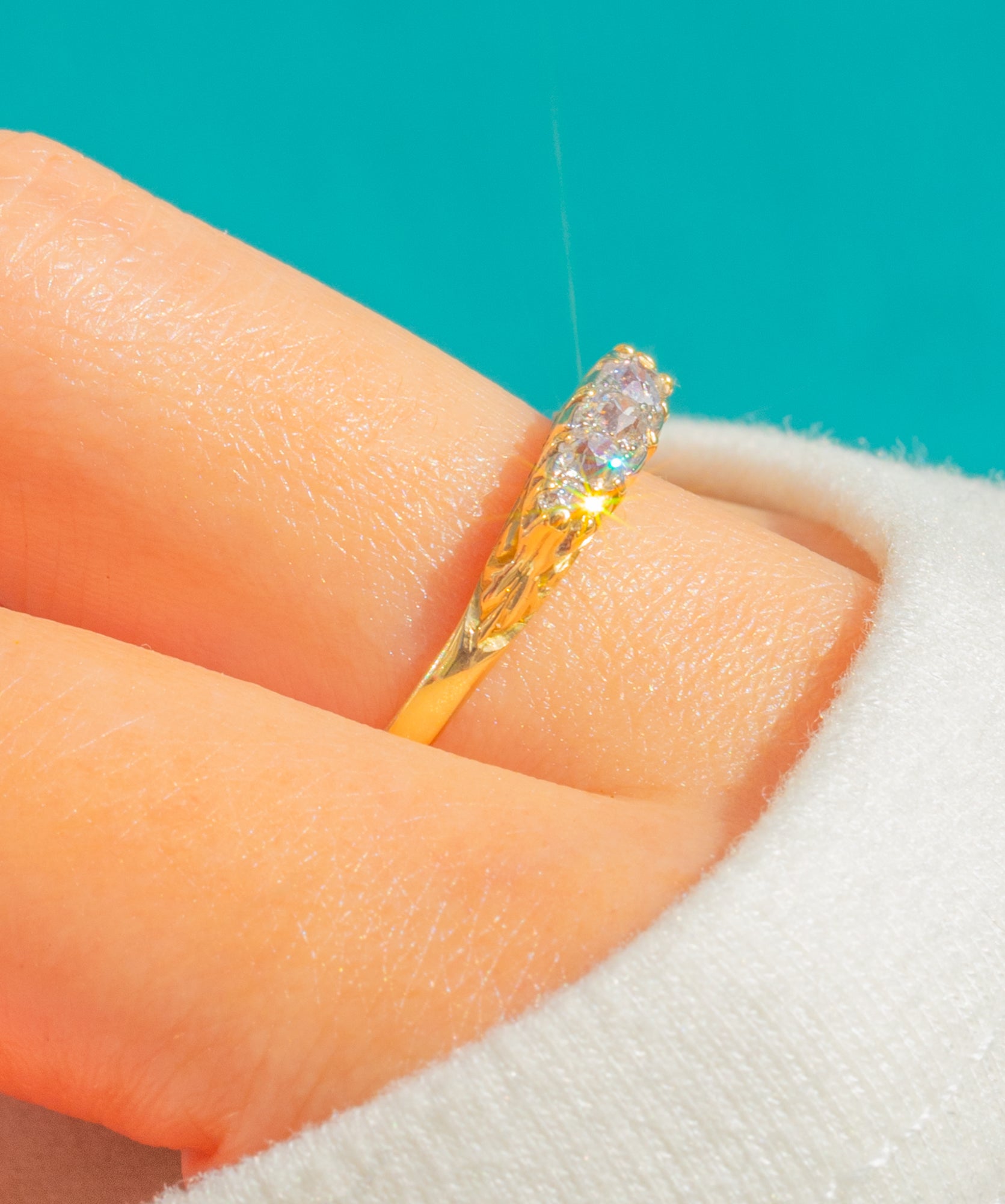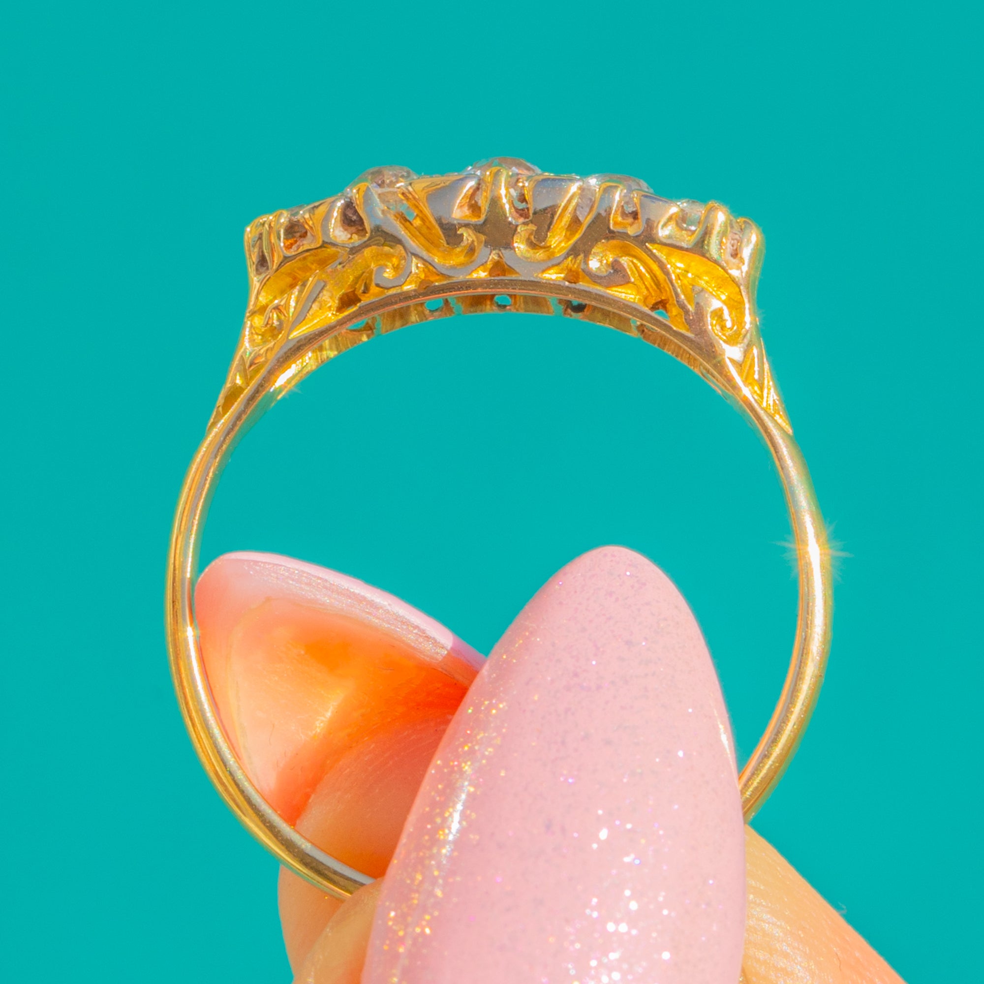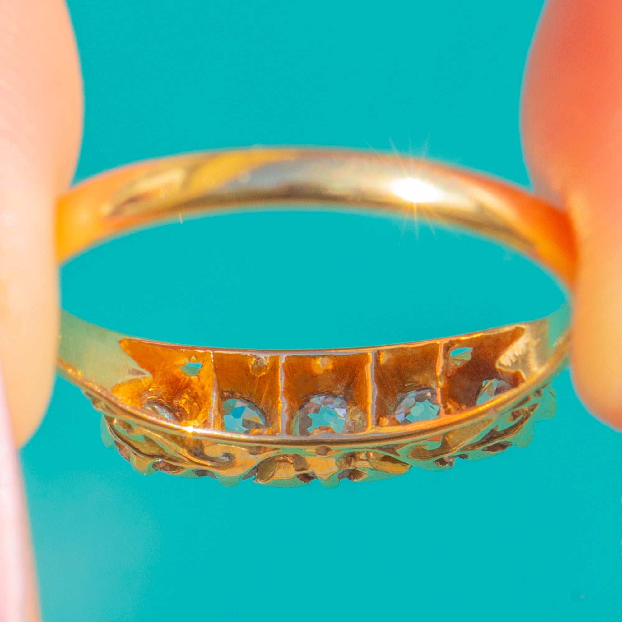A timeless Edwardian five-stone Diamond ring, beautifully crafted in rich 18ct Gold. Five Old Mine Cut Diamonds glint in an elegant linear arrangement, their bright fire enhanced by a slim, ornate crown.