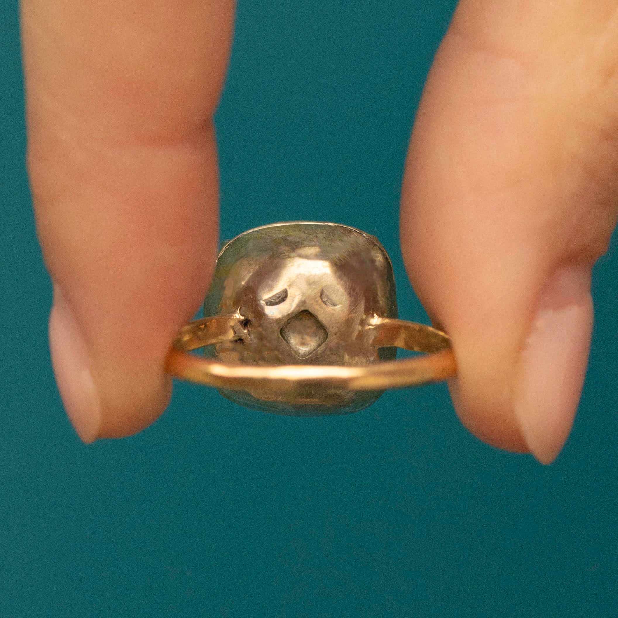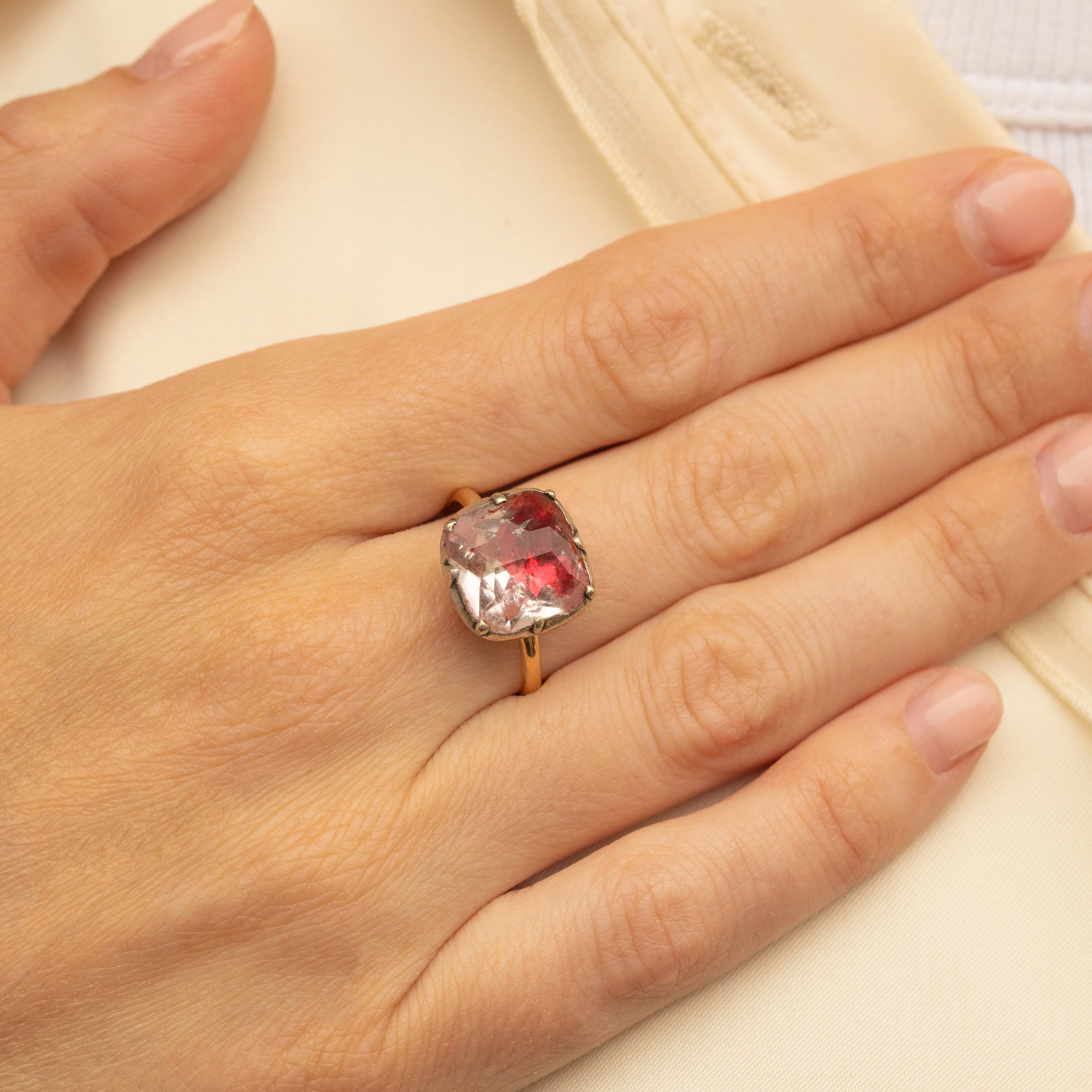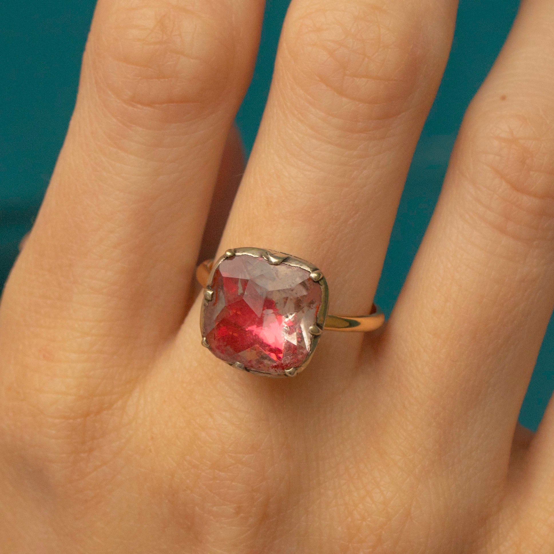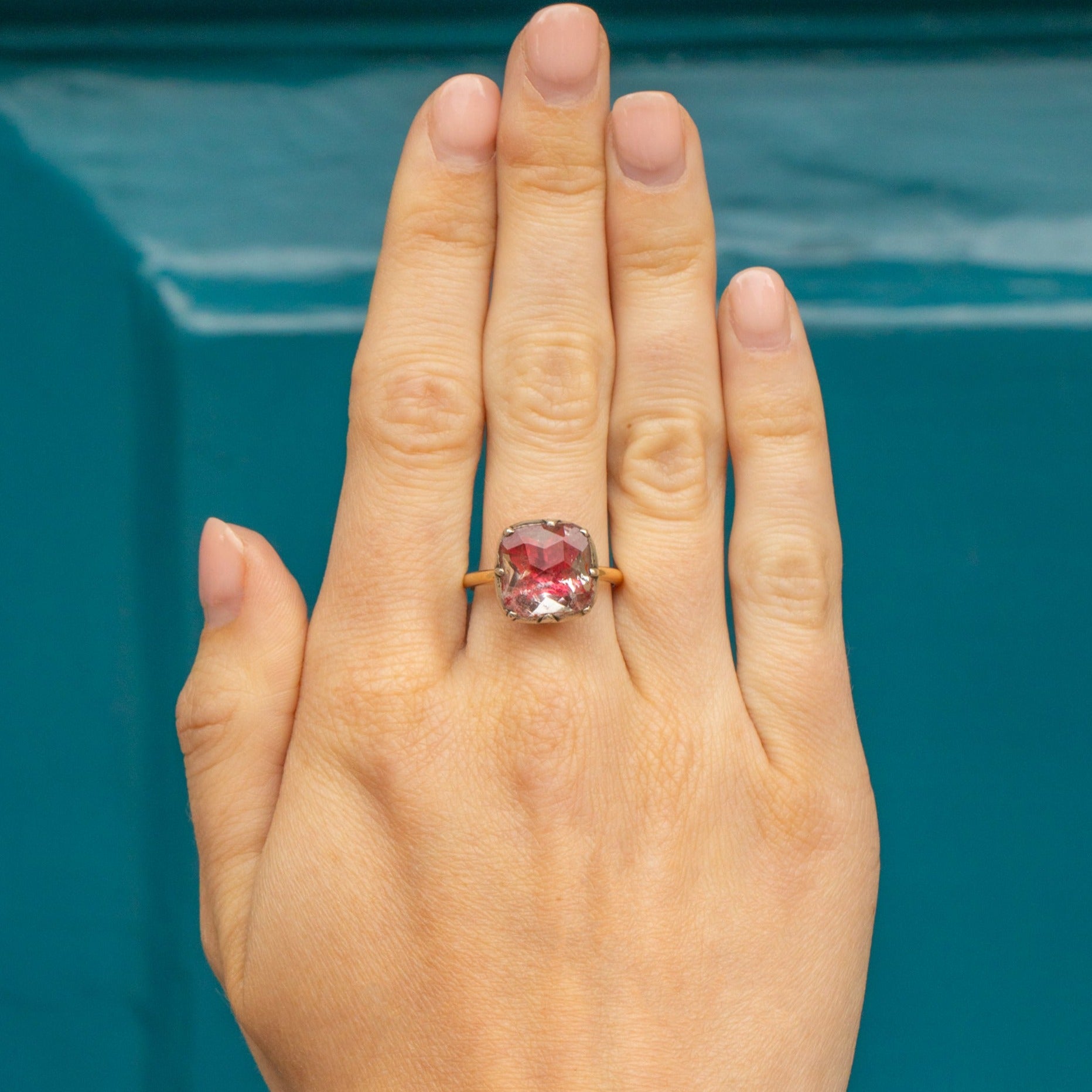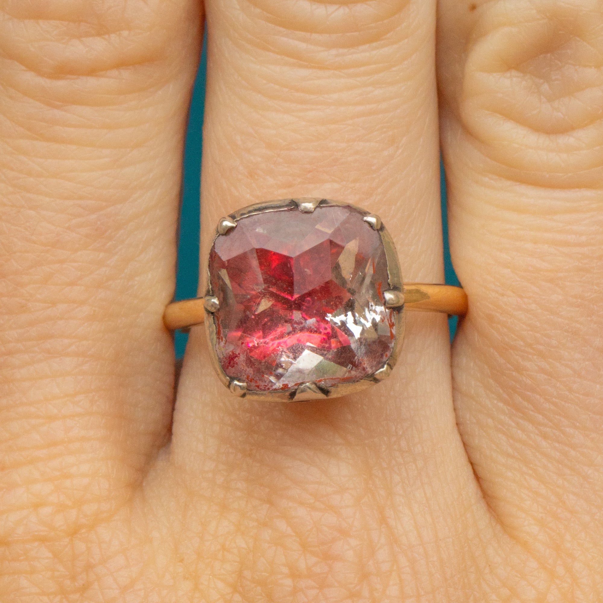 VERY GOOD TO EXCELLENT. This Queen Anne 15ct Gold Georgian pink foiled Rock Crystal ring is in wonderful condition. The Rock Crystal has retained its distinctive facets with no signs of wear, and is secure in its setting. The pink foiling has been beautifully preserved having only lifted slightly in some places, so we recommend avoiding humid conditions while wearing this ring to stop it from getting damaged. The back of the Rock Crystal settings do have some wear to note commensurate with age, but the piece sits uber comfortably against the skin.