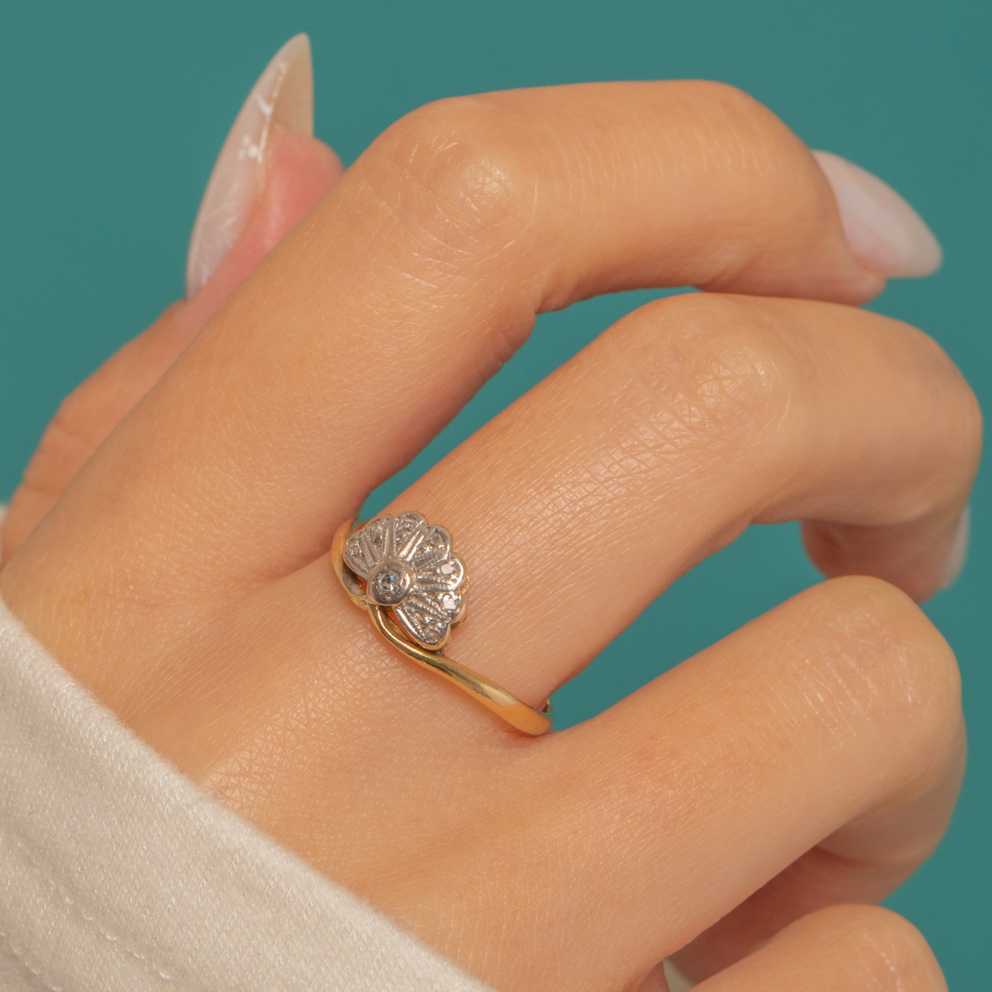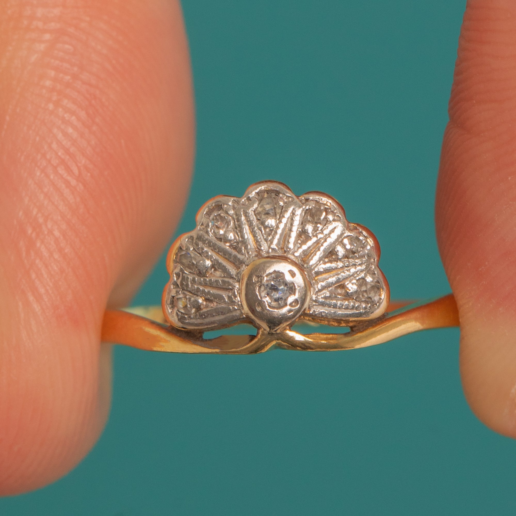 This delicate Art Deco treasure pairs a slender 18ct Gold shank with a Platinum-topped head. The scalloped fan motif is finely worked with milgrain and engraved radiating panels, centring on a small round Diamond and dotted with tiny round Diamond accents for a refined sparkle.
