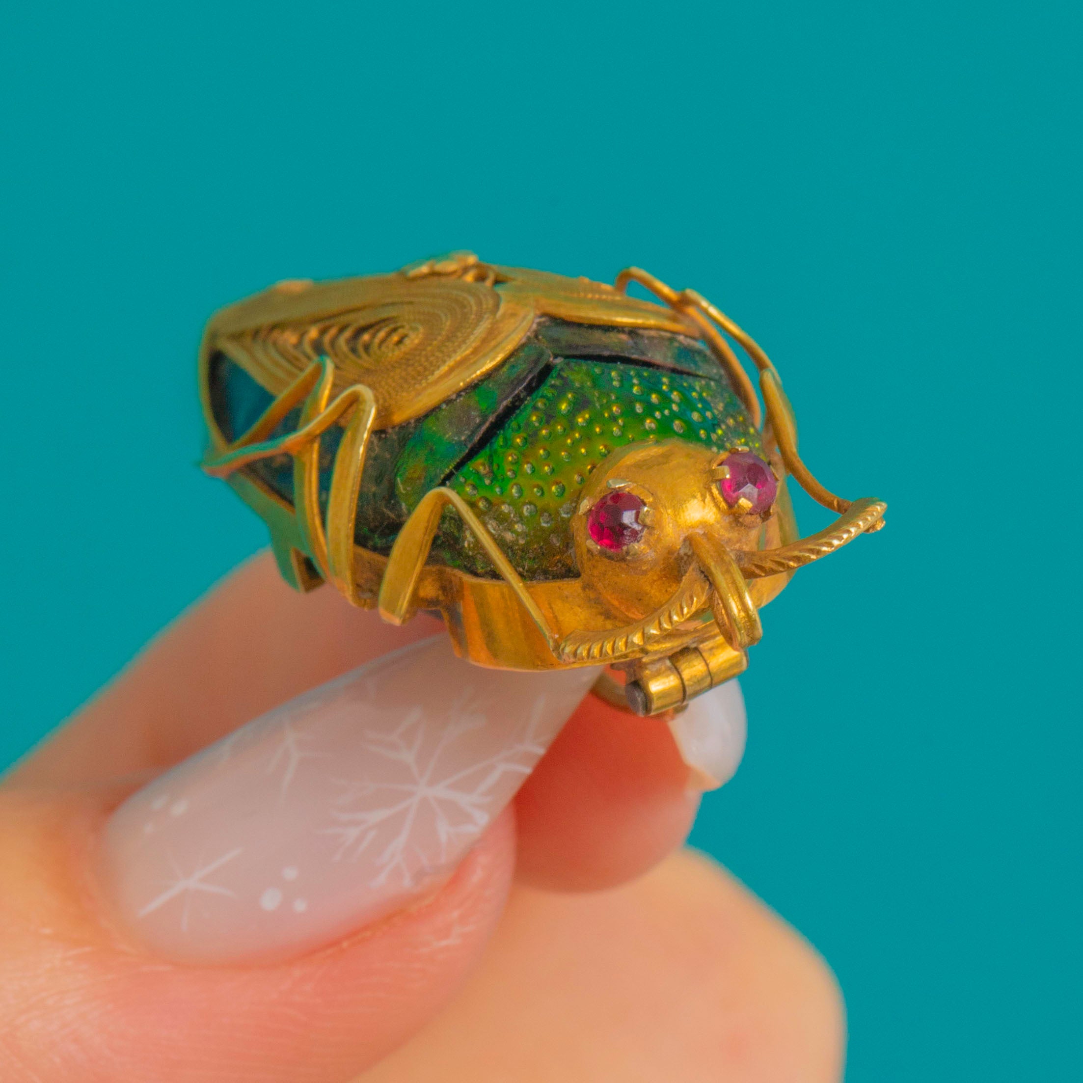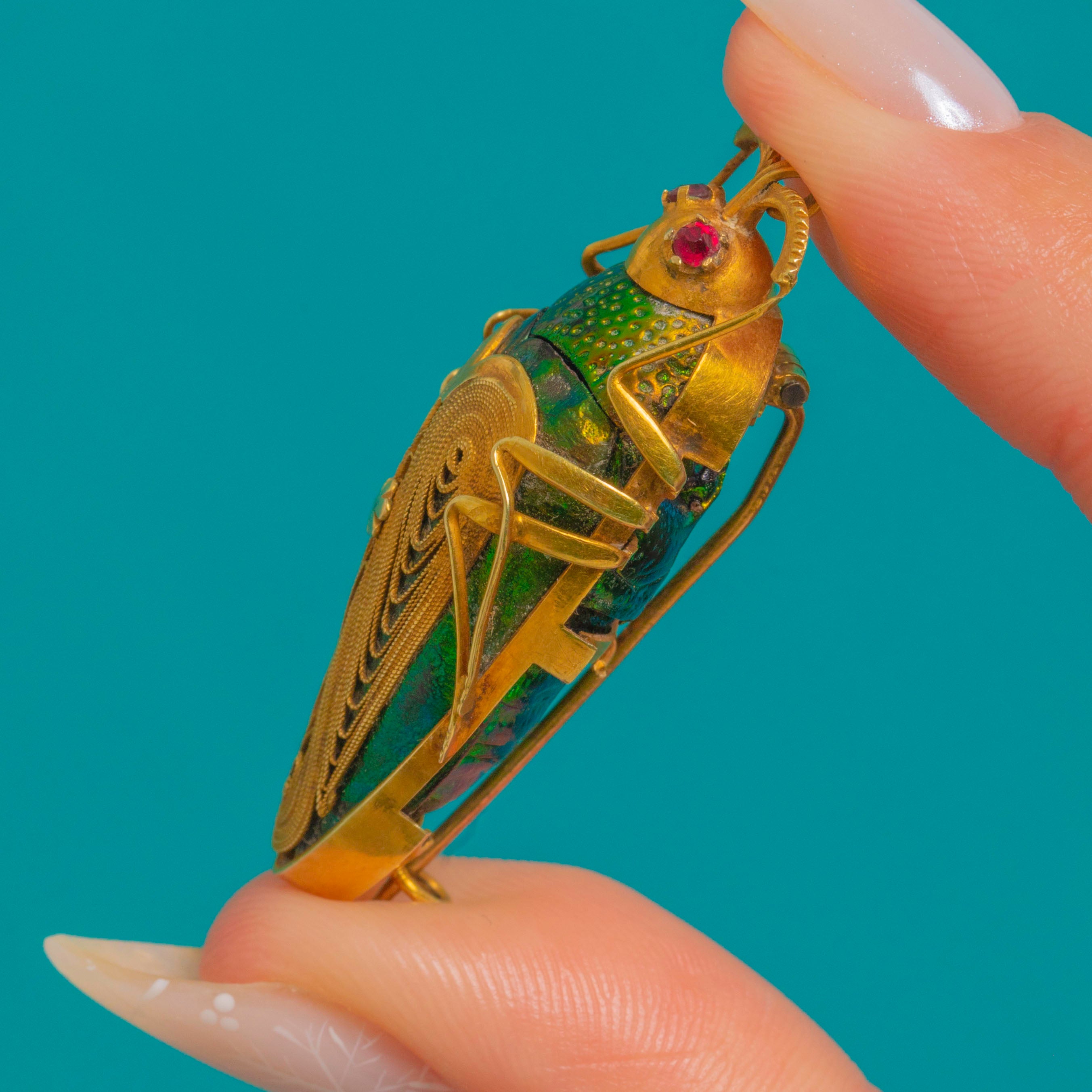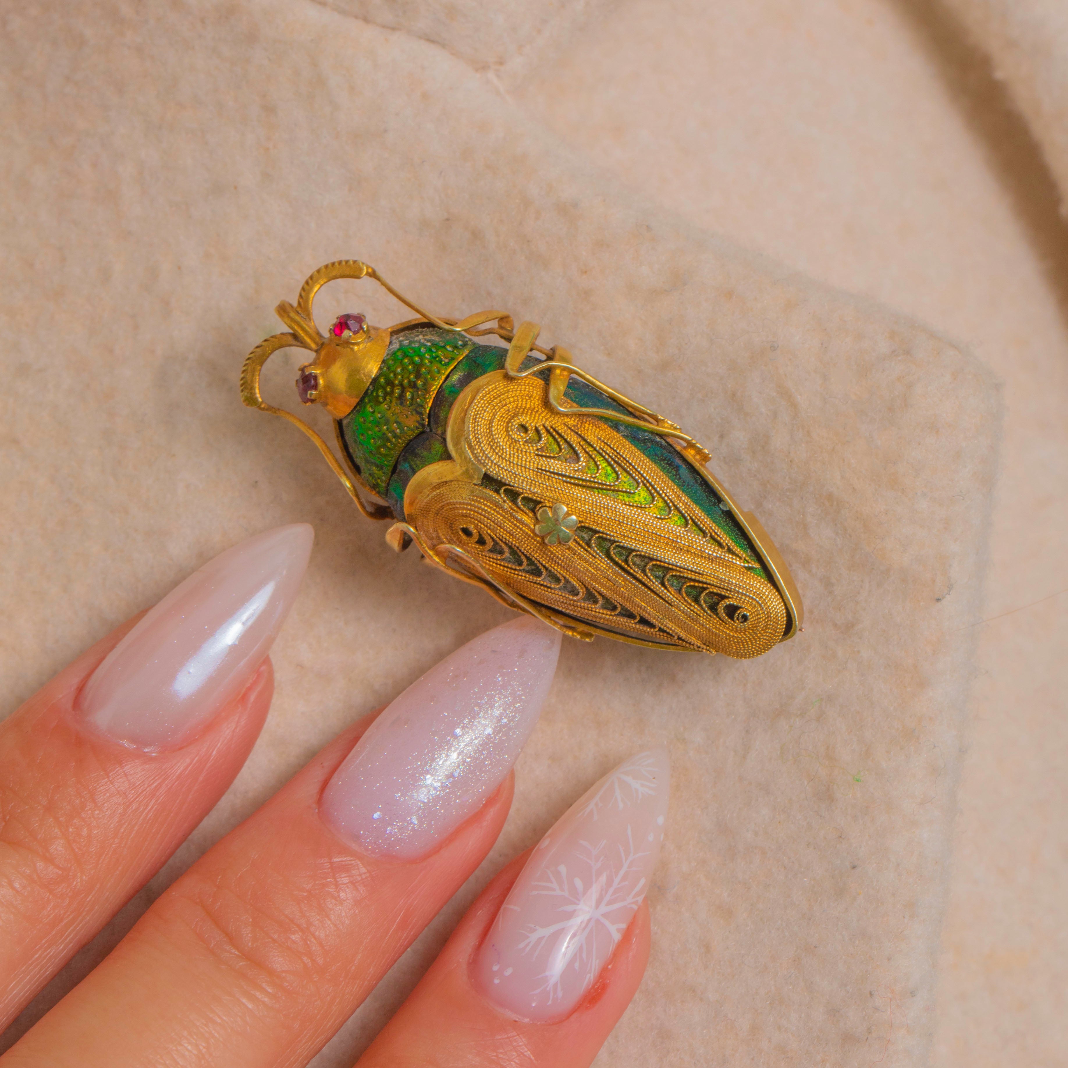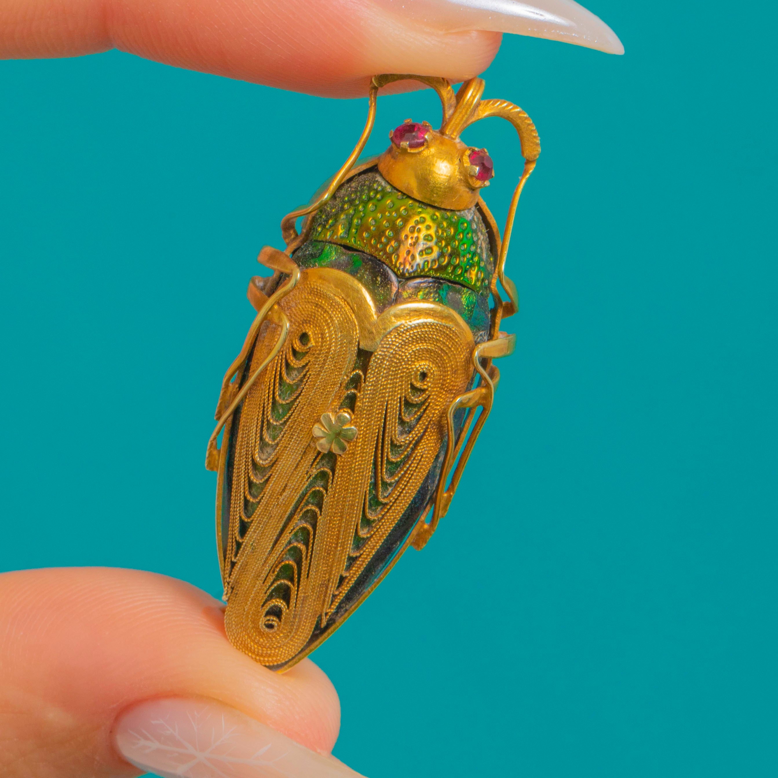 A rare Victorian cannetille “bug” brooch-pendant, alive with iridescent green body panels and exquisitely modelled legs and antennae. The wings are draped in fine applied cannetille wirework and S-scrolls that create a lace-like texture in warm Yellow Gold. Two petite, round stones—one Ruby and one Paste—gleam at the head for a mischievous, lifelike spark.