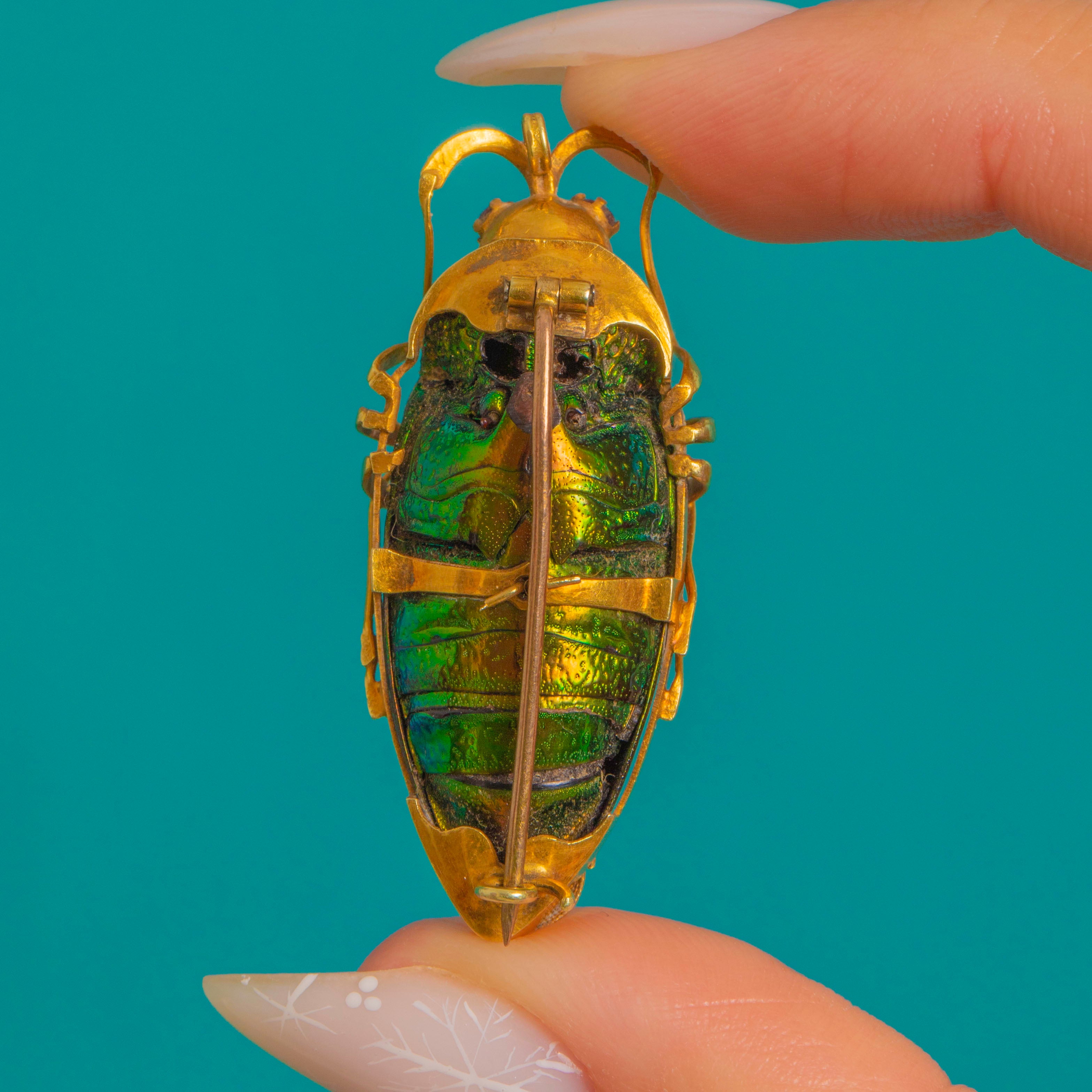 EXCELLENT: Stones are bright with minimal surface wear visible under magnification. The cannetille wirework is crisp and well-preserved with a pleasing light patina; the iridescent body panels are vivid. The brooch pin is secure and functioning, with only minor age-related darkening near the head noted.