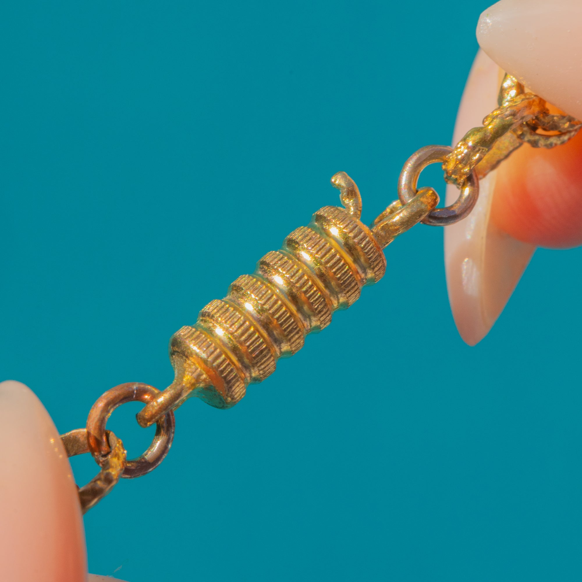 This striking Georgian longuard chain is crafted from gleaming Pinchbeck and displays the most beautiful warm golden tone. Measuring an impressive 44" long, it can be worn doubled or layered with other antique chains for a bold, statement look.