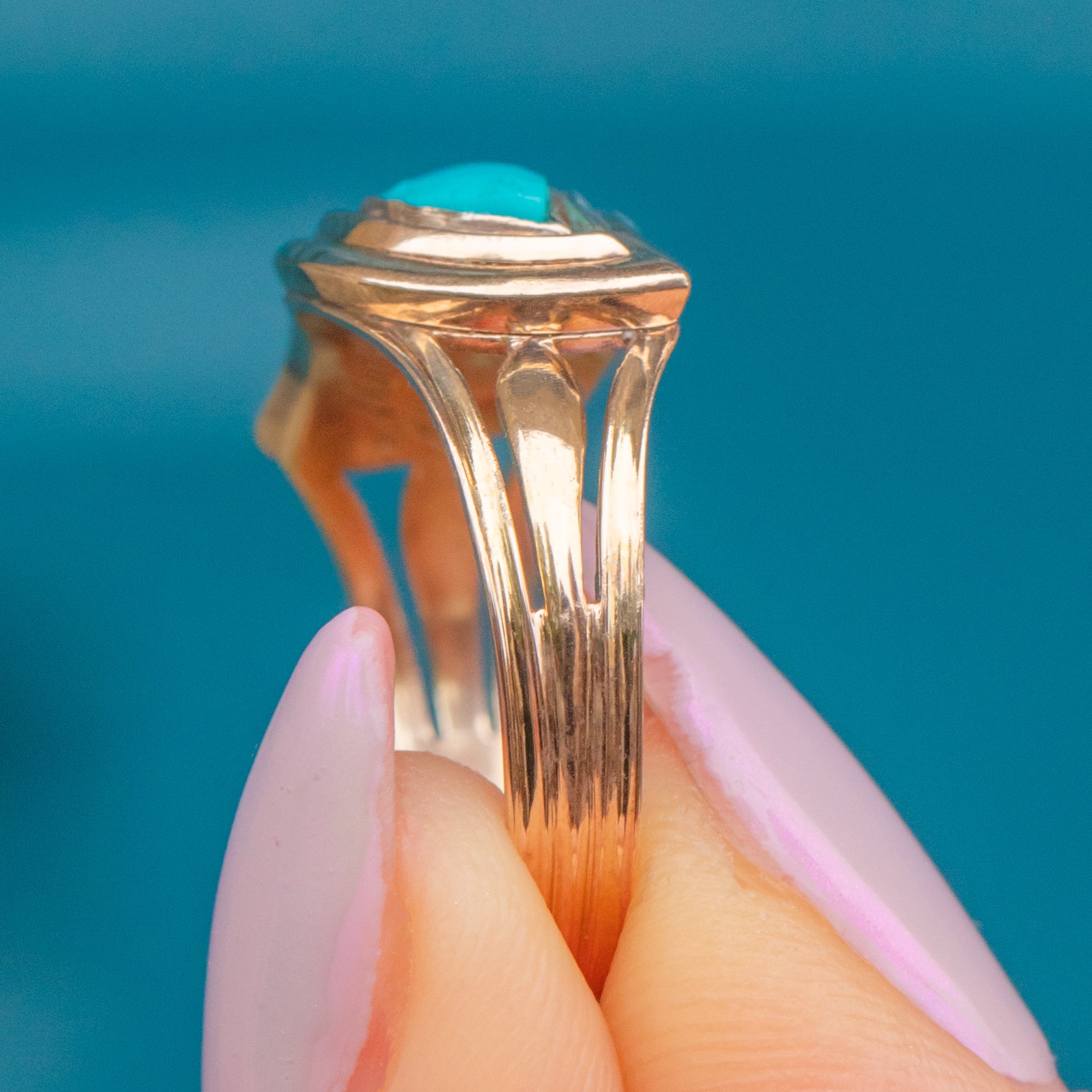 A touching are rare piece of Georgian history, this memorial ring is crafted in warm 12ct Gold and set with a beautiful curved eye-shaped Turquoise tablet. The vibrant sky-blue stone is bezel-set within an elegant, sculpted mount that curves smoothly around the finger.
