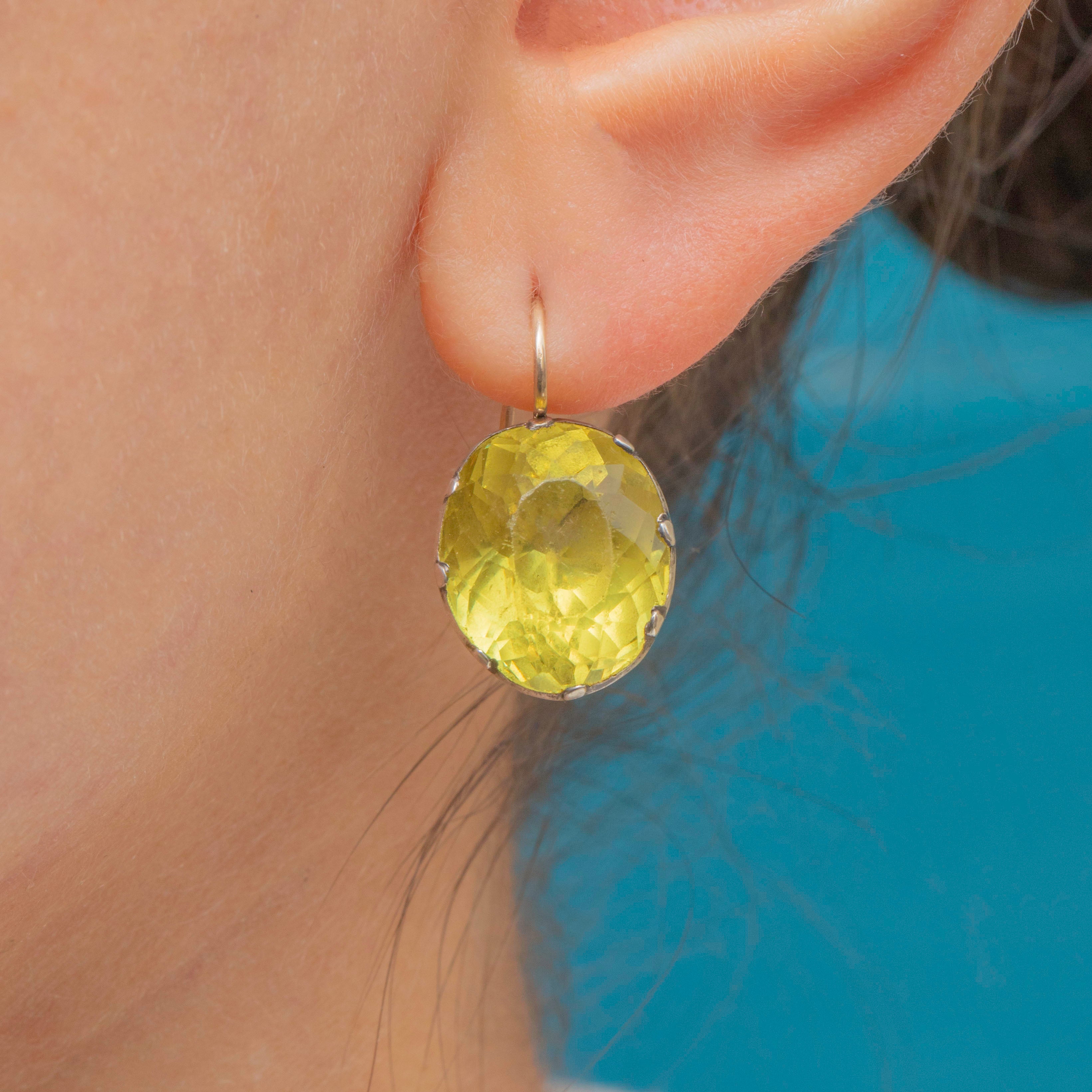 VERY GOOD: These rare Georgian Chartreuse green Paste button earrings are in very good condition. The Paste are brightly saturated and their foils show no signs of wear. Each Paste has been expertly faceted, and although there are some mild abrasions to some of the facets, these are only noticeable under close inspection and do not impact their sparkle. The Silver is lustrous, with only some minor spots of discoloration and dings commensurate with age, and each Paste is securely held in place. The Gold hooks are slender and firmly soldered, allowing you to show off these phenomenal antique Paste earrings with absolute confidence!
