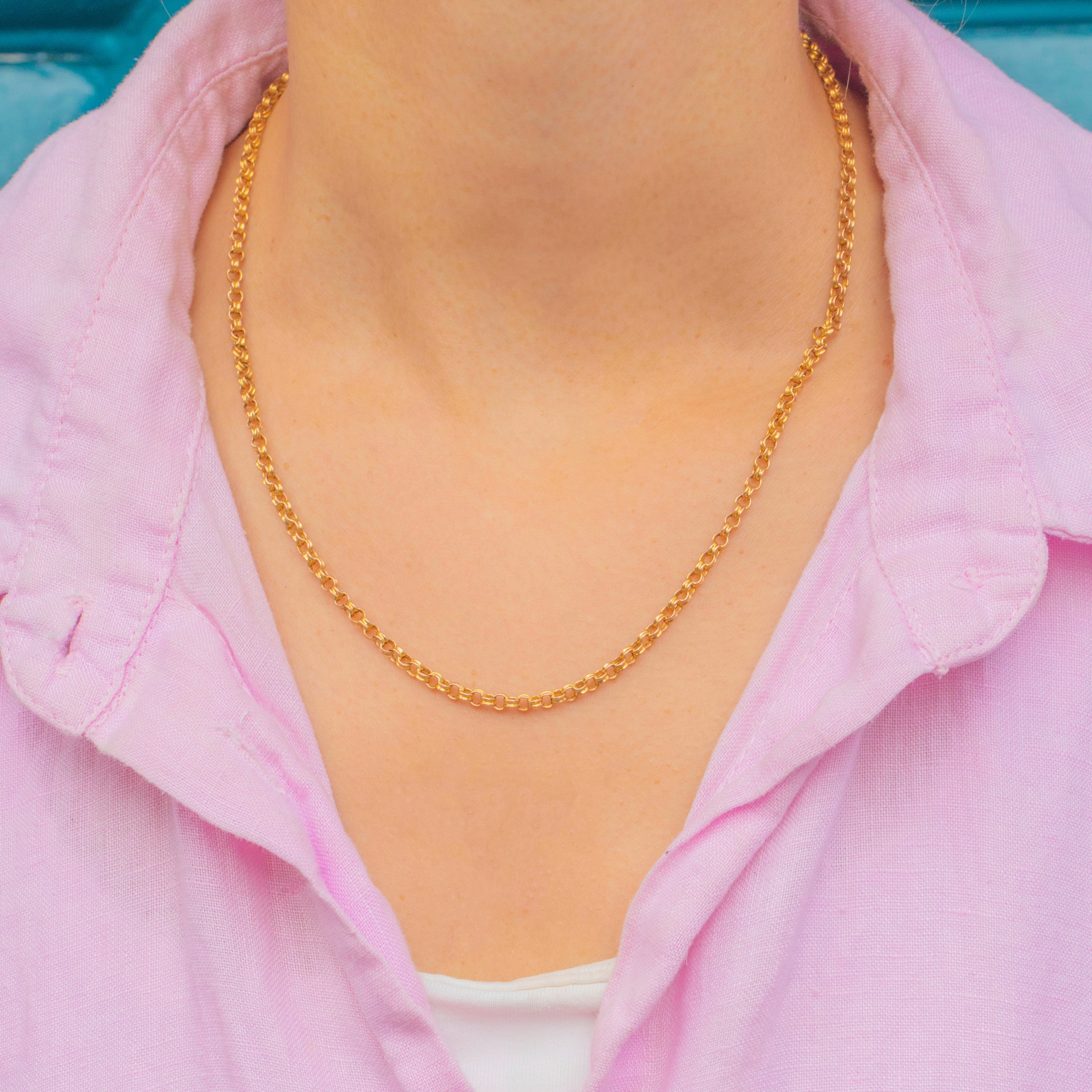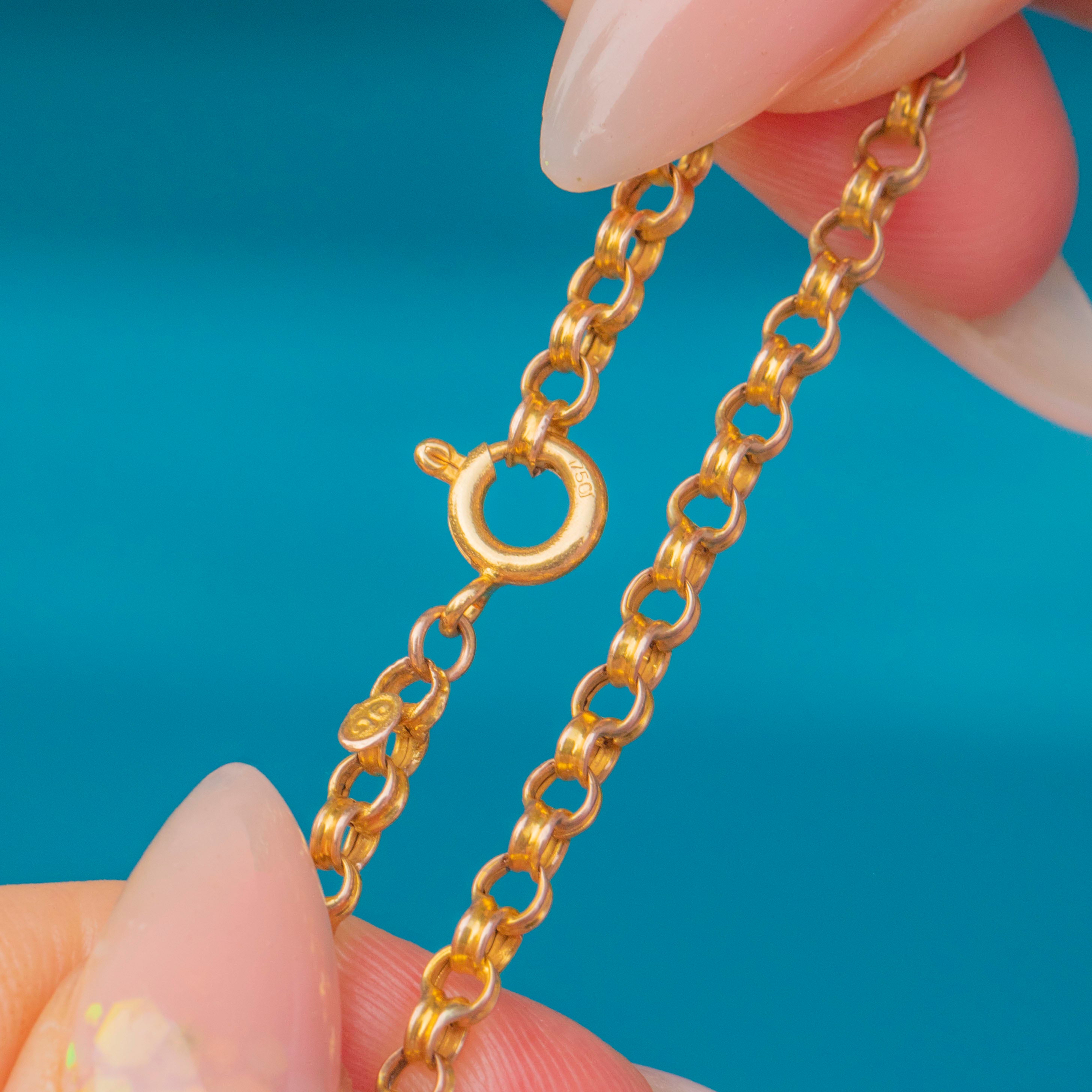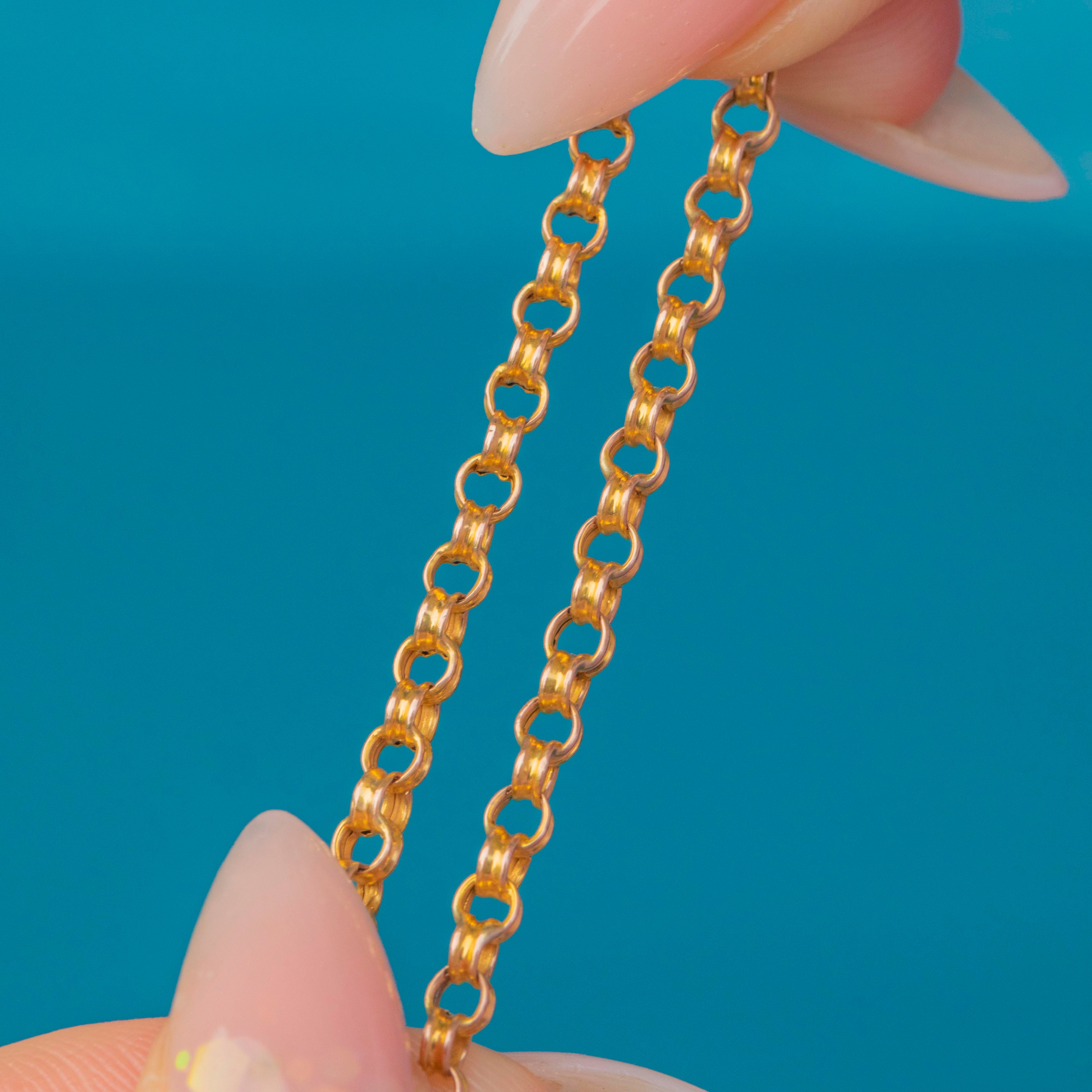 This antique Victorian chain is crafted in buttery bright 9ct Yellow Gold. Measuring 16" in length, the links are a versatile 3mm wide, giving a beautiful balance between delicacy and substance. Perfect for pairing with pendants, lockets or charms, it’s a wonderful staple piece for any antique jewellery lover.