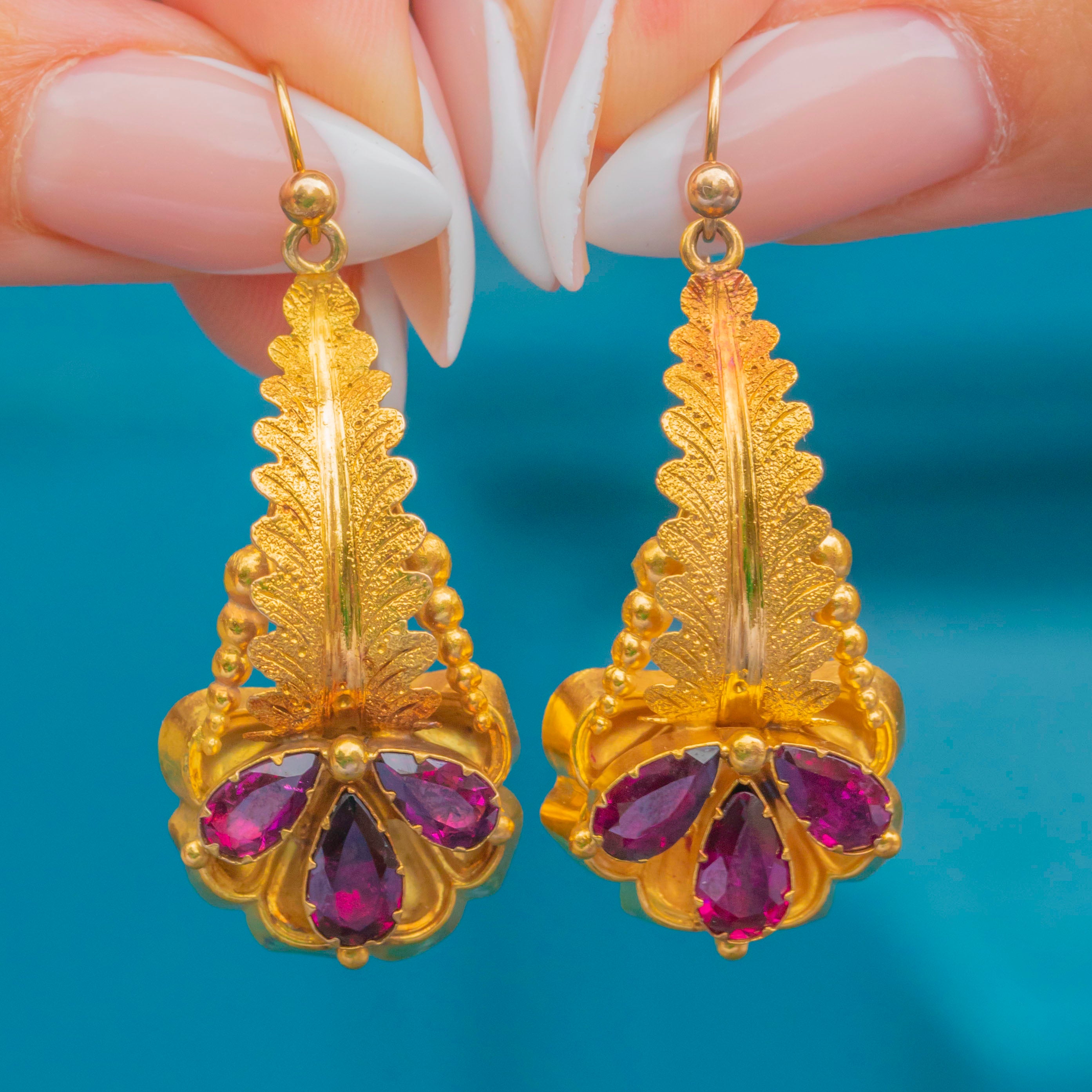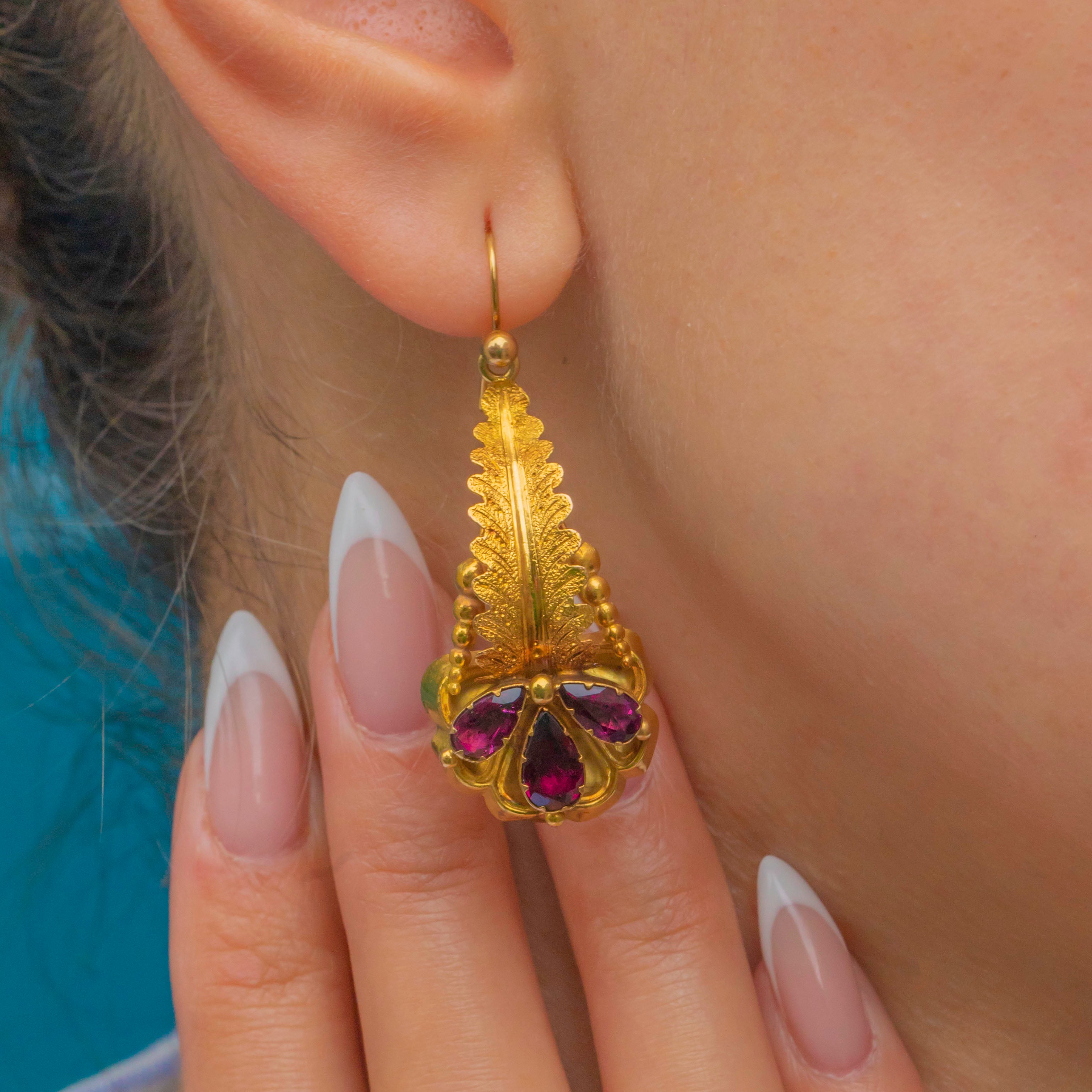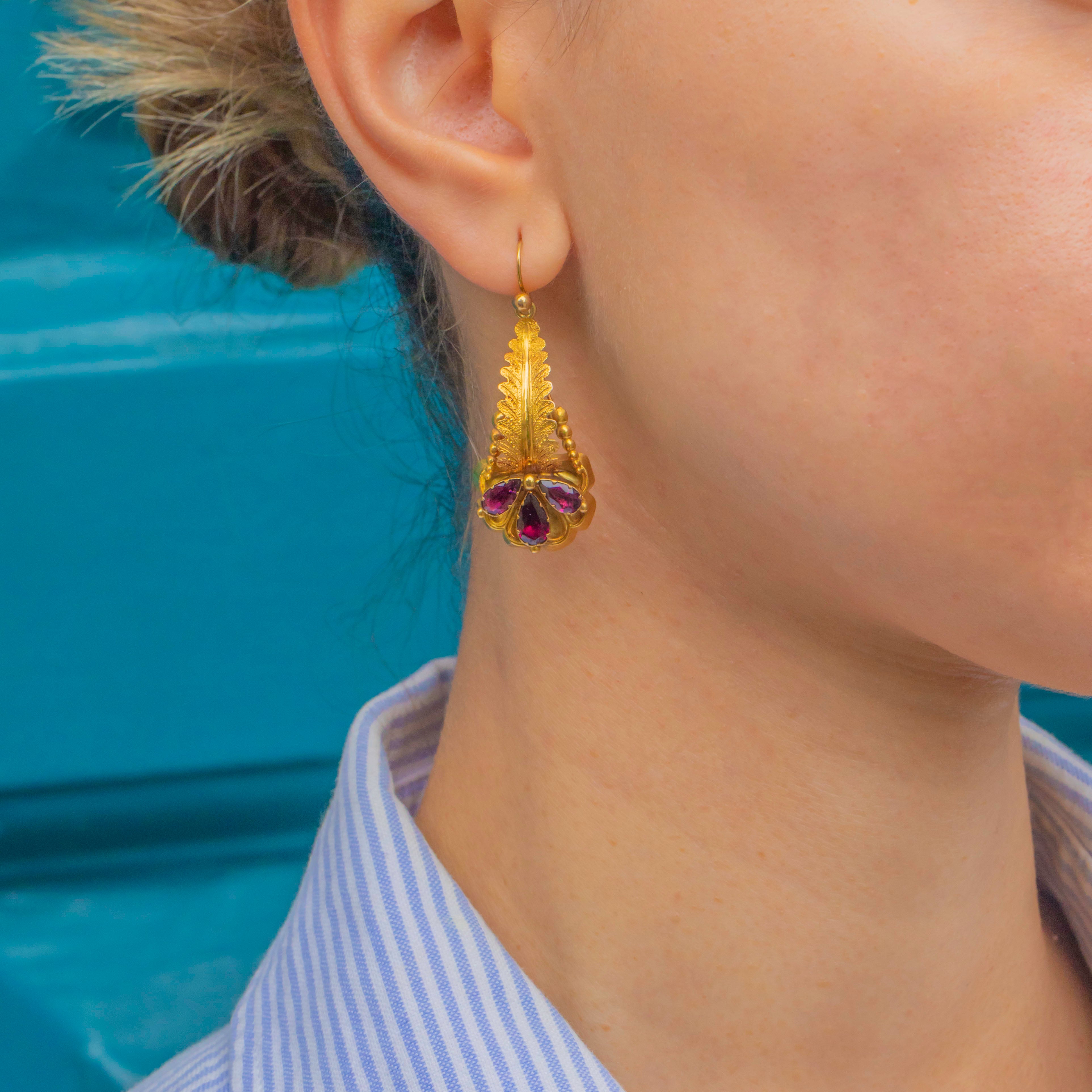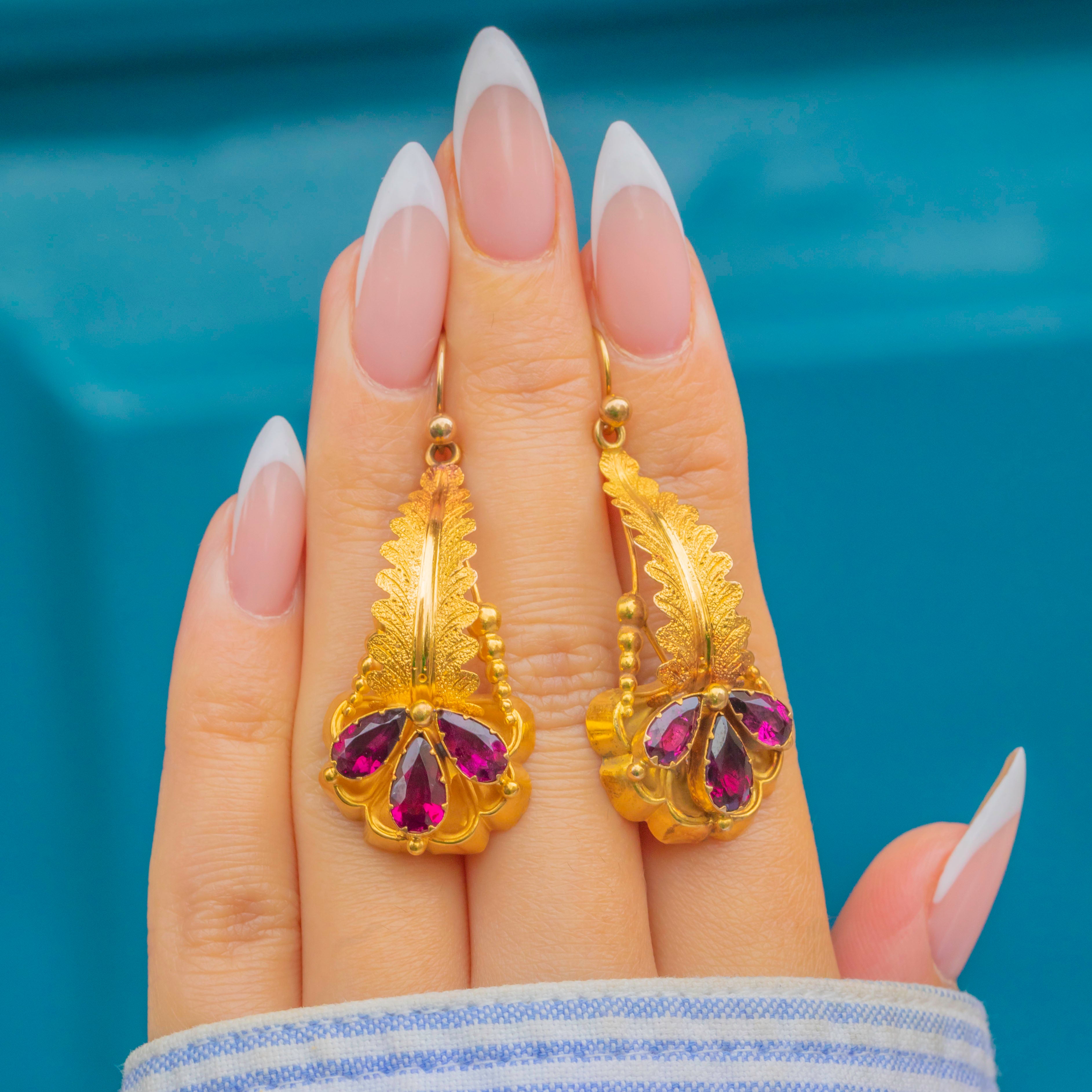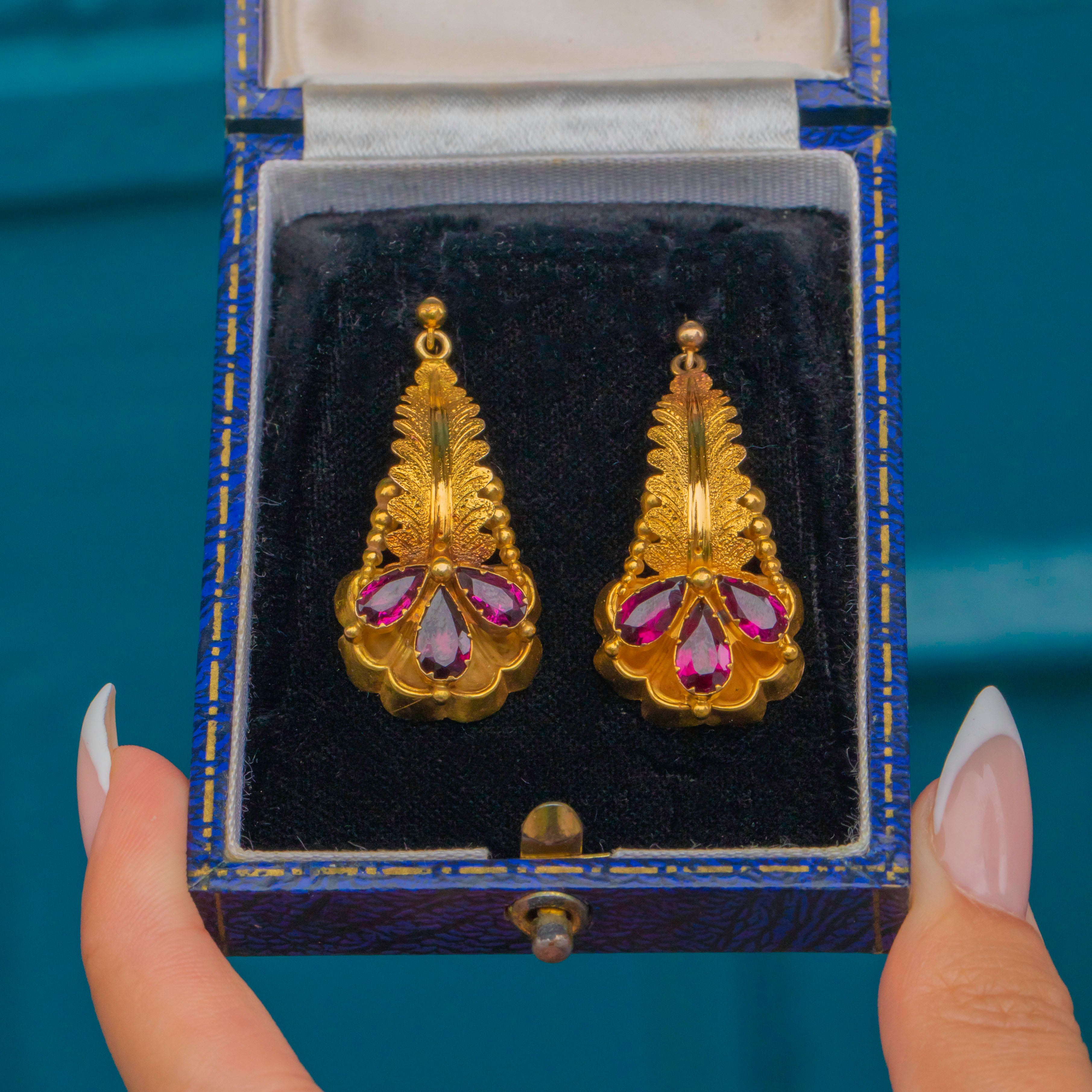 Victorian elegance with a vibrant flourish, these 15ct Gold flower drop earrings glow with rich raspberry-red Garnets. Each drop is arranged with pear-cut Garnets forming a stylised blossom, set beneath a beautifully detailed foliate top for that quintessential 19th-century romantic look.