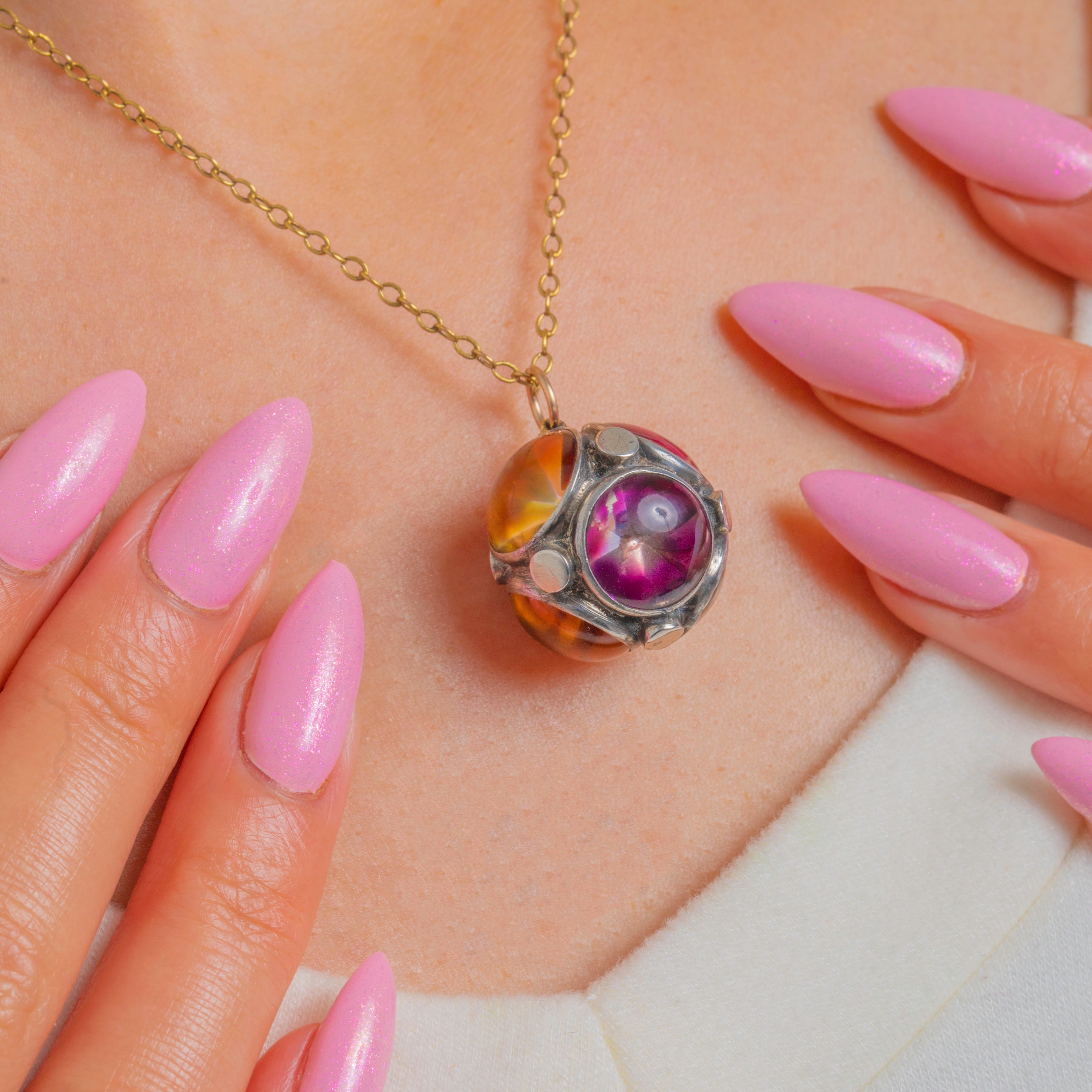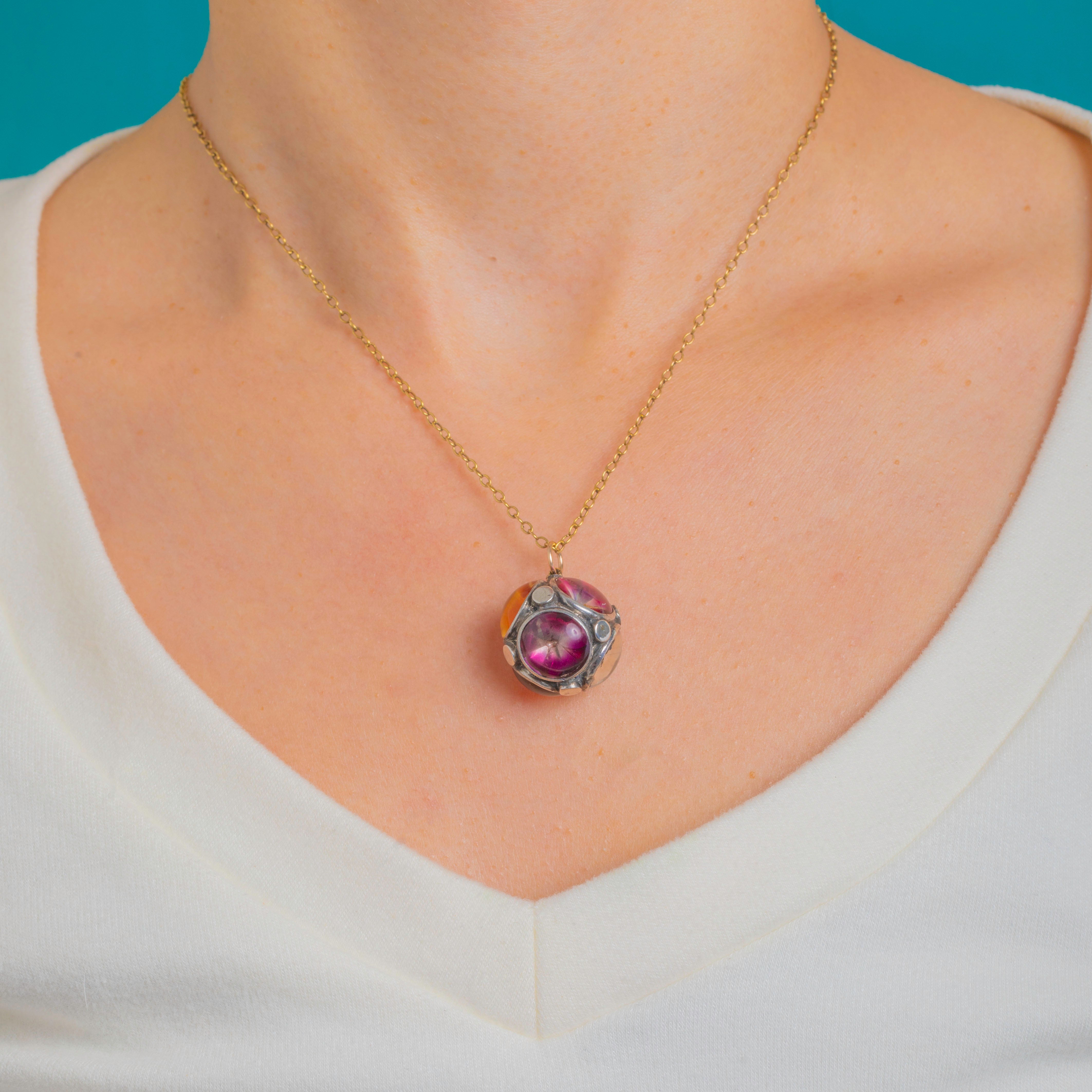 A rare Victorian orb pendant crafted in Sterling Silver and set with foiled cabochons of Amethyst, Citrine and Rock Crystal. The sculptural, multi-panel sphere is defined by raised closed-back bezels and neat applied disc accents, creating a bold, architectural silhouette with captivating colour play.