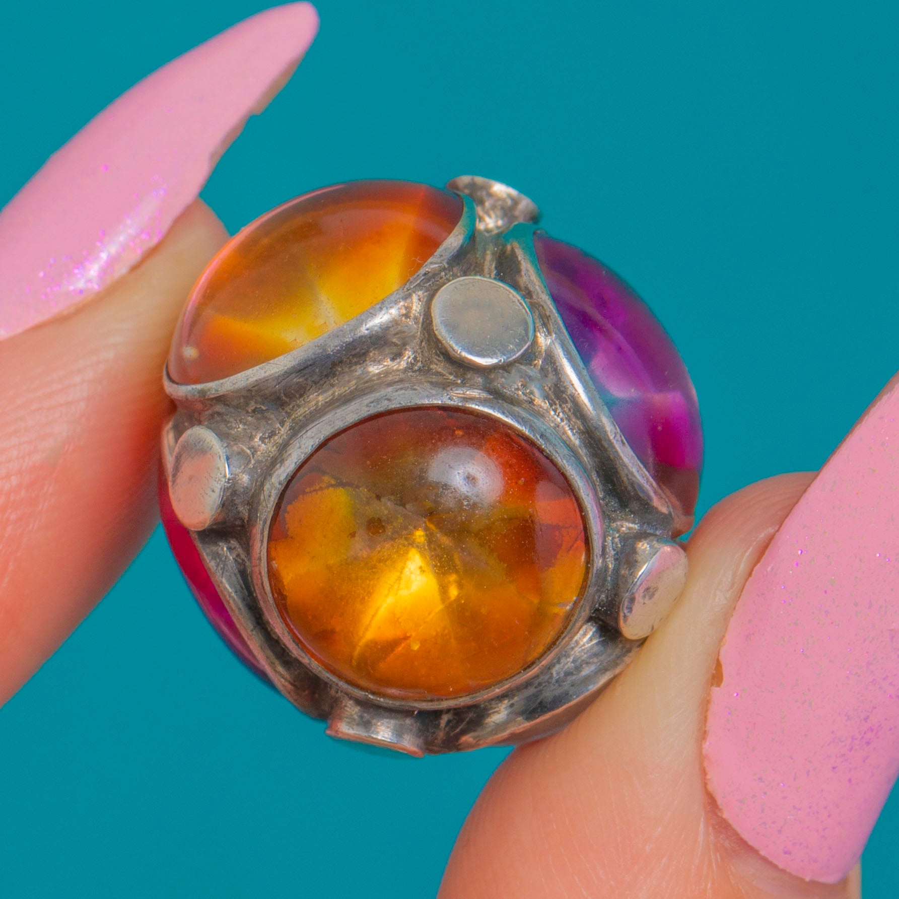 EXCELLENT: The foiled cabochons are bright and glowing with no chips and only light age-related surface wear. The settings are secure and well-preserved, with a pleasing natural patina to the Sterling Silver. A gentle, dappled gradient to the foiling is present, whether original or developed over time.
