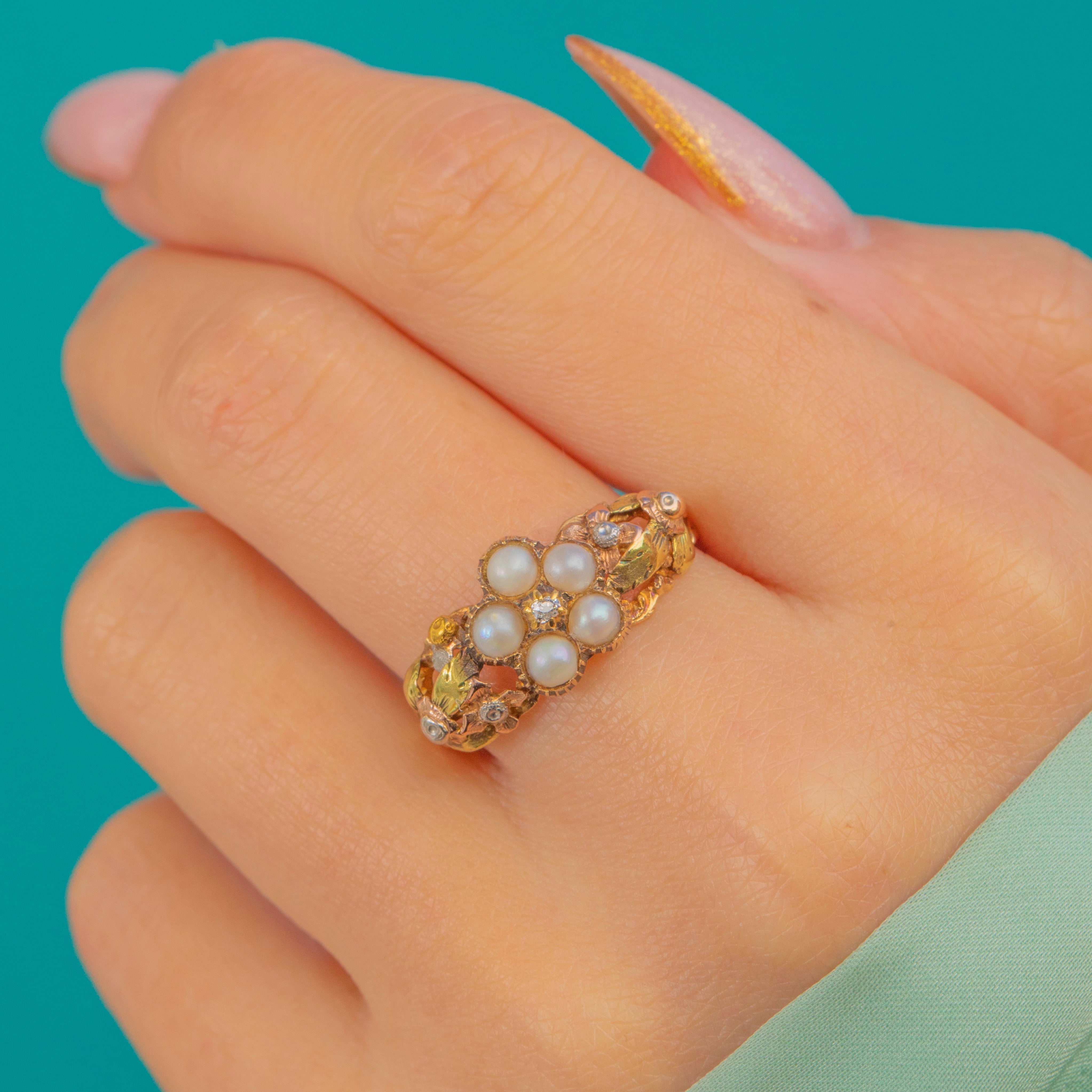 A beautiful early 19th-century cluster ring from the late Regency Georgian era, c.1830. Crafted in rich 18ct Gold with both Rose and Yellow tones, it features a romantic Pearl cluster centred by a tiny antique Diamond. The soft glow of the Pearls and the warm antique Gold give this ring a delicate, refined presence typical of Georgian jewels.