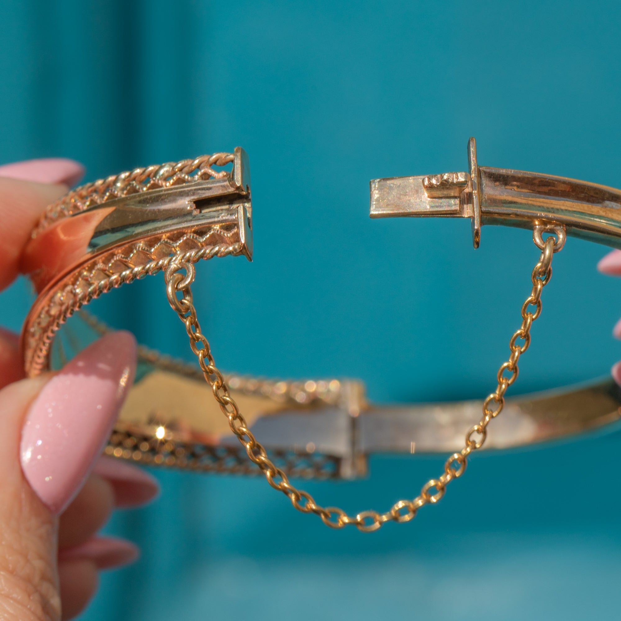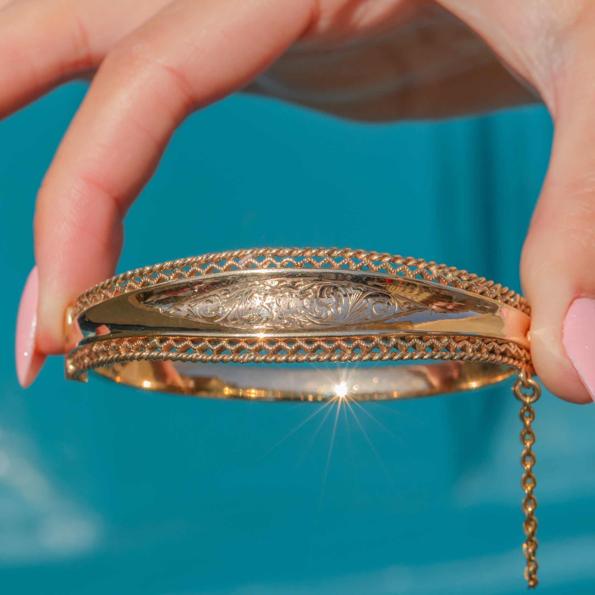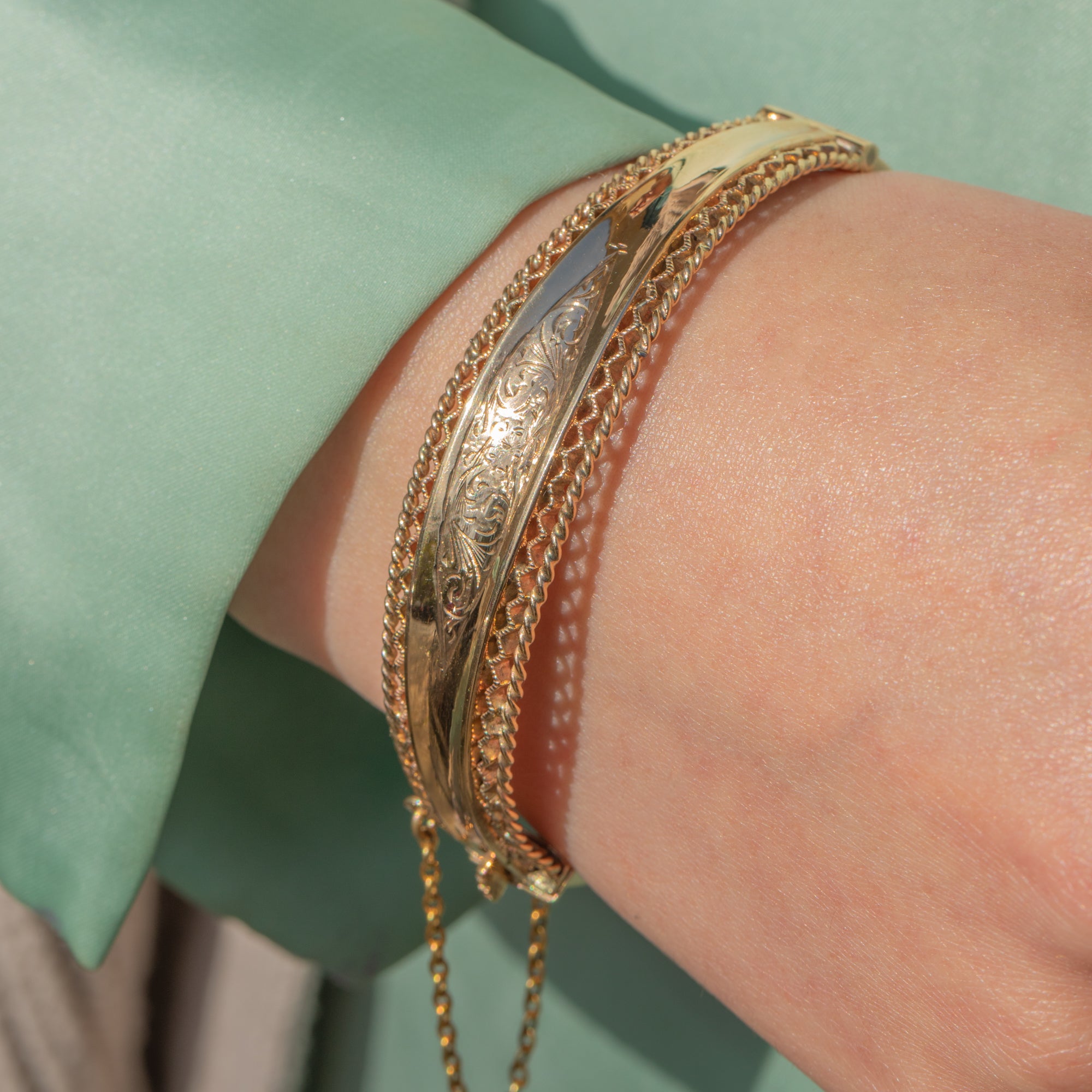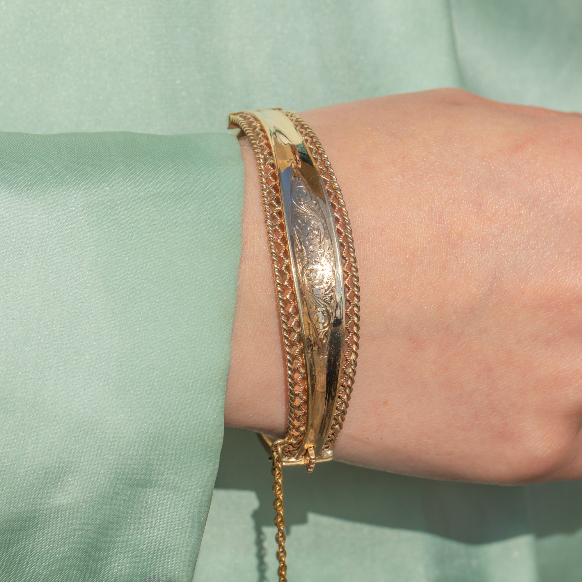 EXCELLENT: This solid 9ct Gold engraved bangle is in excellent condition. The Gold is bright and buttery and the details have all remained defined. The inside of the bangle is smooth providing comfortable wear, and besides some very mild surface wear commensurate with age, this vintage Gold bangle has been wonderfully preserved. The hallmarks are crisp and clear and the bangle closes securely, with the additional safety chain promising confident wear. This authentic piece of mid-century jewellery is ready to be worn and enjoyed!