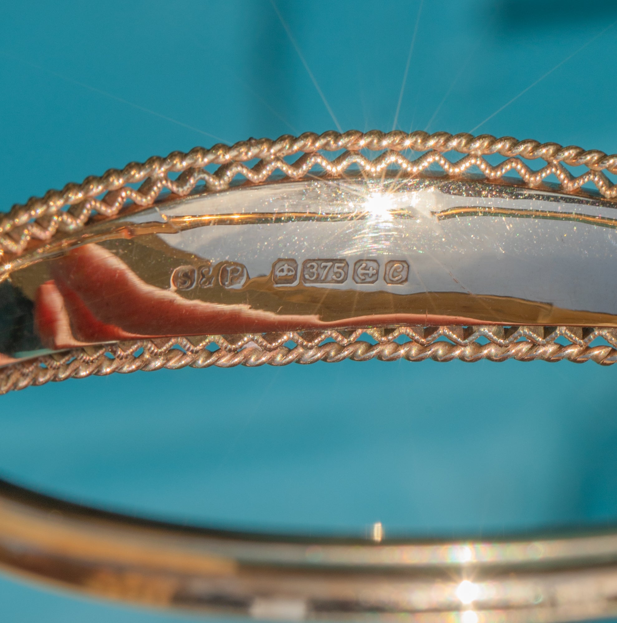 This solid 9ct Gold engraved bangle is a delightful piece of wrist candy! Exquisitely crafted from sumptuous 9ct Gold, this ornately decorated vintage bangle boasts a floral engraved centre framed by textured rope borders that gleam in the light.