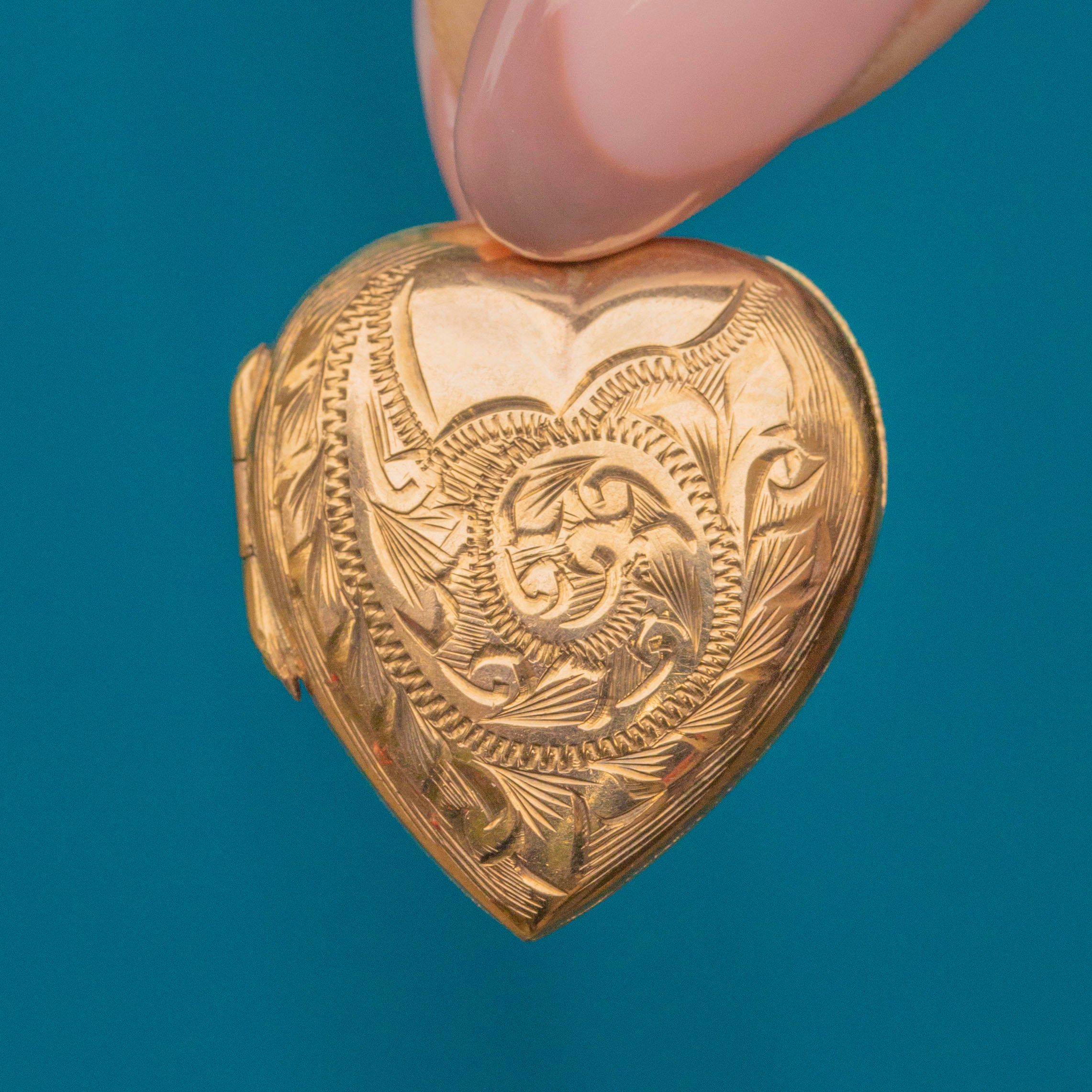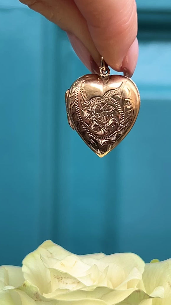 VERY GOOD. This 9ct solid Gold engraved heart locket is in very good condition. Her Gold is lustrous and the engraved details have remained crisp. She requires a firm push to open, however, she is in good working order allowing for confident wear. A gorgeous piece, this Vintage 9ct Gold locket would make a thoughtful gift choice or a wonderful treat for your self!