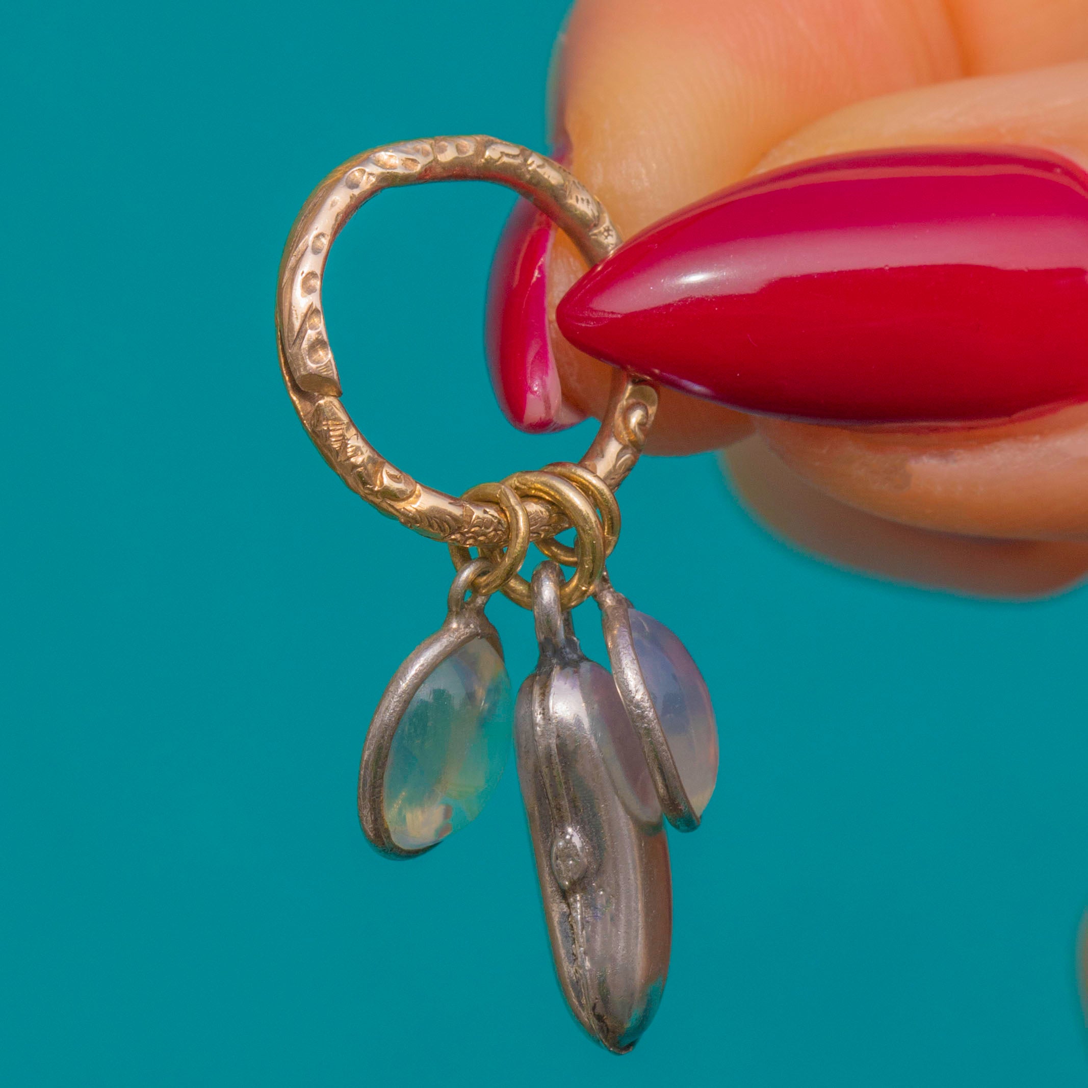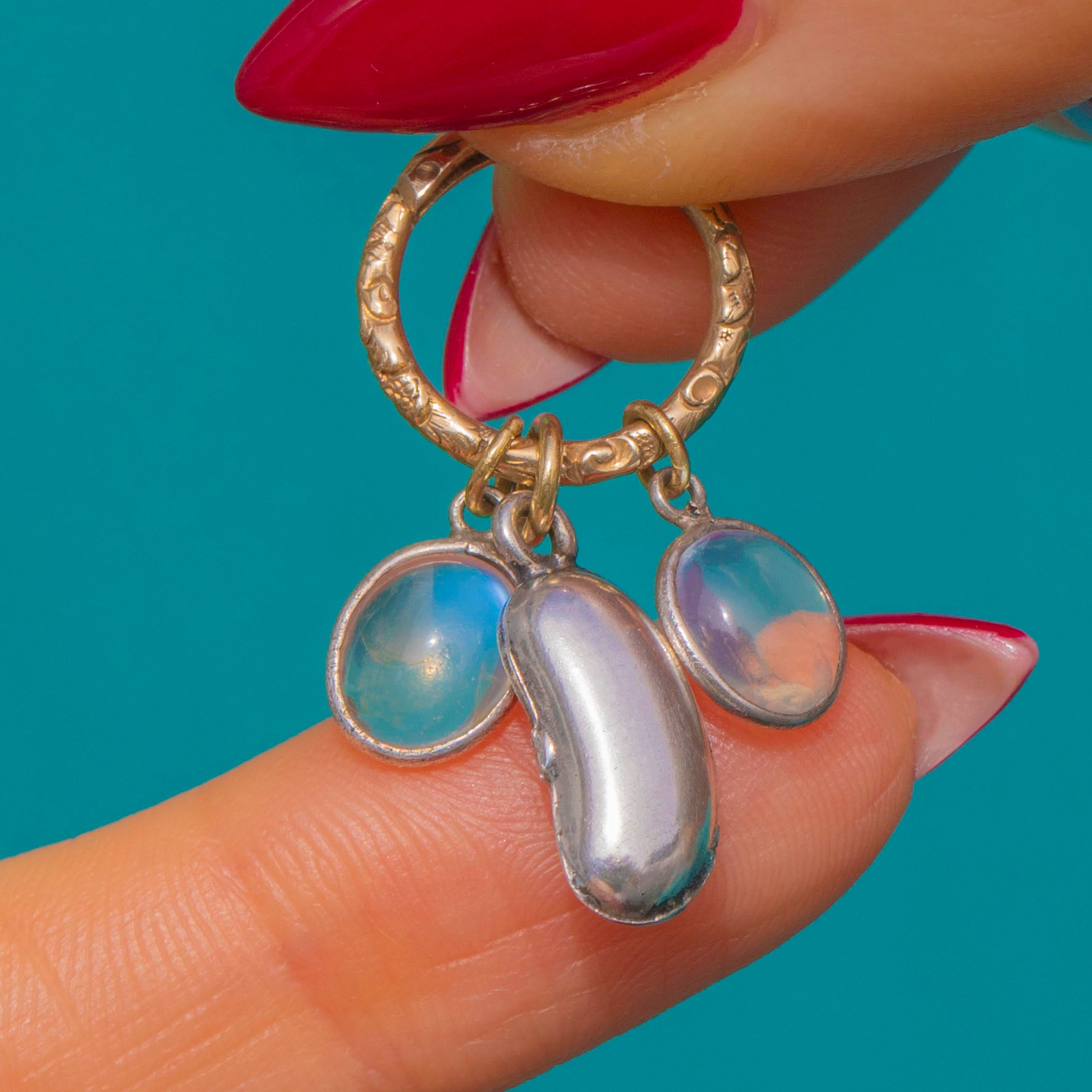 A tactile antique charm trio composed of a Georgian 9ct Gold split ring hosting two luminous Victorian Moonstones and a sleek Victorian Silver lucky bean. The warm, textured Gold is beautifully offset by cool Silver, while the Moonstones glow with soft adularescence, lending delicate movement and light with every turn.