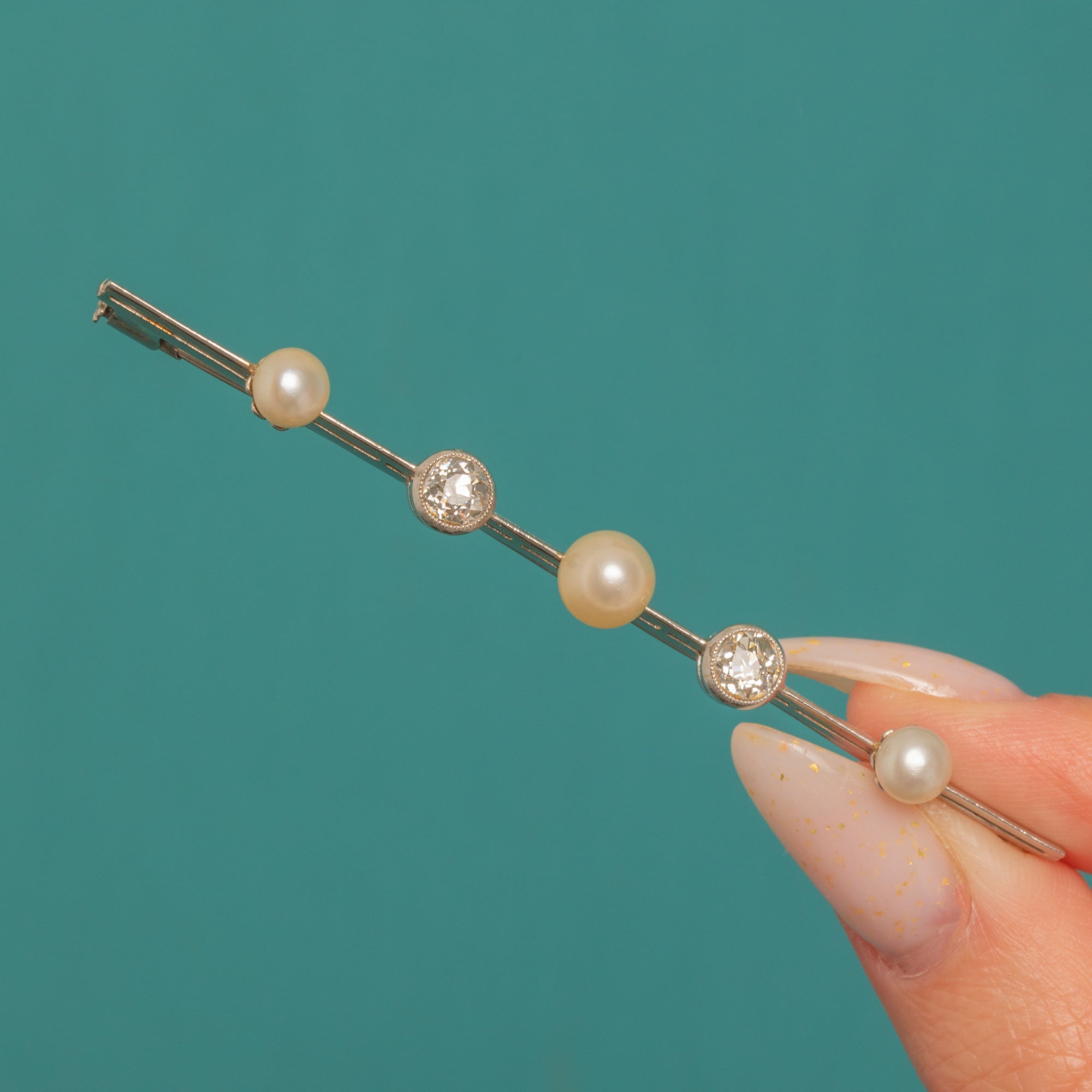 A refined Edwardian bar brooch in luminous Platinum, set with a graceful rhythm of Pearls and Old Mine Cut Diamonds. Two scintillating Diamonds, with a combined weight of approximately 1.20ct, alternate with creamy Pearls along the slender double-rail bar, while delicate milgrain edging around the collet-set Diamonds adds a whisper of texture and light.