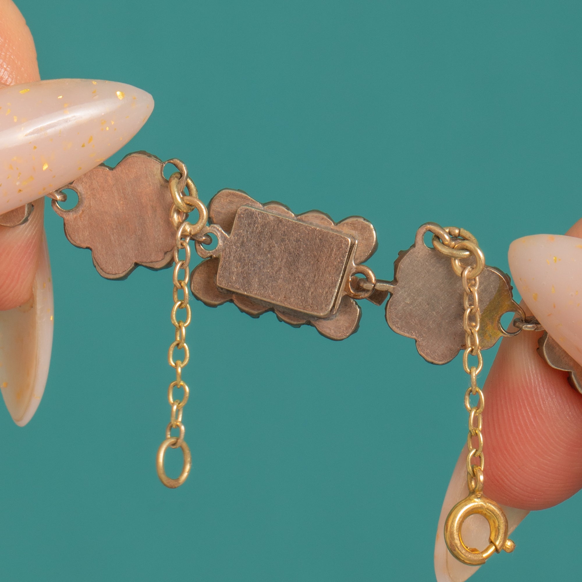 MATERIALS: Tests as Garnet Gold, 9ct Gold safety chain, Garnet.
