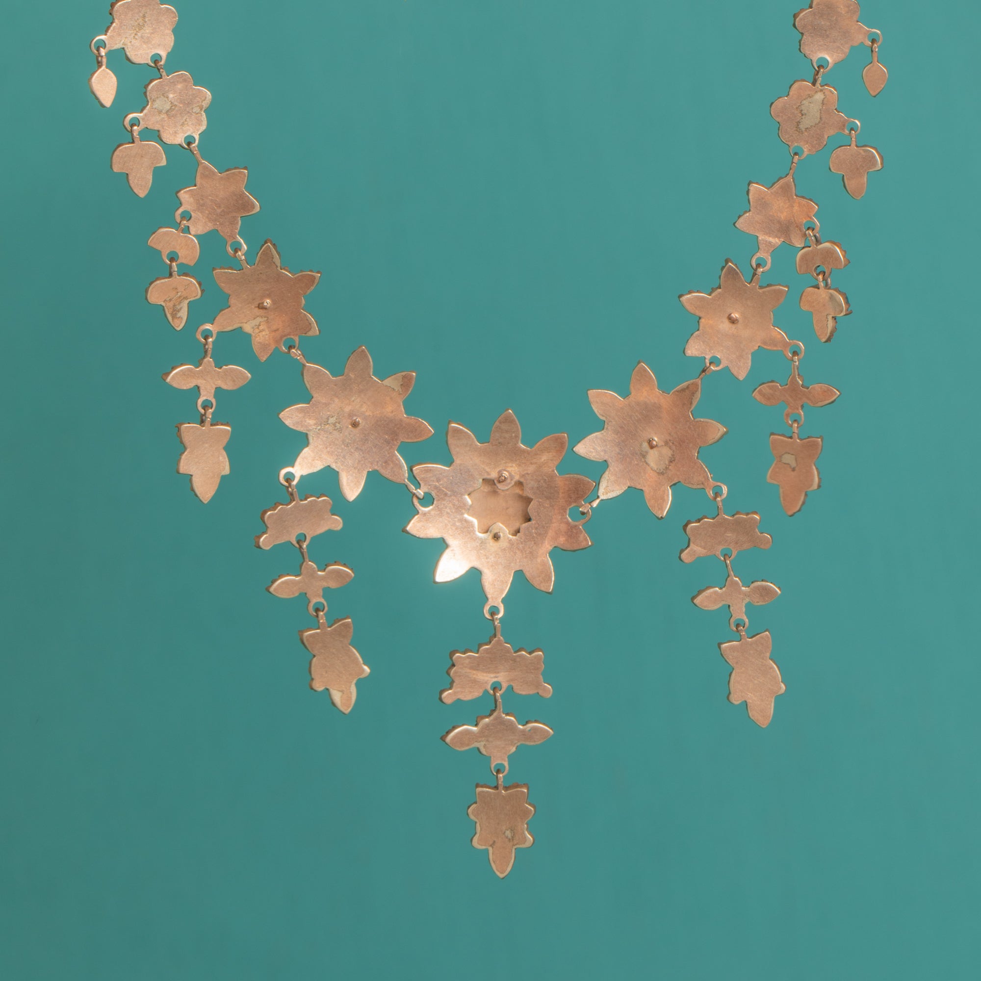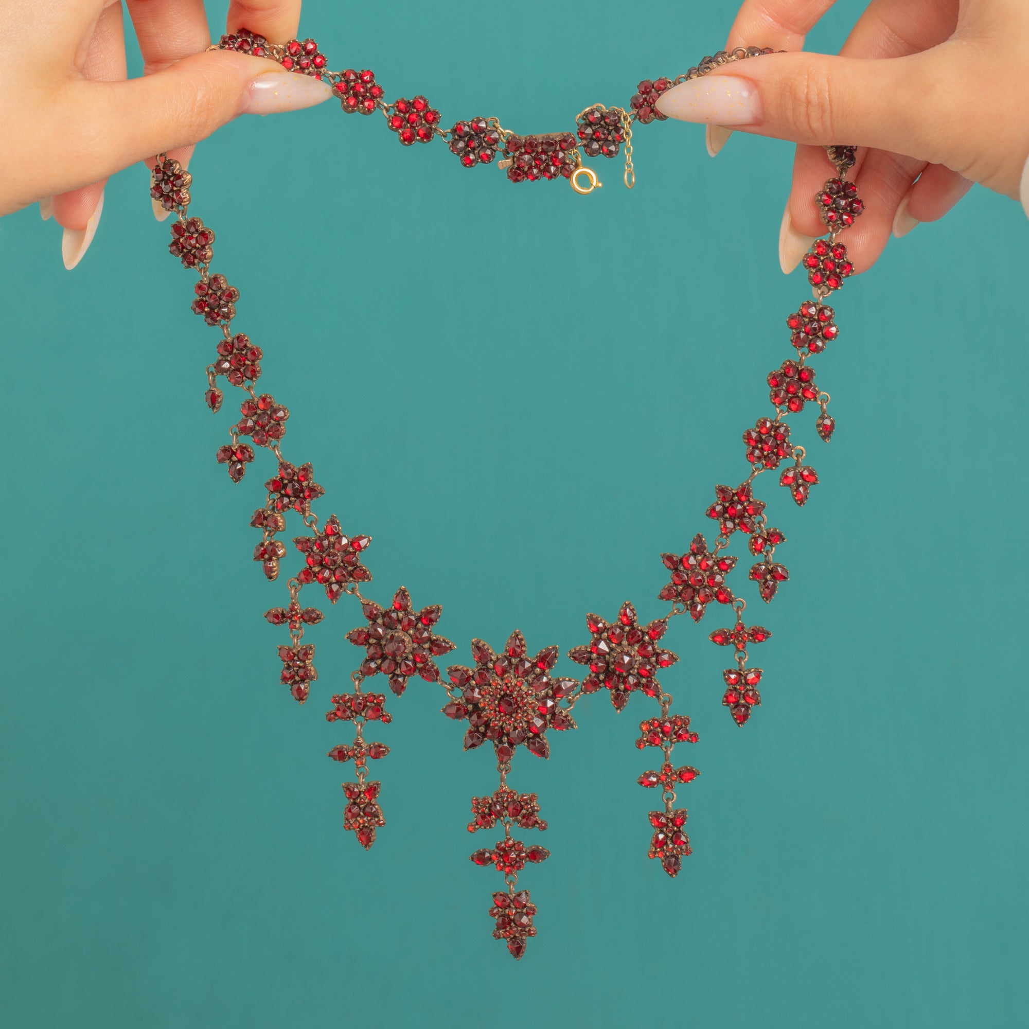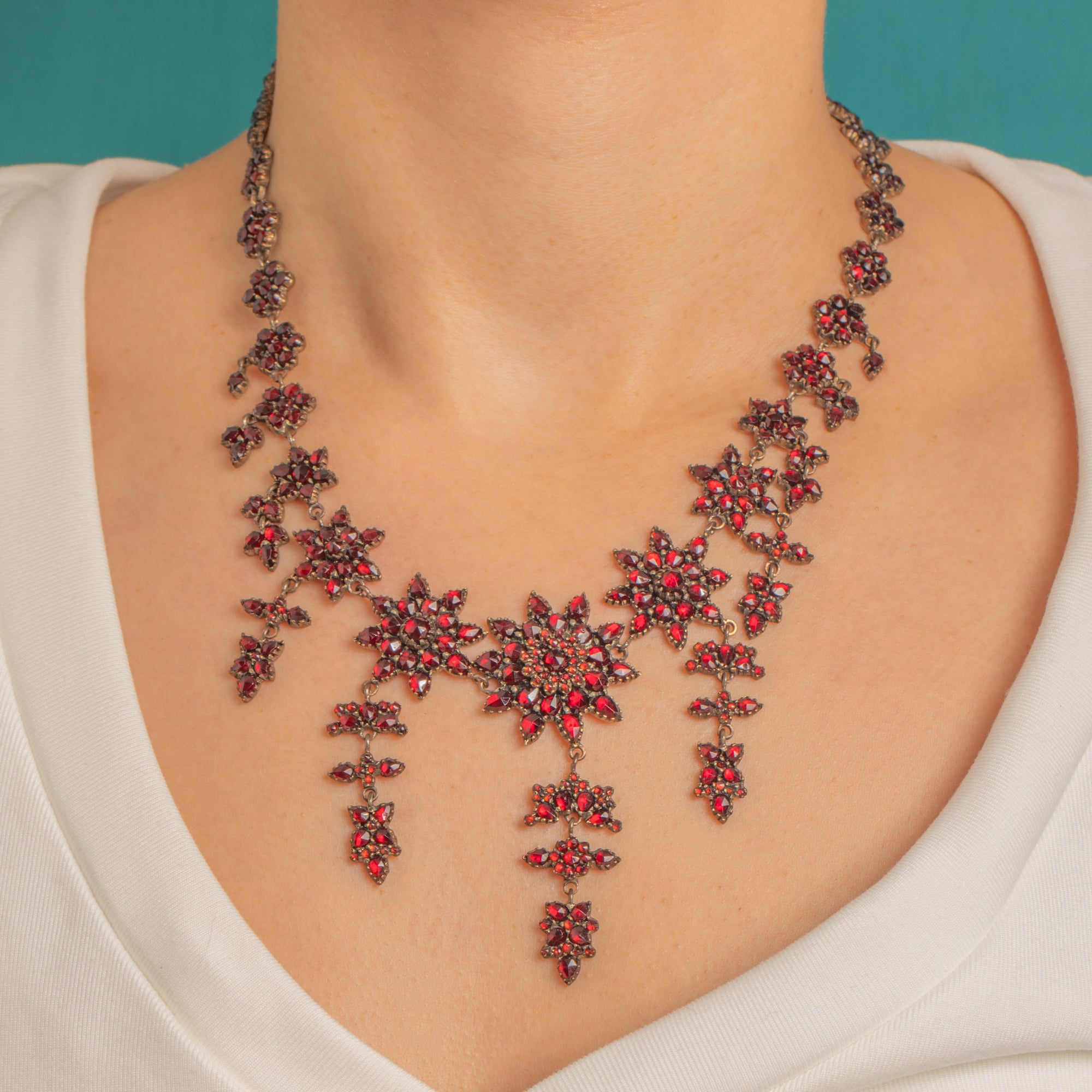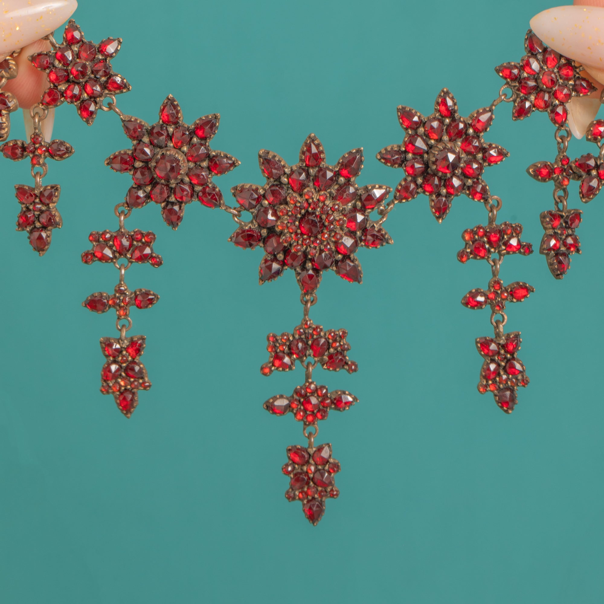 A spectacular Victorian Bohemian Garnet stars necklace, c.1890, alive with a constellation of starburst and rosette clusters that drape fluidly along the neckline. Dense pavé-style Garnet settings culminate in a graduated central girandole of three elegant drops, creating a richly decorative, collar/princess-length silhouette with dramatic Victorian allure.