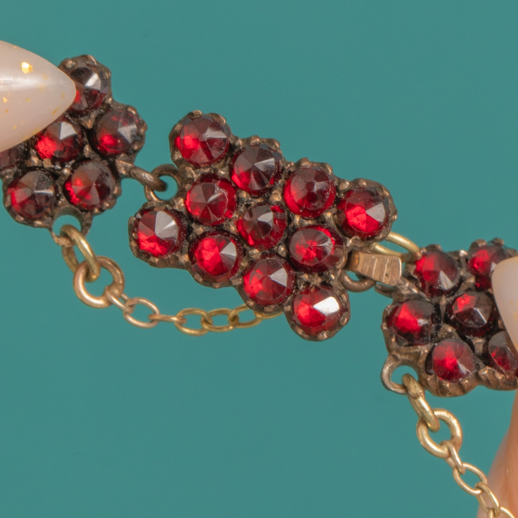 The settings are closed-back collets typical of late 19th-century Bohemian Garnet work. The metal tests as Garnet Gold, complemented by a 9ct Gold safety chain for added security. A sympathetic antique patina enhances the deep, saturated red of the faceted Garnets, bringing warmth and intensity to every facet.