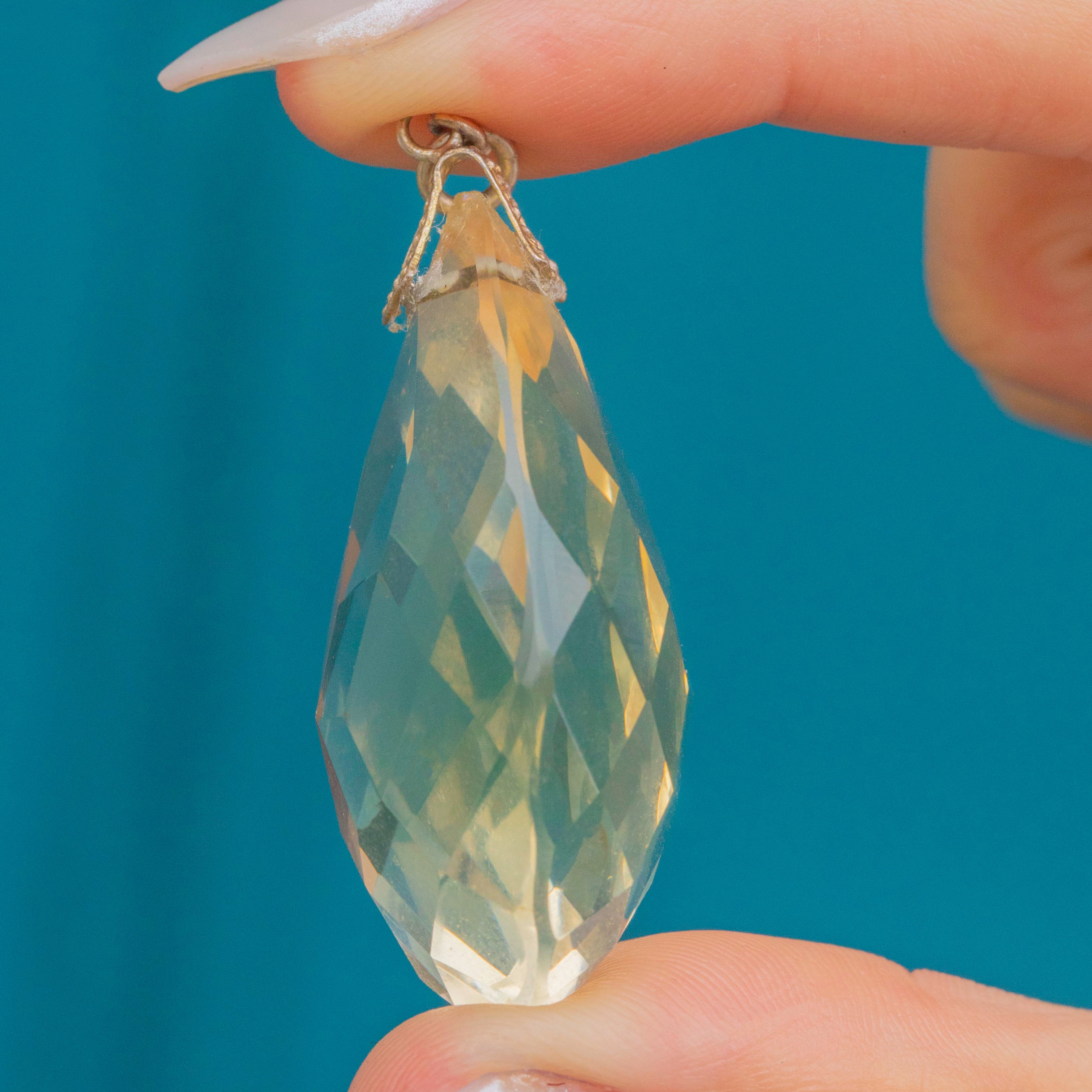 GOOD-VERY GOOD: The Citrine is immaculate, with crisp facets and no chips or abrasions to note. The bale has been repaired with glue at some point and was likely once gilded with Gold. The jump ring is securely soldered, allowing you to wear this vintage Citrine pendant with confidence!